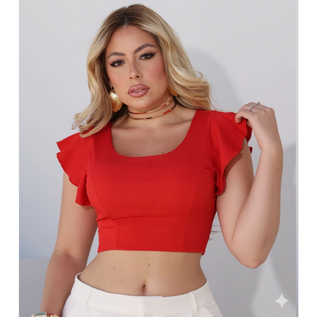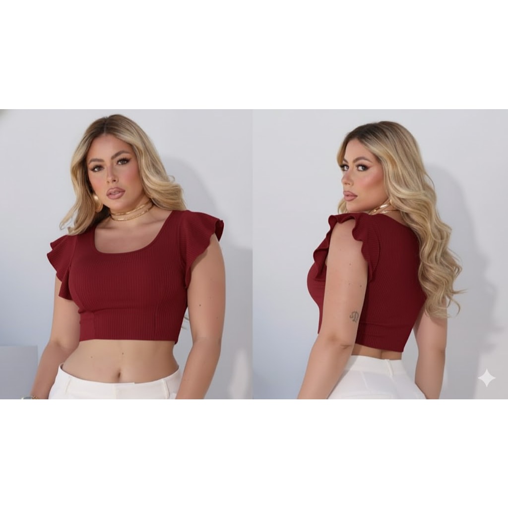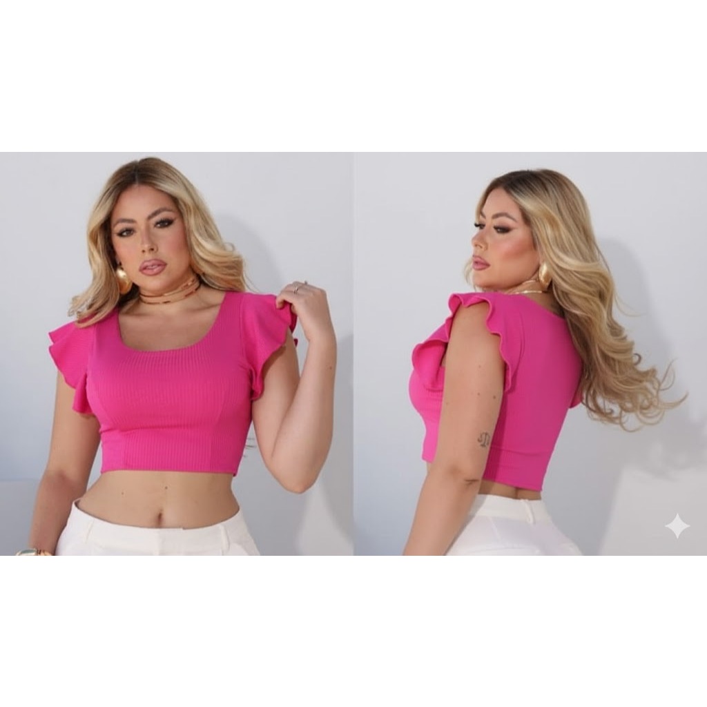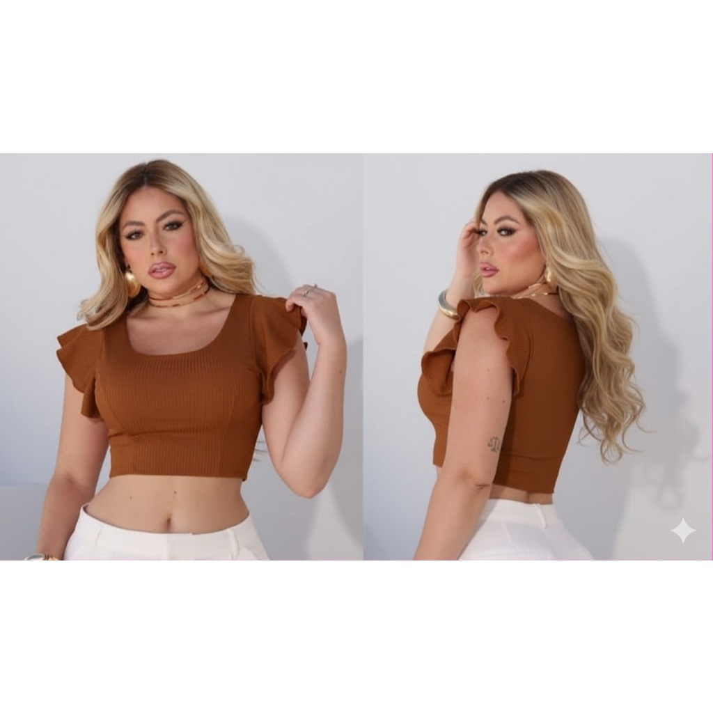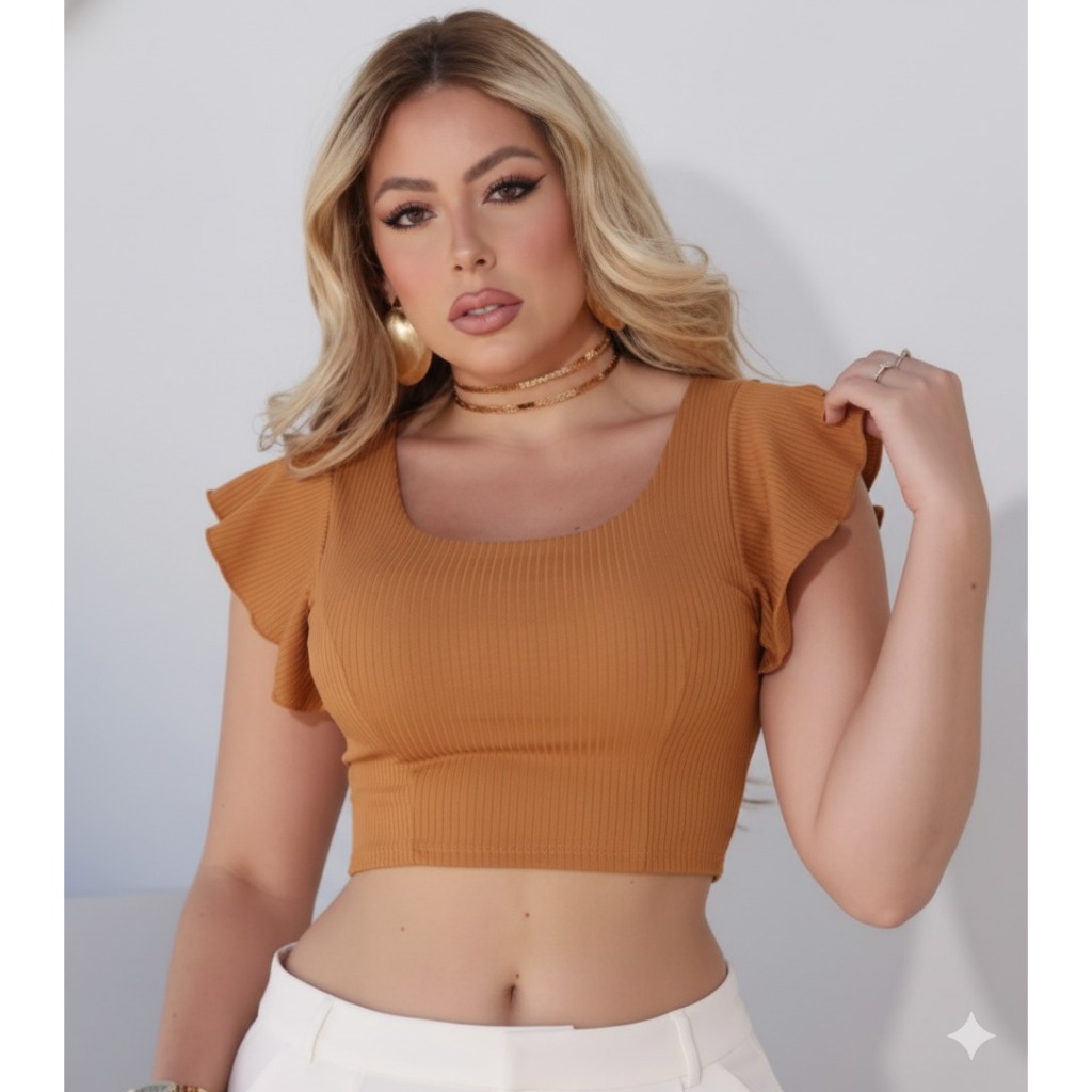 cropped canelado manga curta babado