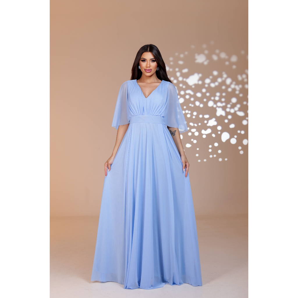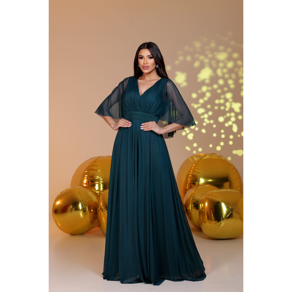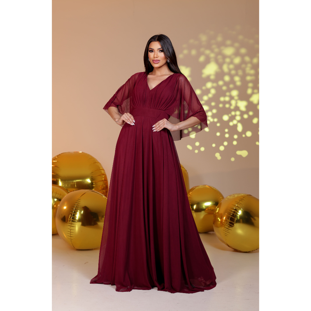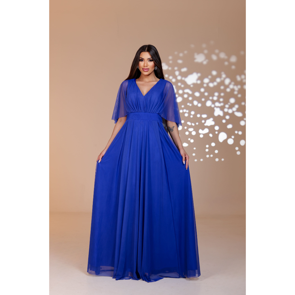 Vestido Lety de Tule com Manga Capa para Festas, Casamentos e Madrinhas