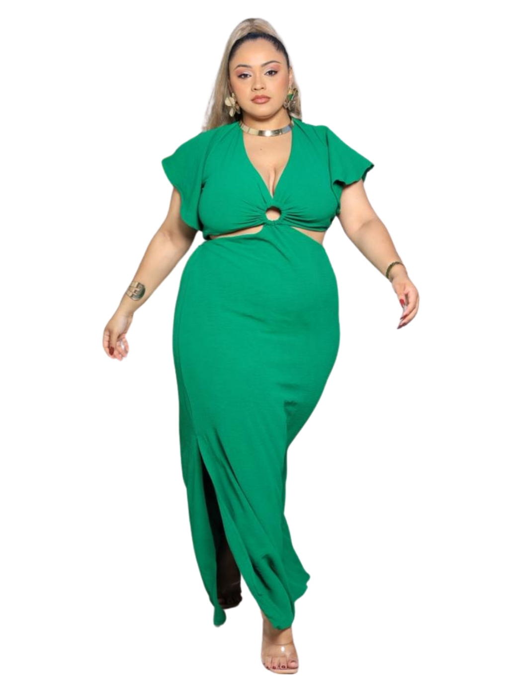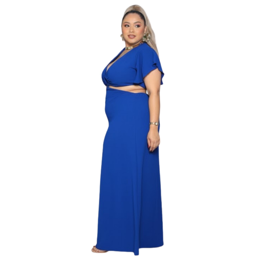Vestido Longo Manga Babado Fenda lateral Decote Gola V Tecido Duna Elastico Costas e Cintura- G1 G2