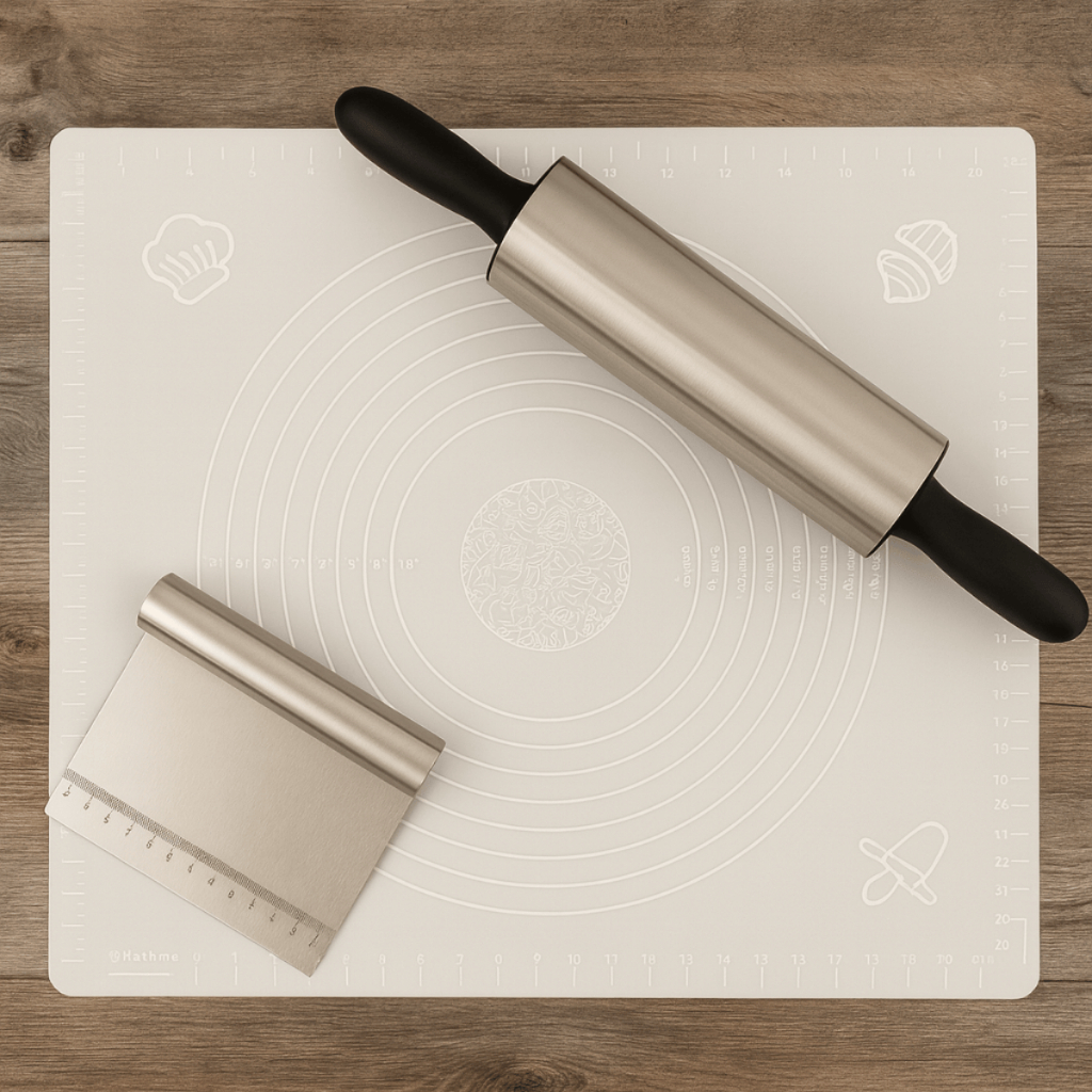 KIT MASSA , PAO, CONFEITARIA, BOLO, Rolo Inox profissional , Espátula inox, Tapete silicone