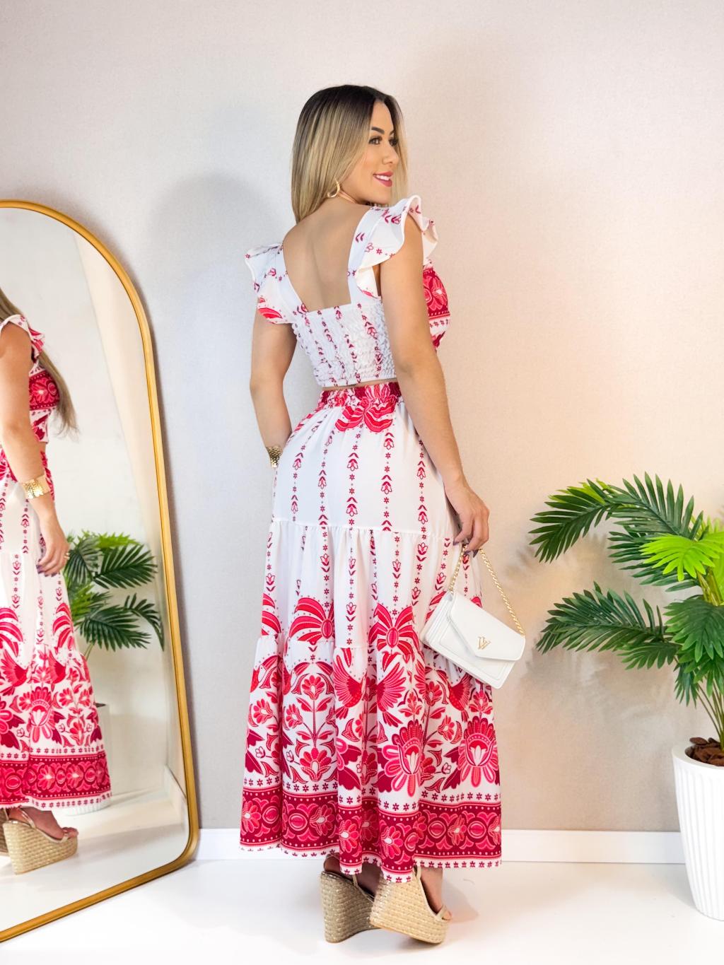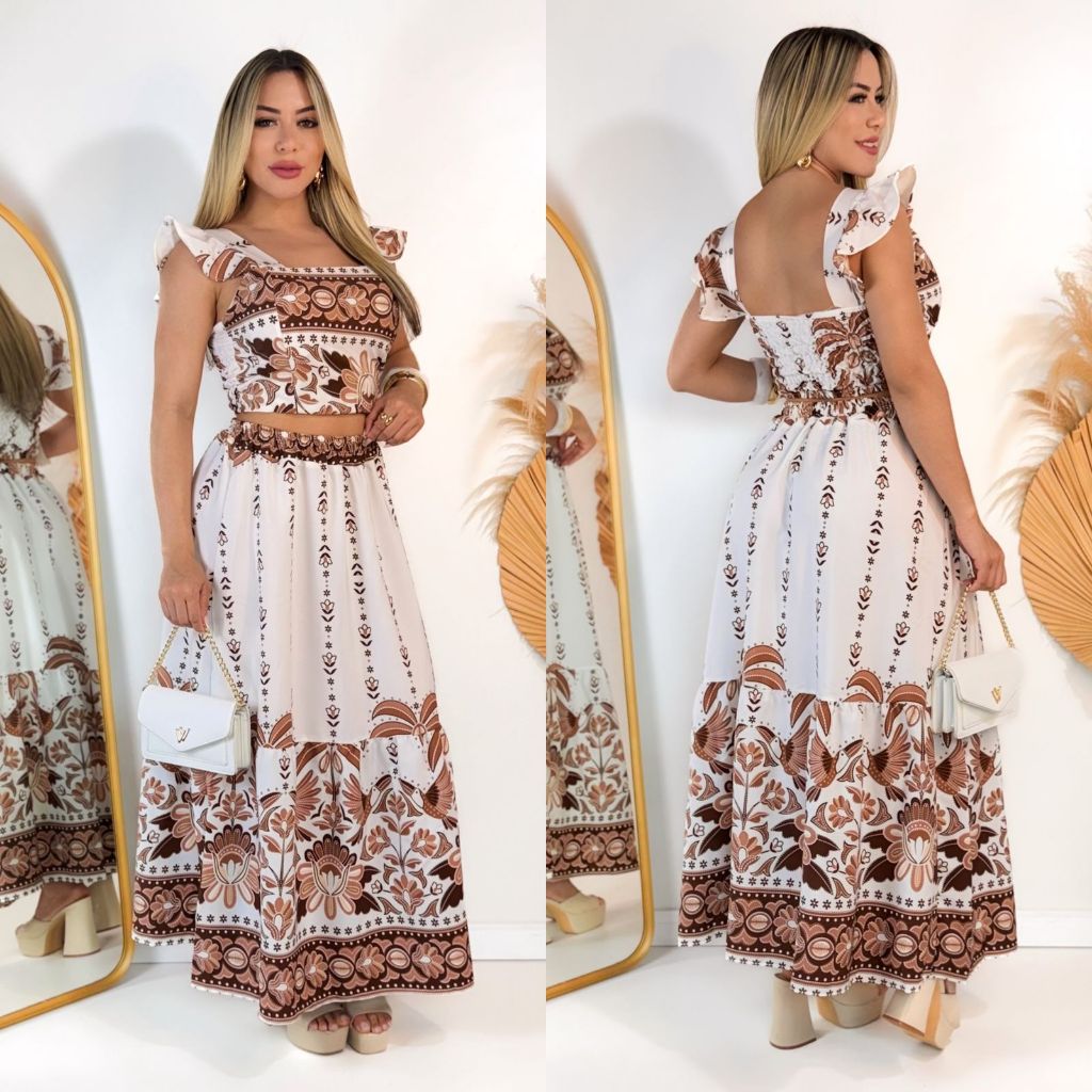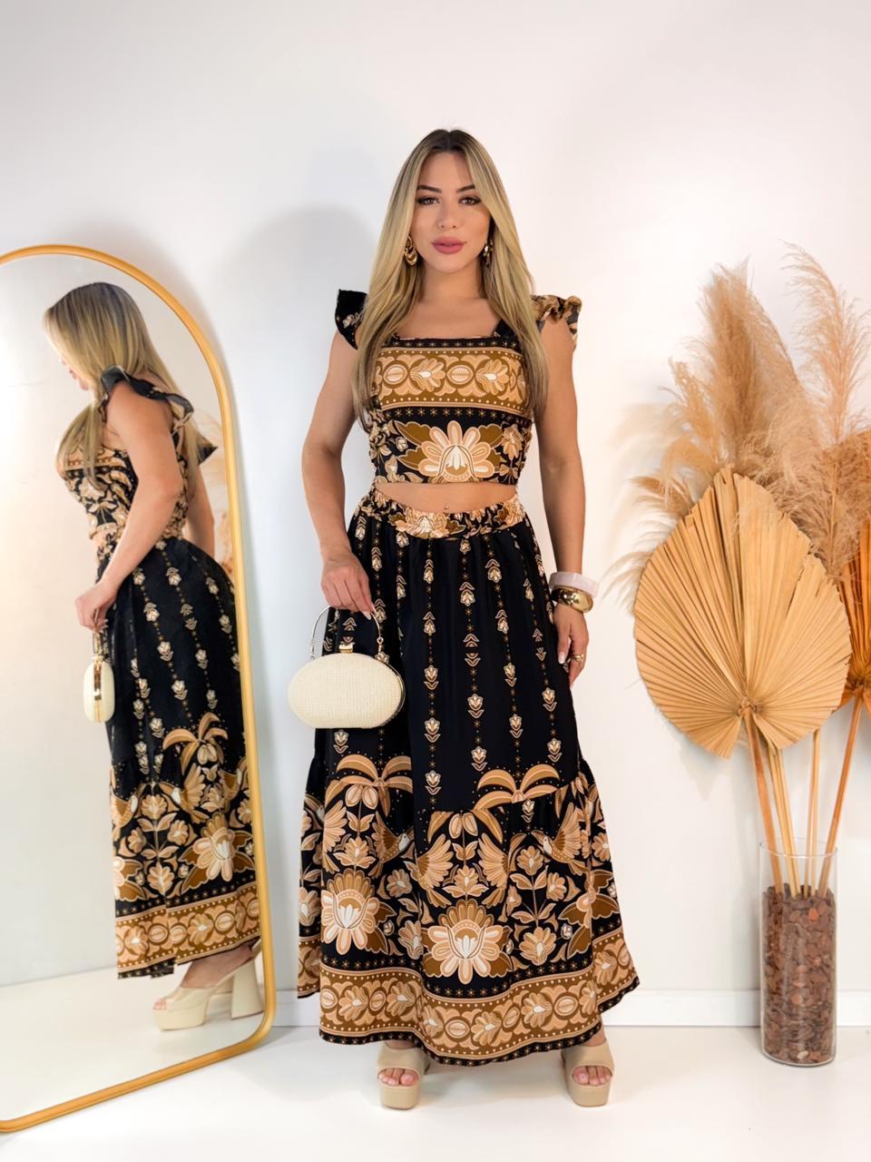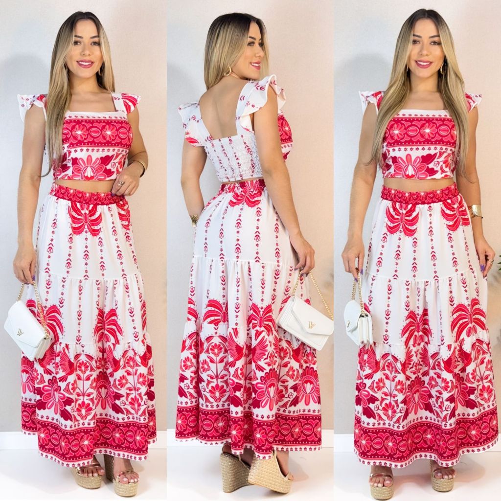 CONJUTO SAIA LONGA E CROPPED LASTEX COSTA FLORAL VERÃO COM BOJO FEMININA ESTAMPADO