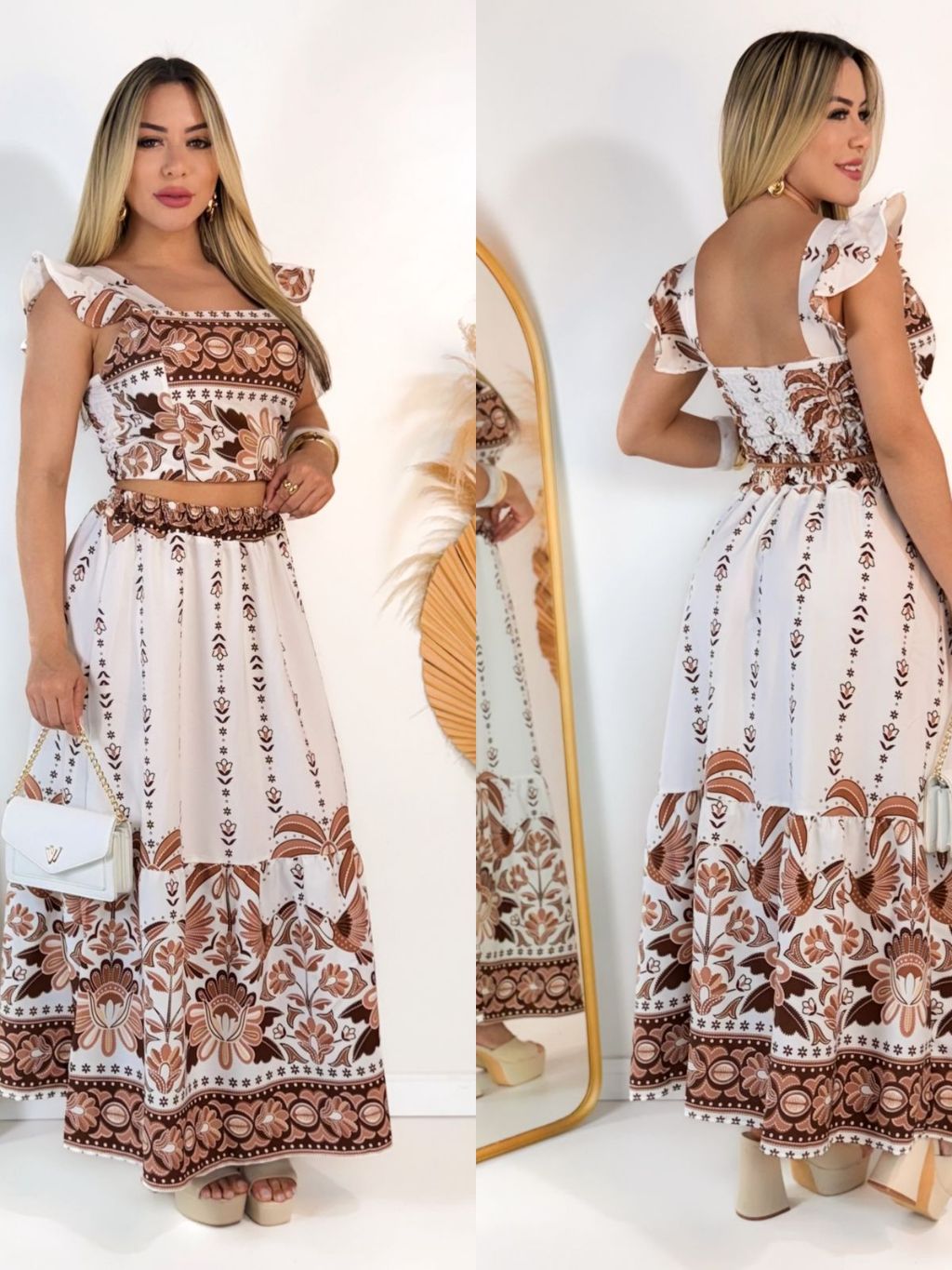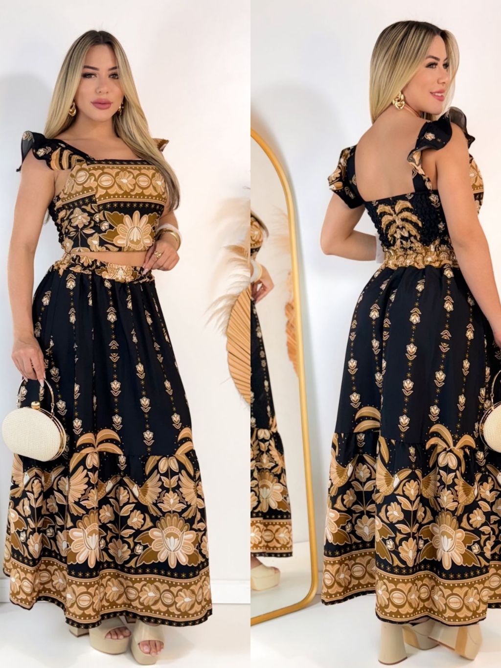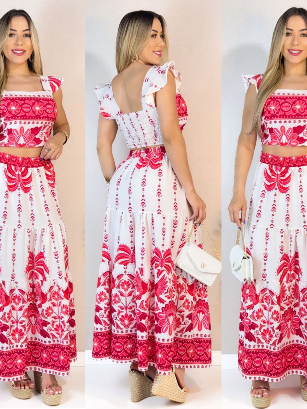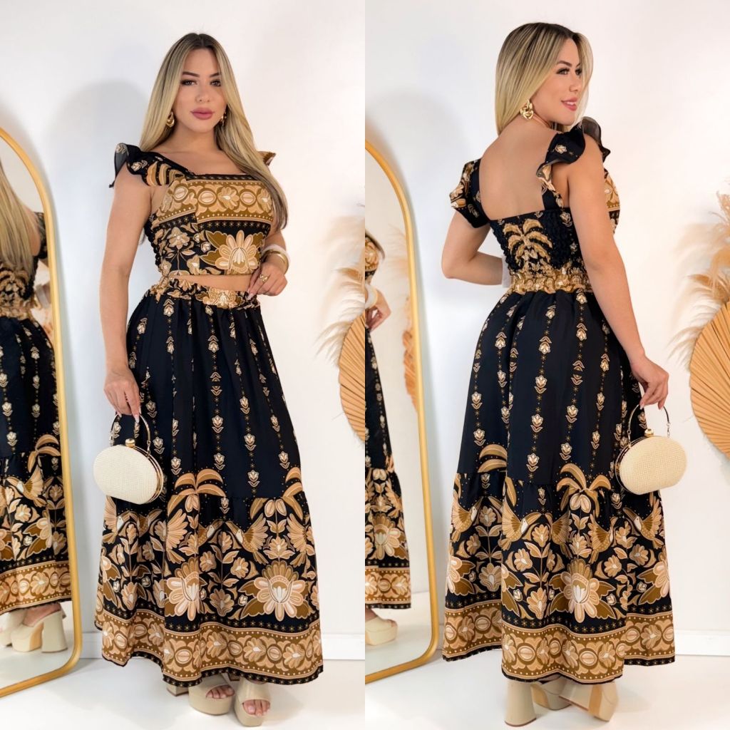 CONJUTO SAIA LONGA E CROPPED LASTEX COSTA FLORAL VERÃO COM BOJO FEMININA ESTAMPADO