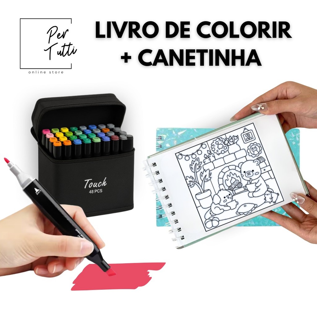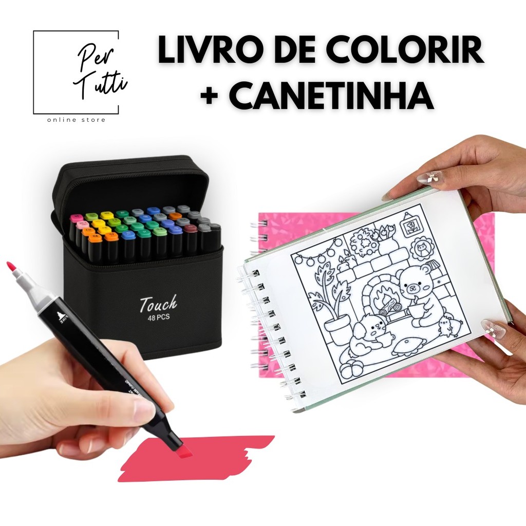 Kit Livro De Colorir Capa Dura 50 Folhas + 24/36/60/80/ Und Caneta Marcadora Com Ponta Dupla