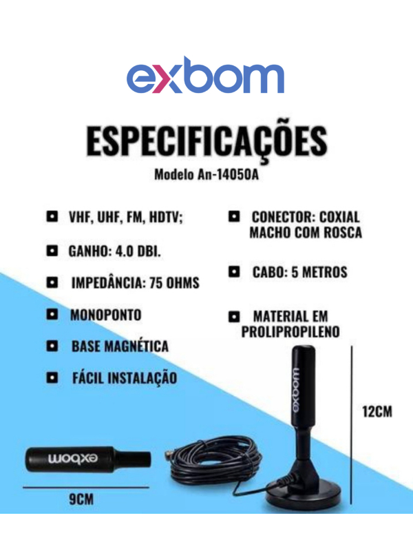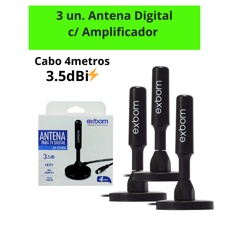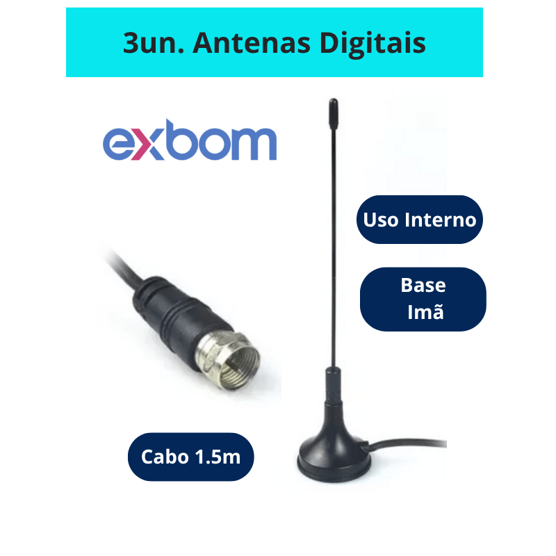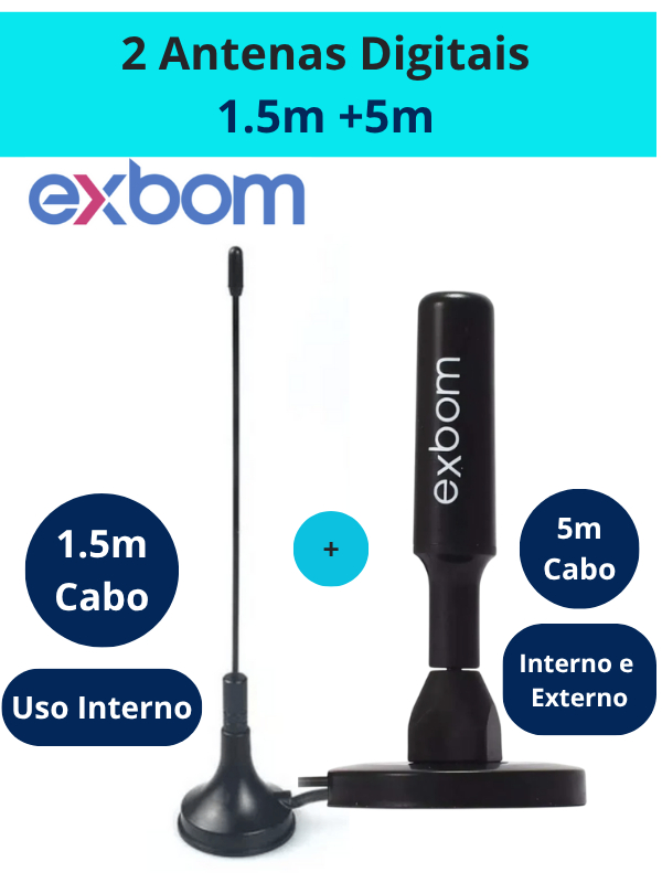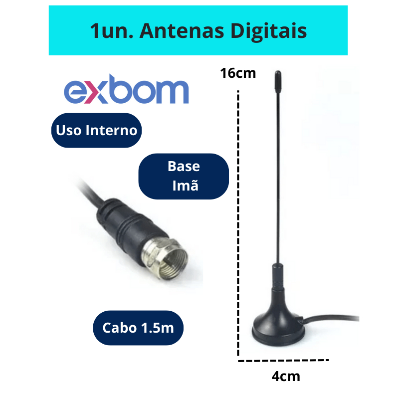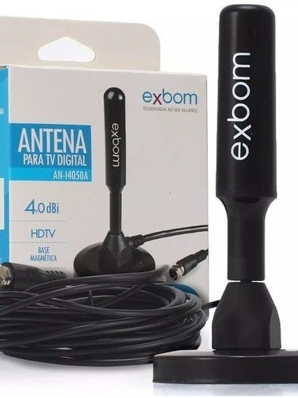 Antena TV Digital Smart Hdtv Amplificada Interna/Externa 4Dbi Cabo 1.5m/5m UHF/VHF Base Imã Exbom