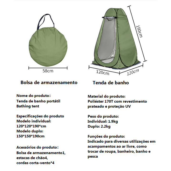Barraca Portátil de Privacidade para Camping Tenda de Banho e Troca de Roupas Extra Grande 150*150*190cm
