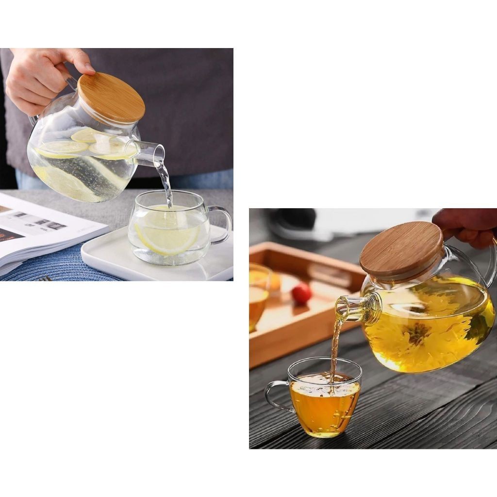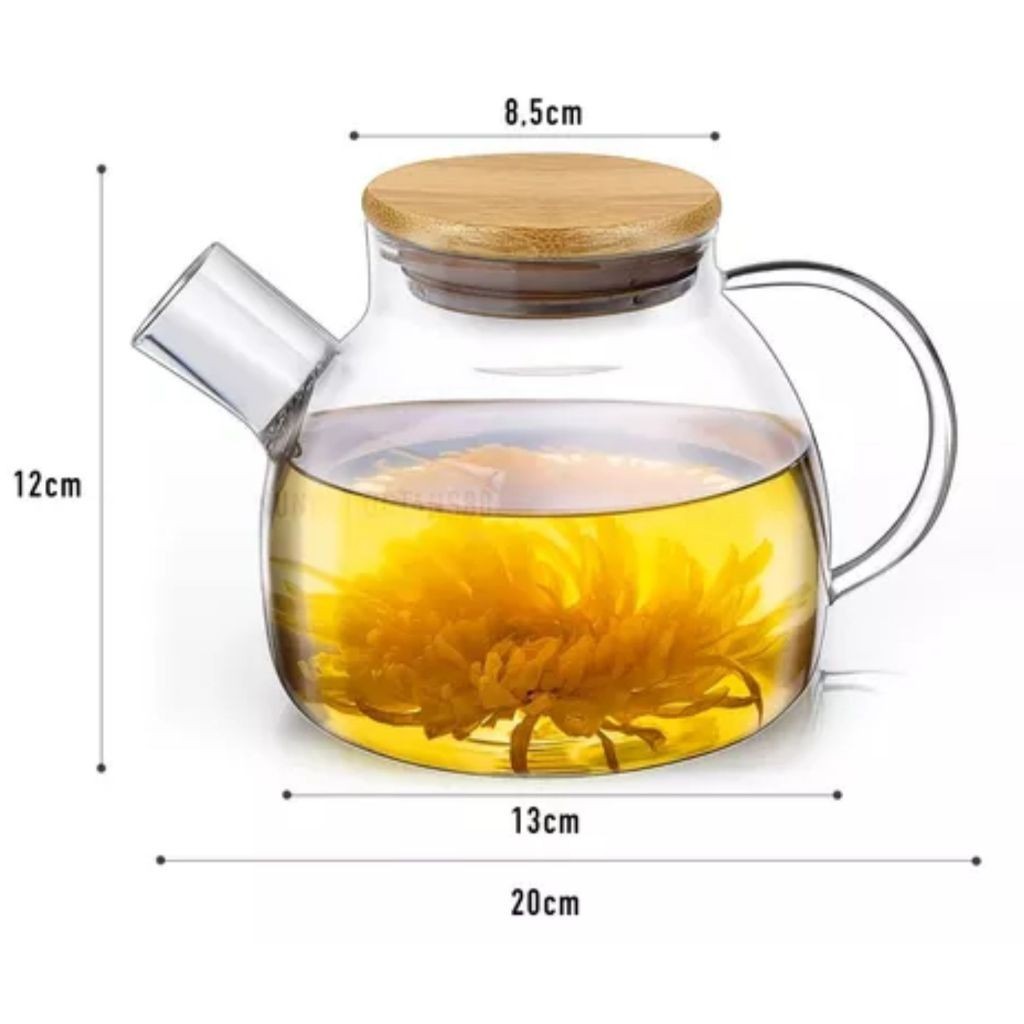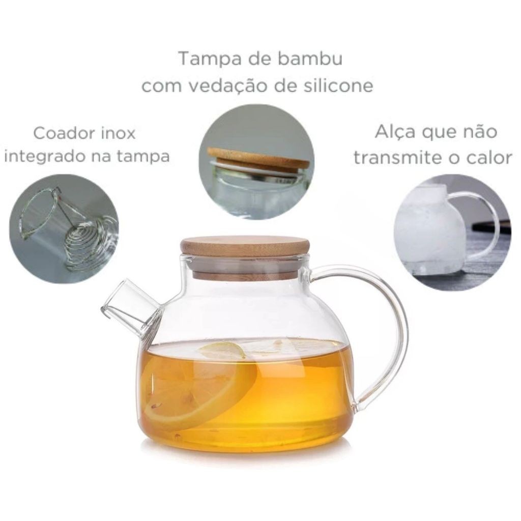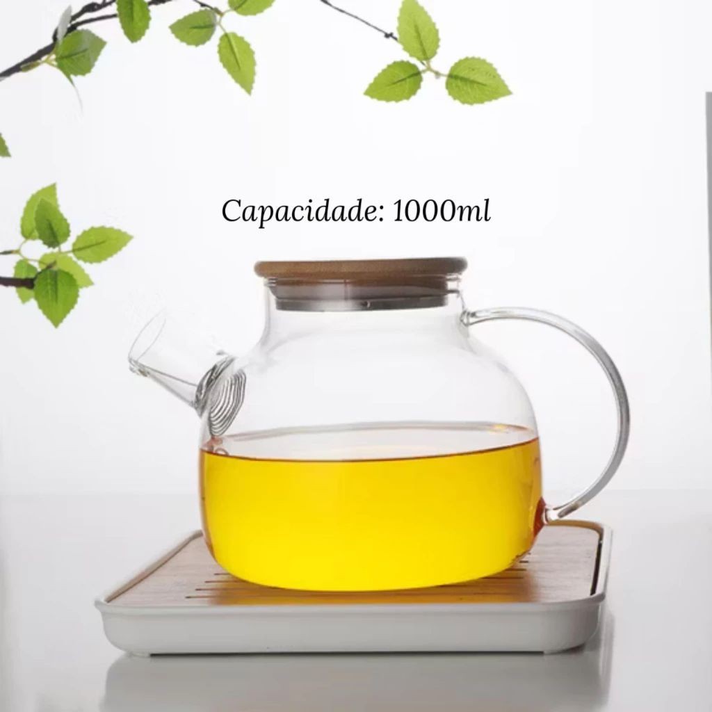 Chaleira de Vidro 1 Litro Coador Tampa de Bambu Premium Resistente a Calor de ir Fogo Bule infusor