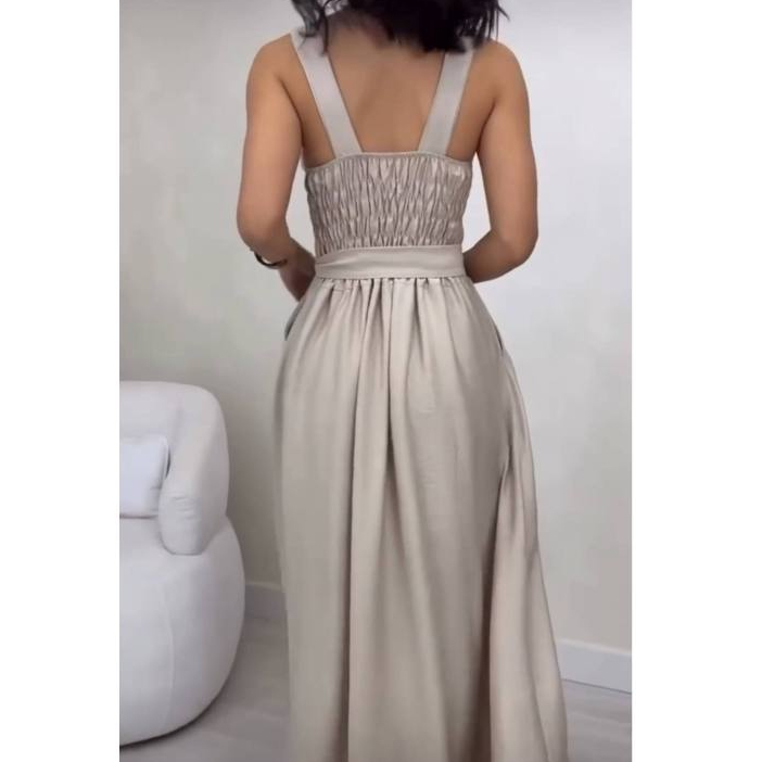 Vestido longo com bojo, bolso, lastex nas costas com cinto.