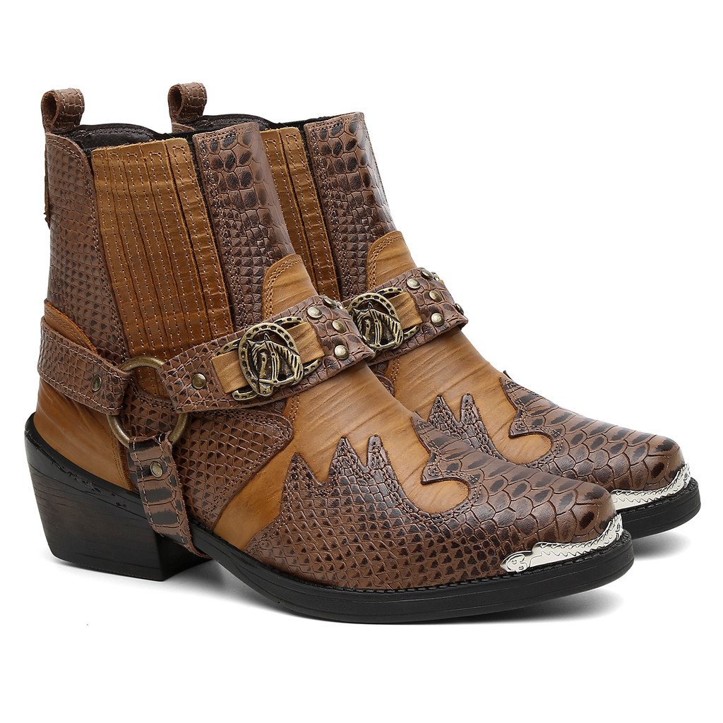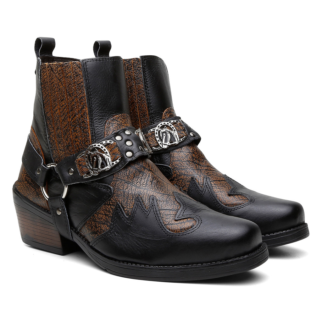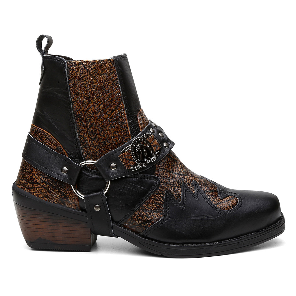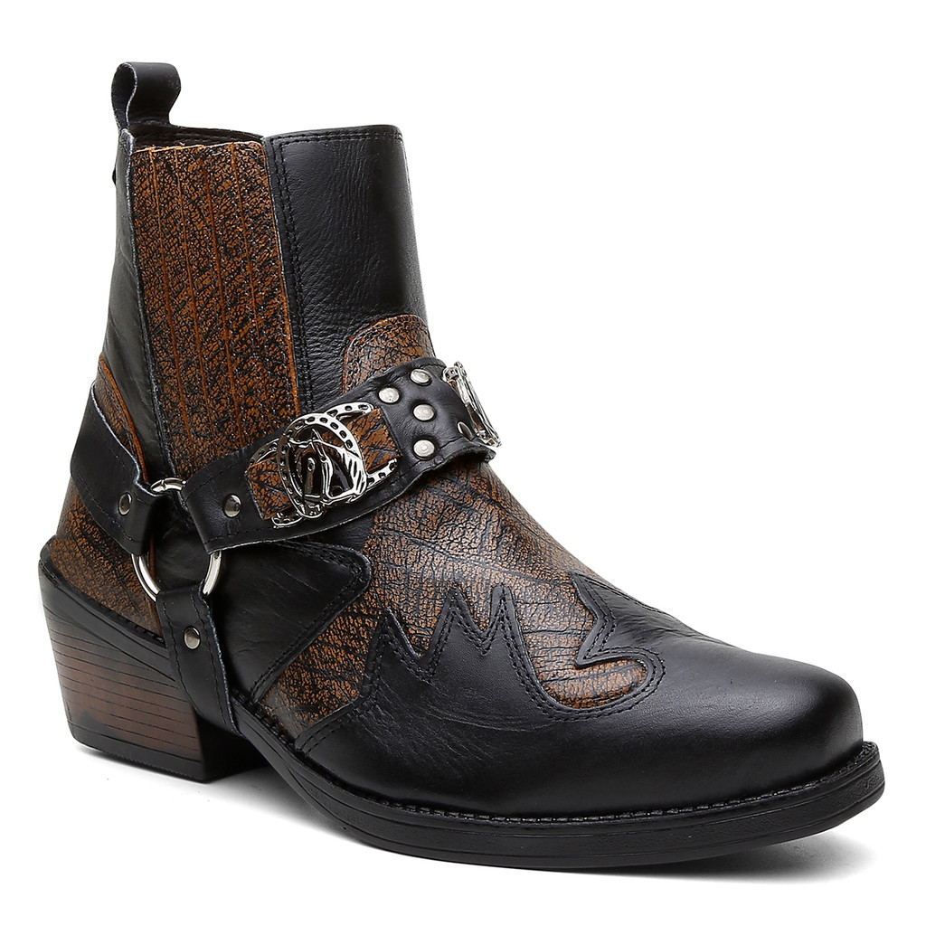Bota Masculina Biker Western Couro Cano Curto com Fivela e Salto Estilizado