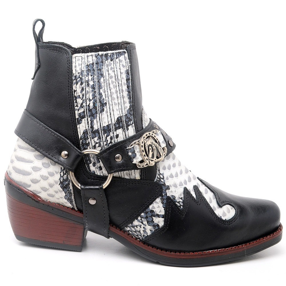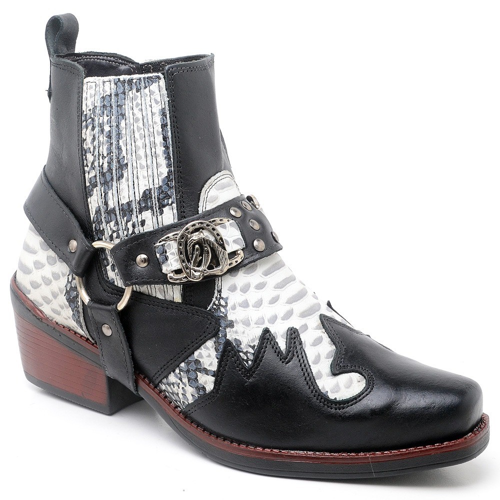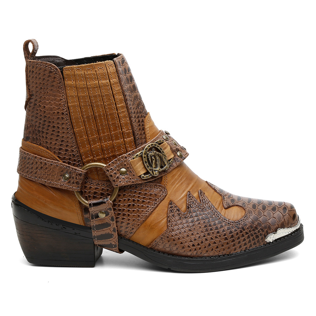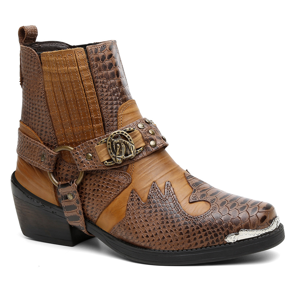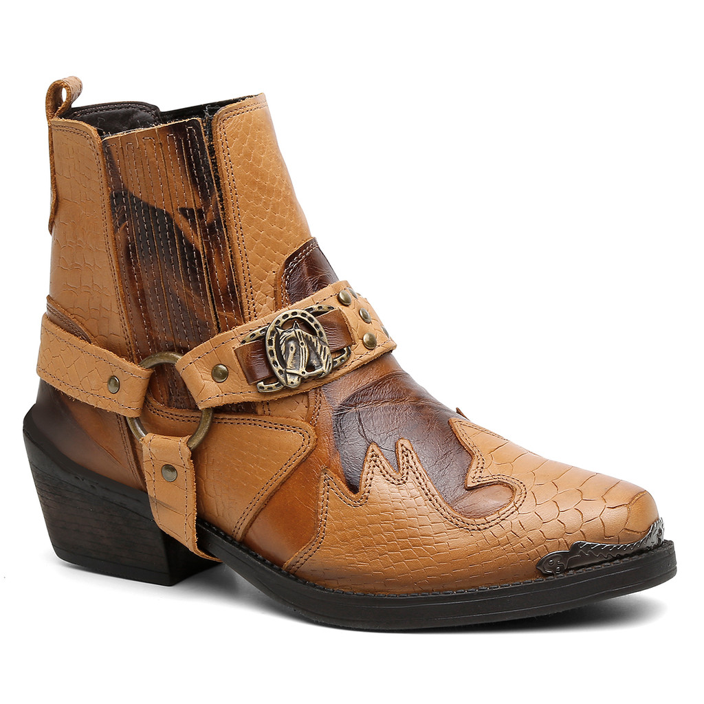 Bota Masculina Biker Western Couro Cano Curto com Fivela e Salto Estilizado