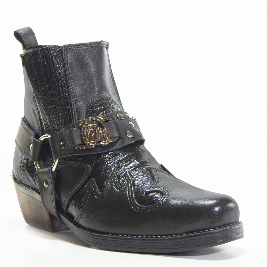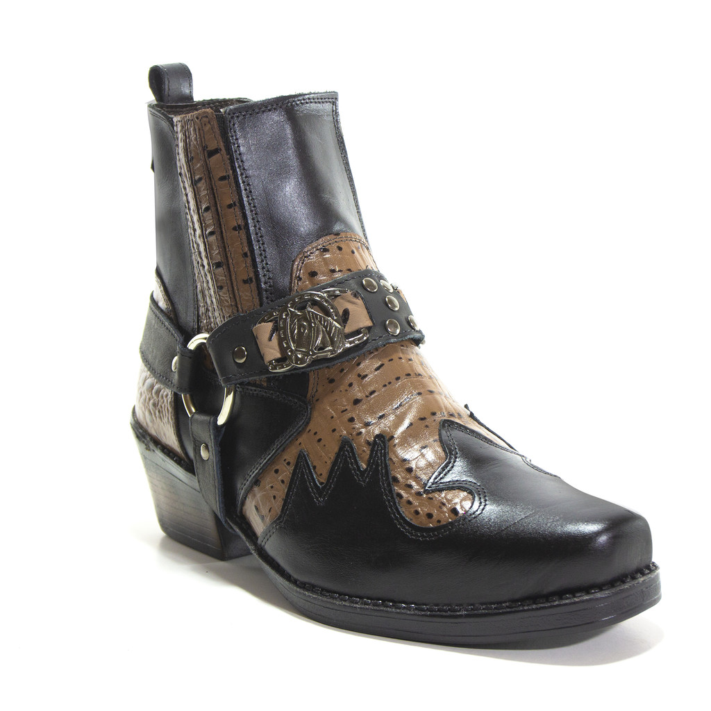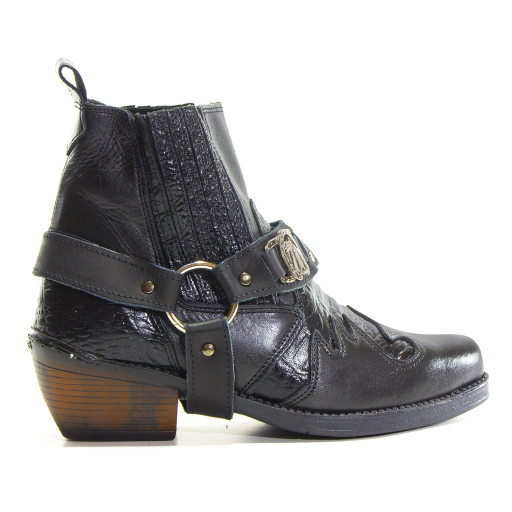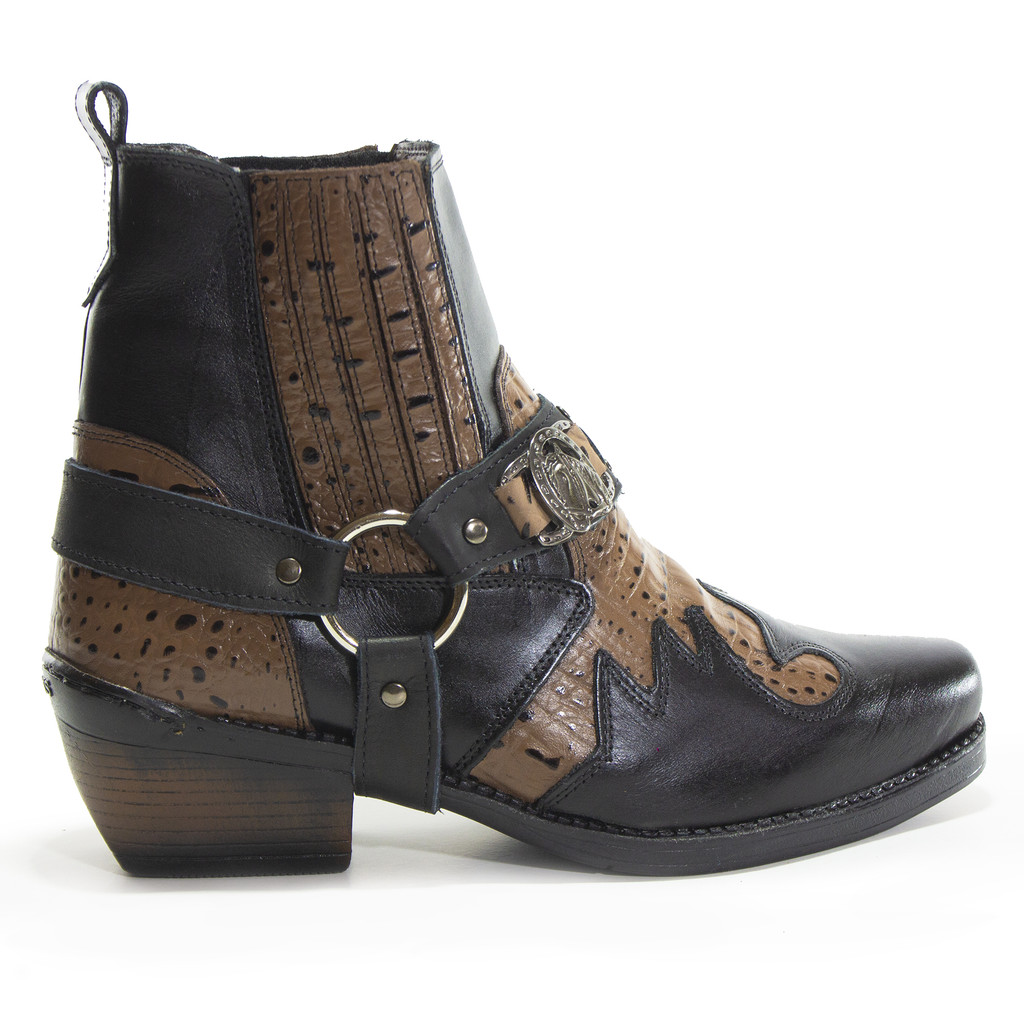 Bota Masculina Biker Western Couro Cano Curto com Fivela e Salto Estilizado