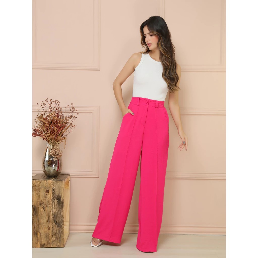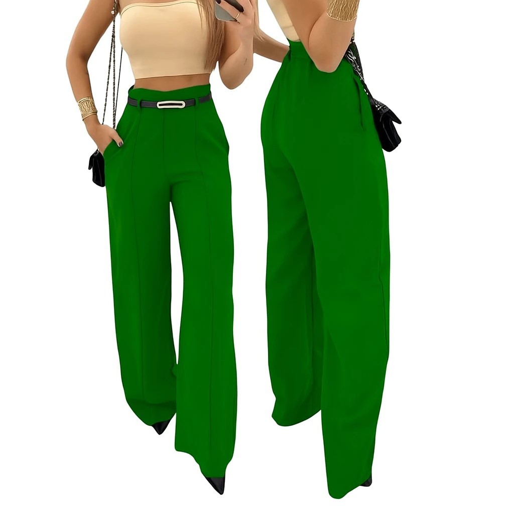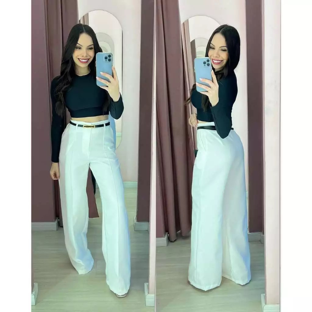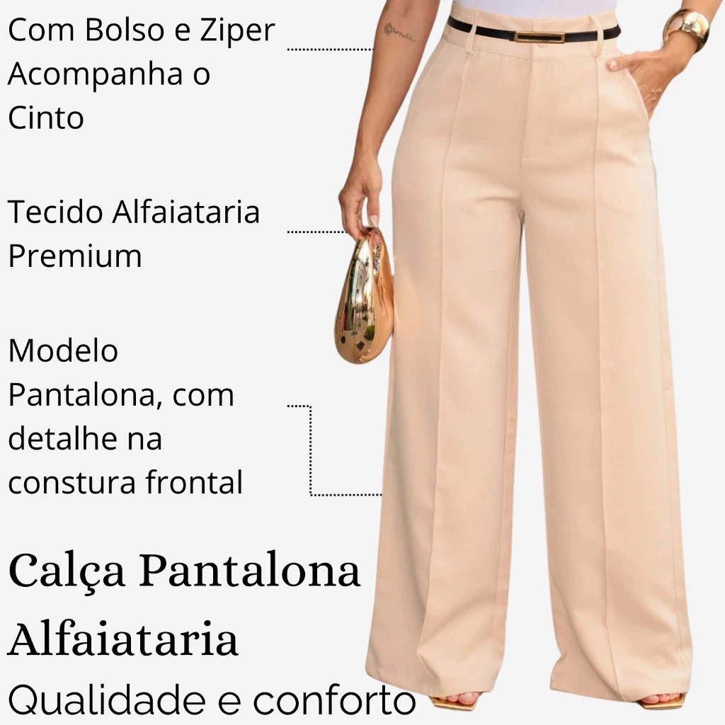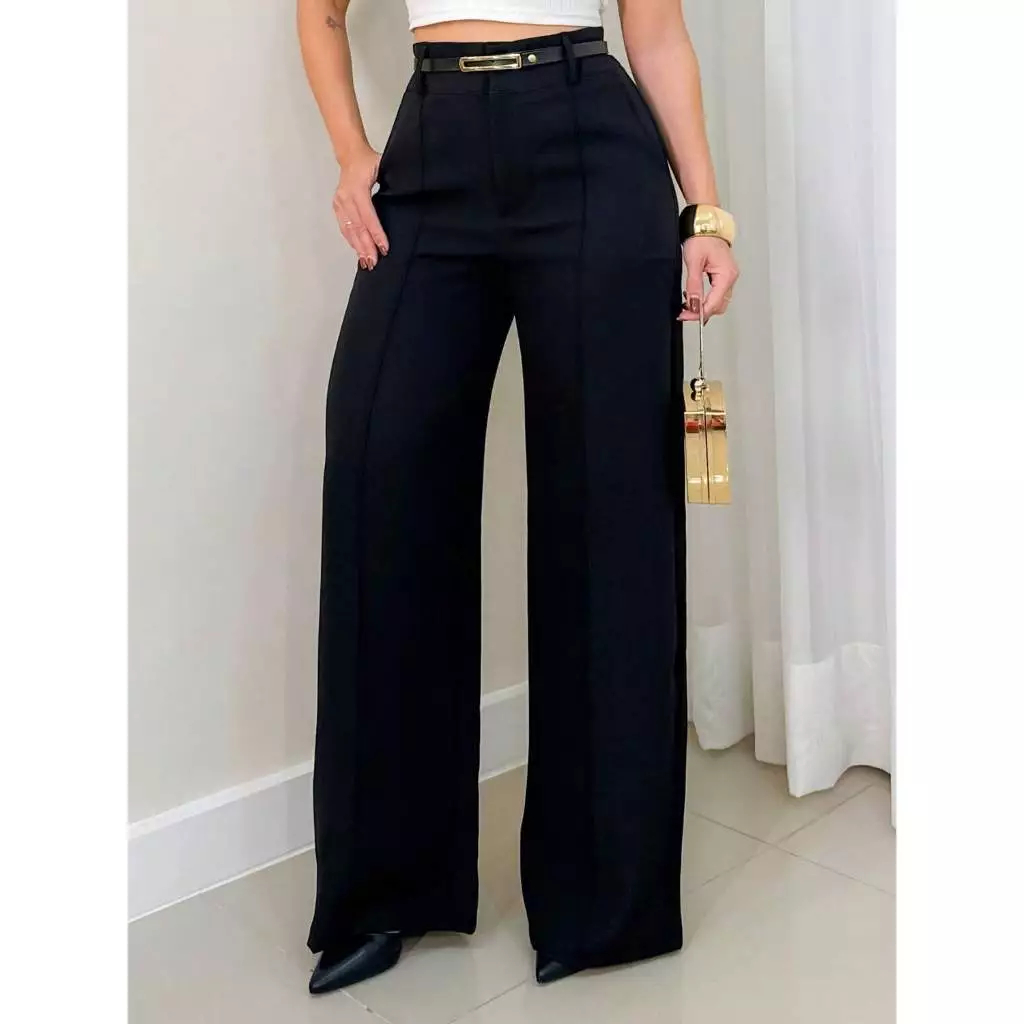 Calça Pantalona Alfaiataria Feminina Social Cinto Bolso Wide Leg Cintura Alta Premium Moda Elegante