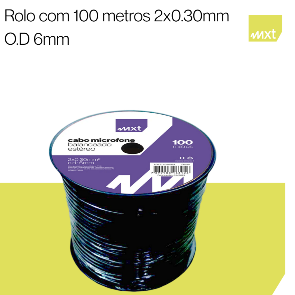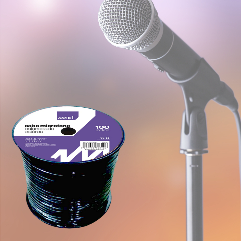 CABO MICROFONE BALANCEADO ESTEREO 2X0.30MM² , OD 6MM PRETO 100 metros