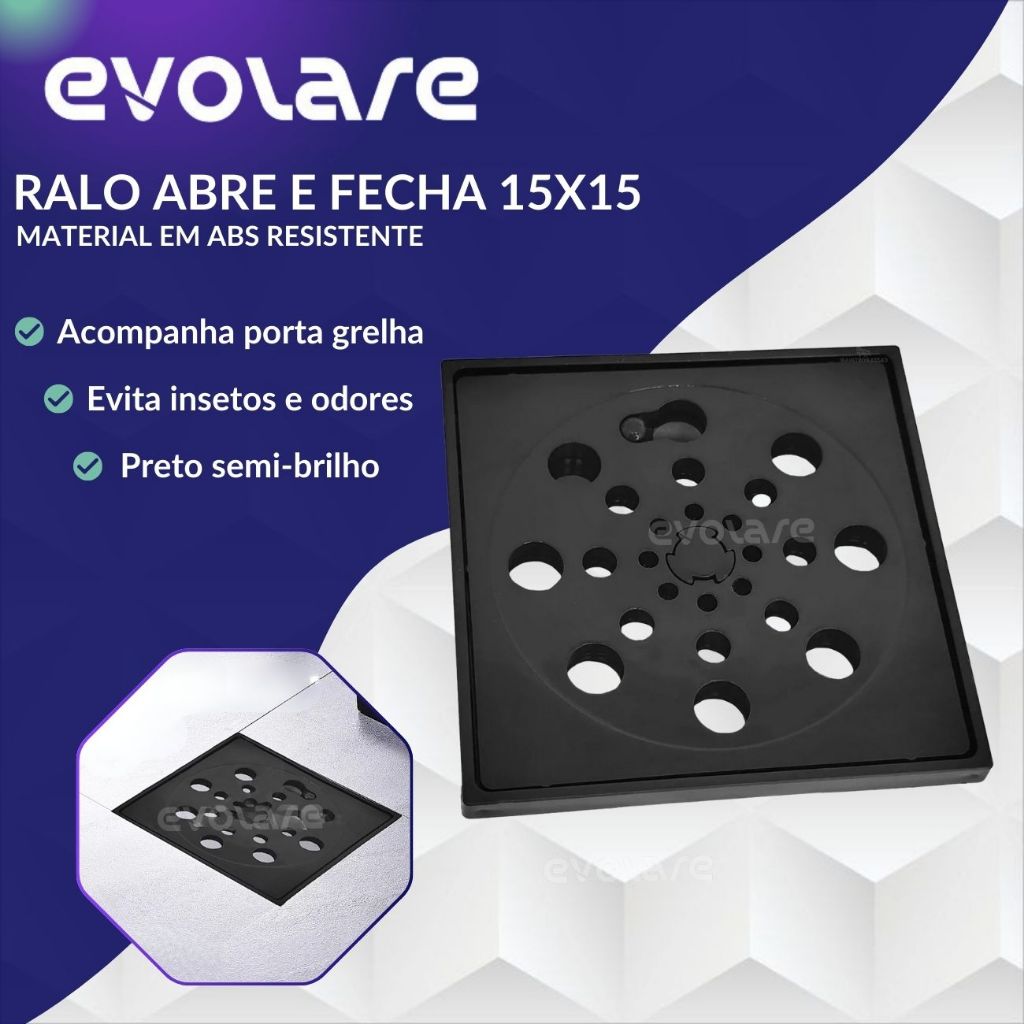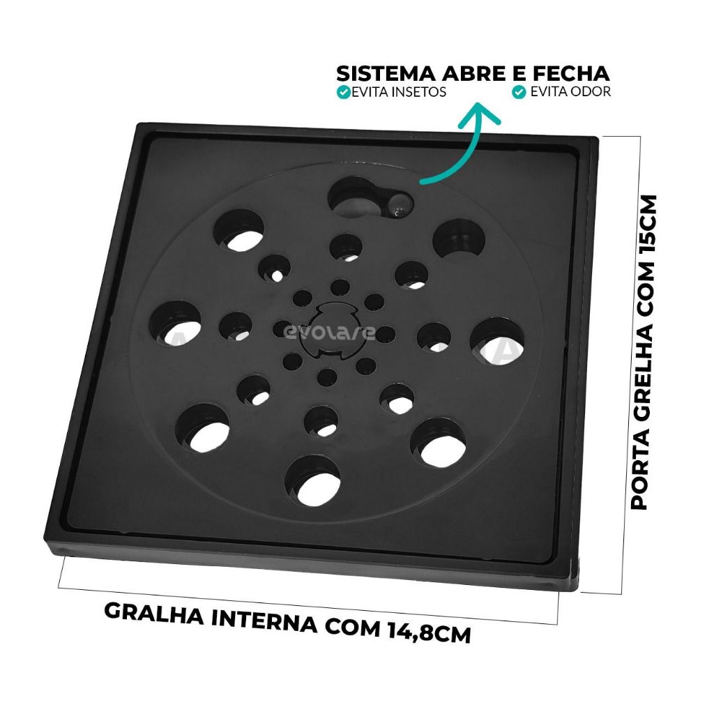 Ralo Quadrado 15x15 Preto Abre e Fecha - Bloqueia Odores e Insetos