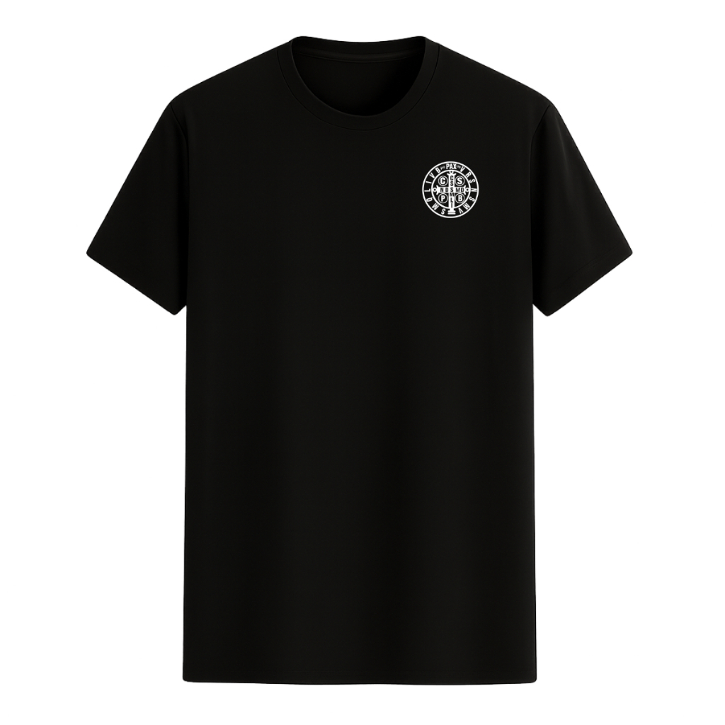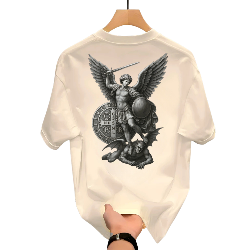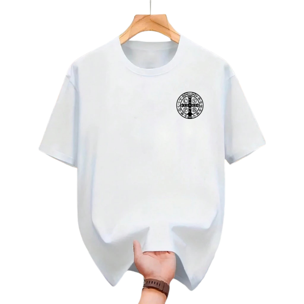 Camiseta Estampada Algodão Premium São Miguel Arcanjo Medalha São Bento Unissex Preta Branca Camisa