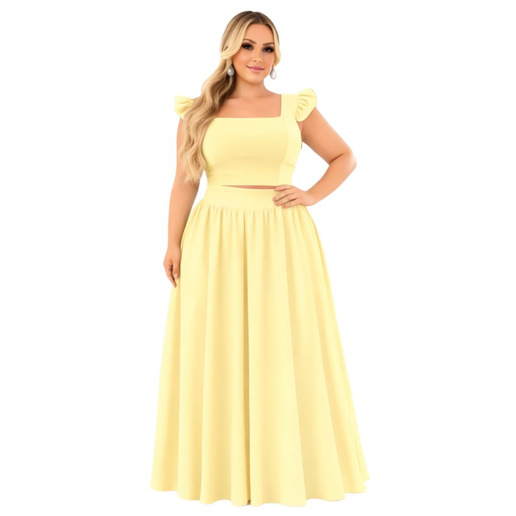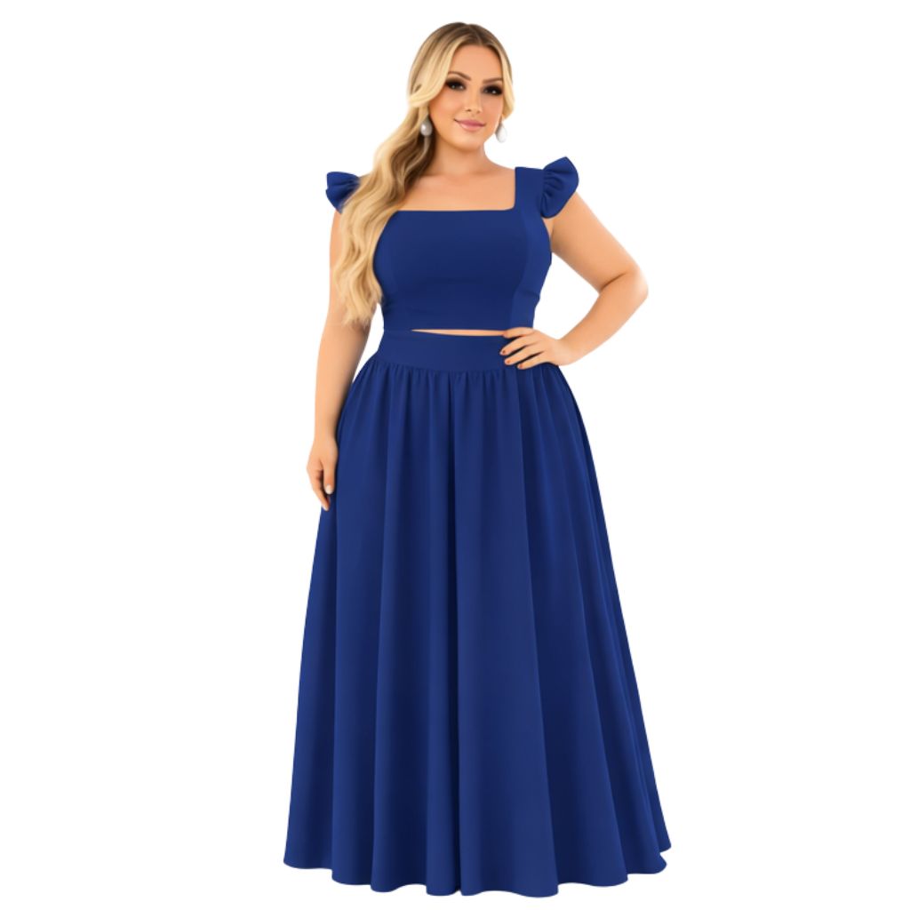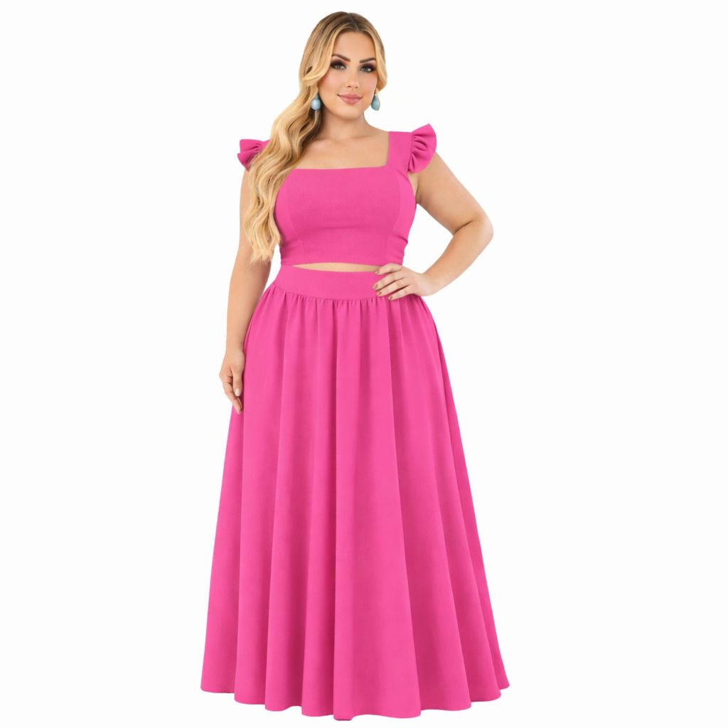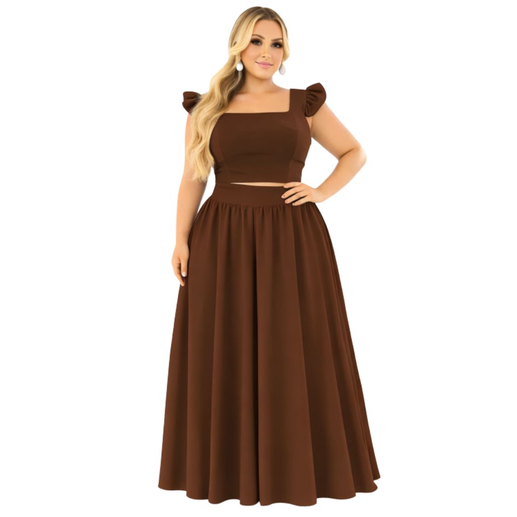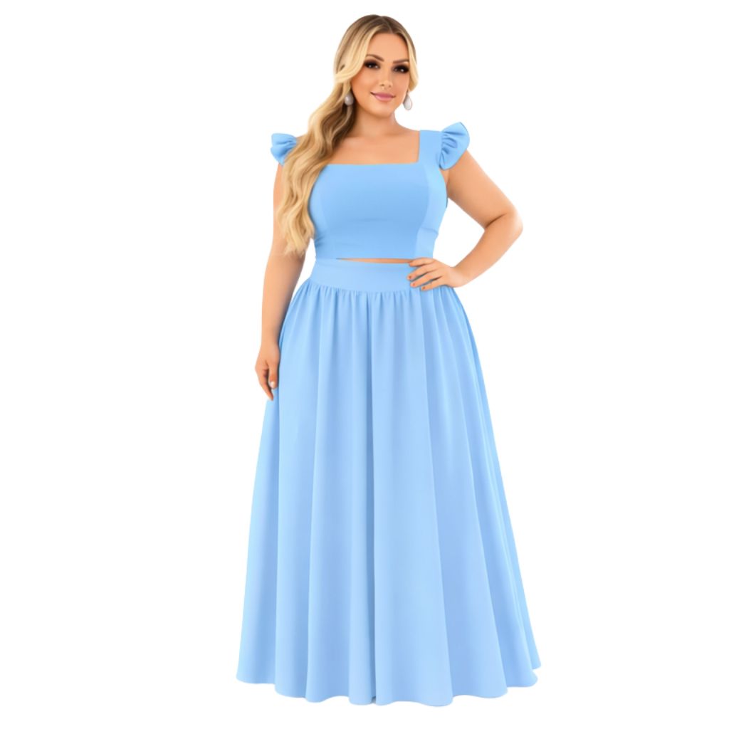 Conjunto plus size moda maior de saia GODÊ longa e cropped de alça babado TECIDO CREPINHO cores e estampas variadas.