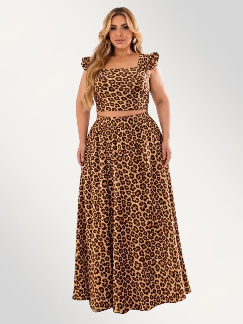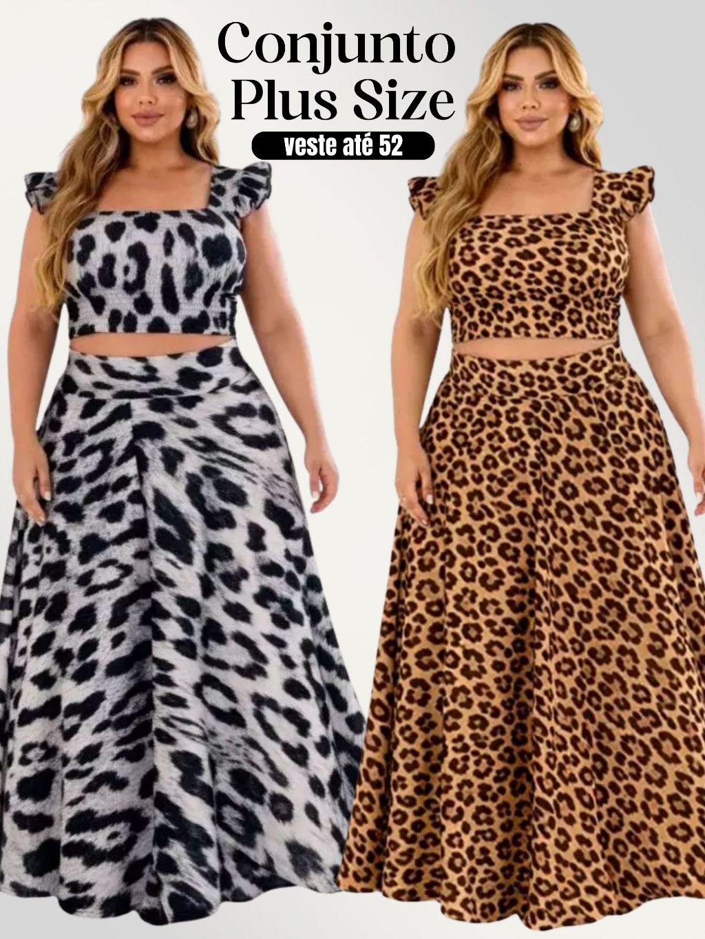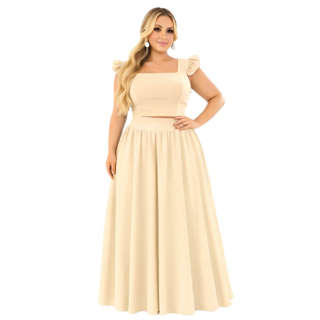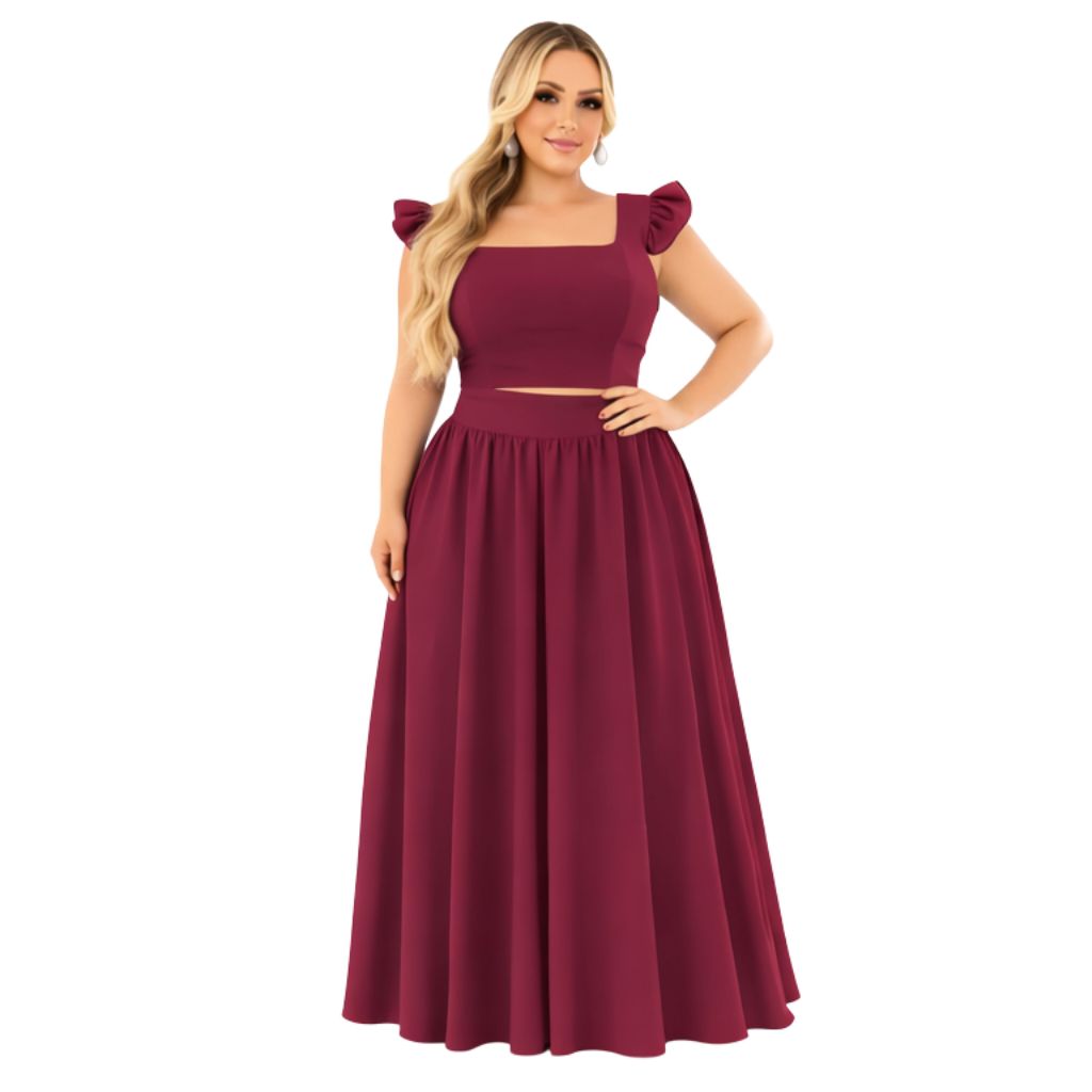 Conjunto plus size moda maior de saia GODÊ longa e cropped de alça babado TECIDO CREPINHO cores e estampas variadas.