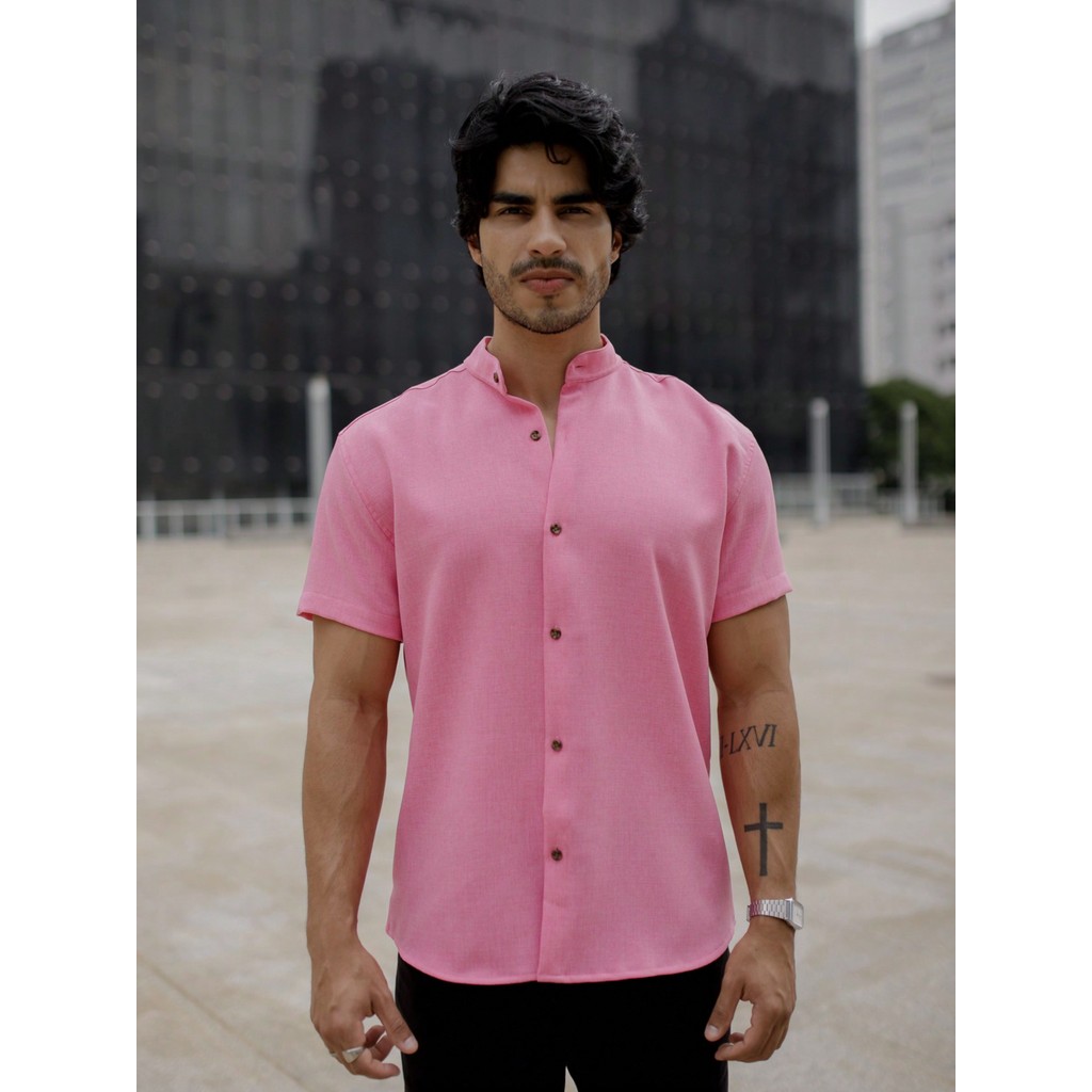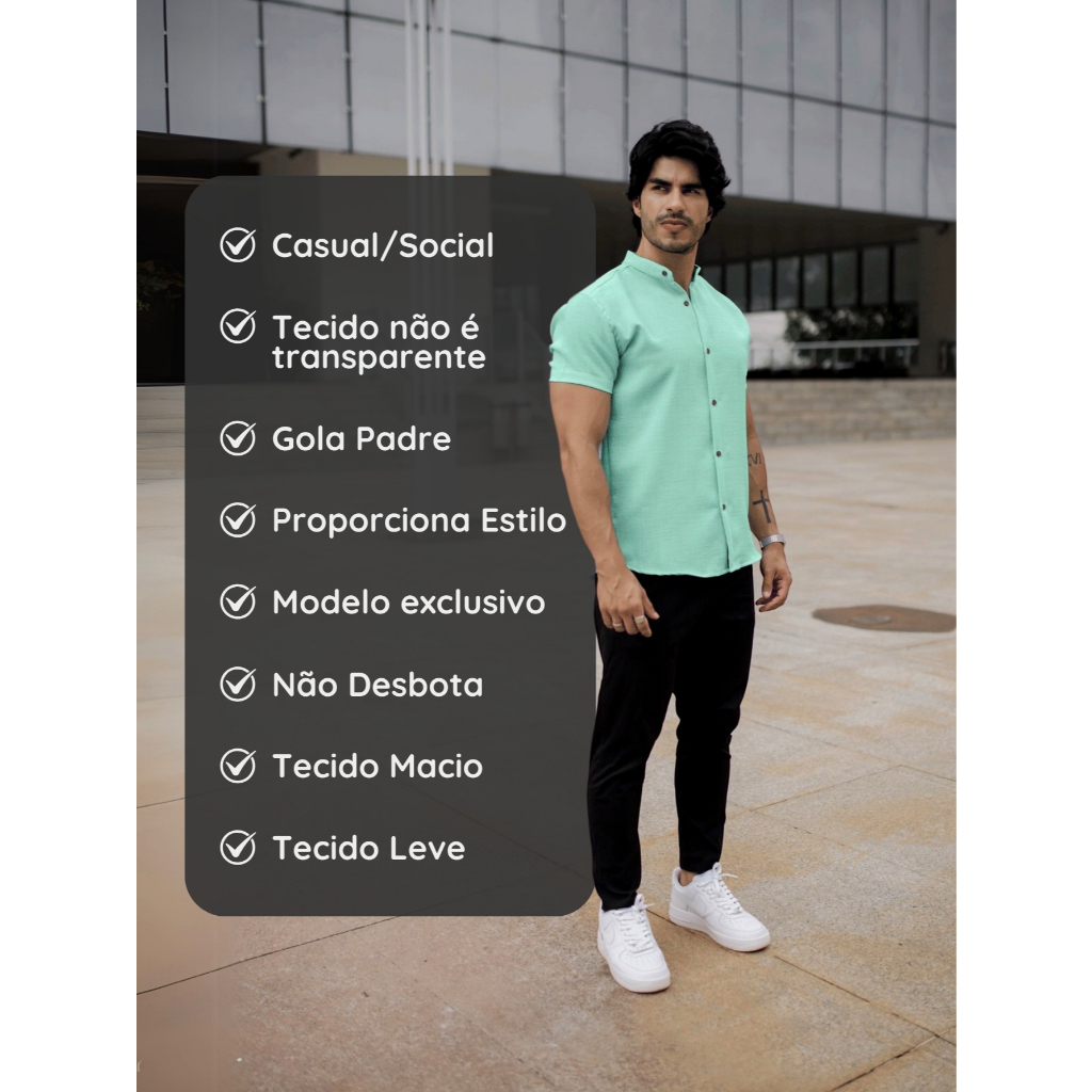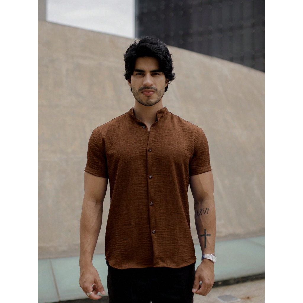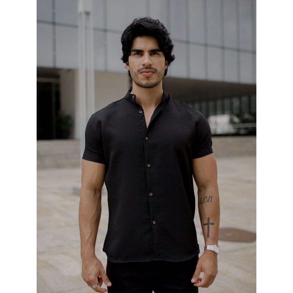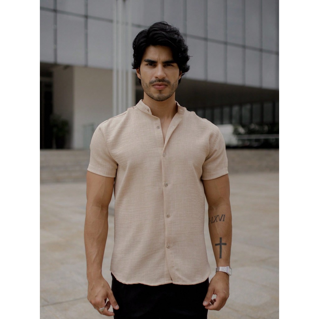 Camisa Masculina Manga Curta Gola Padre Slim Fit - Aspecto linho