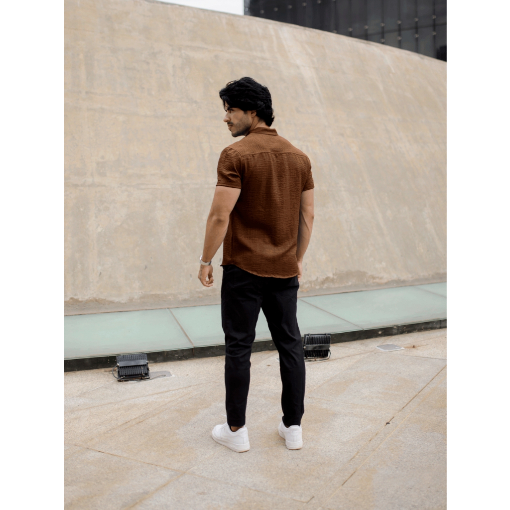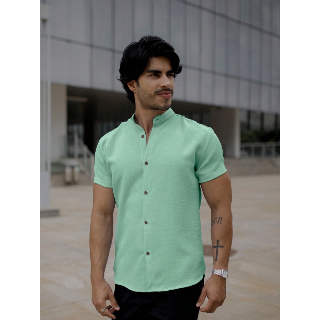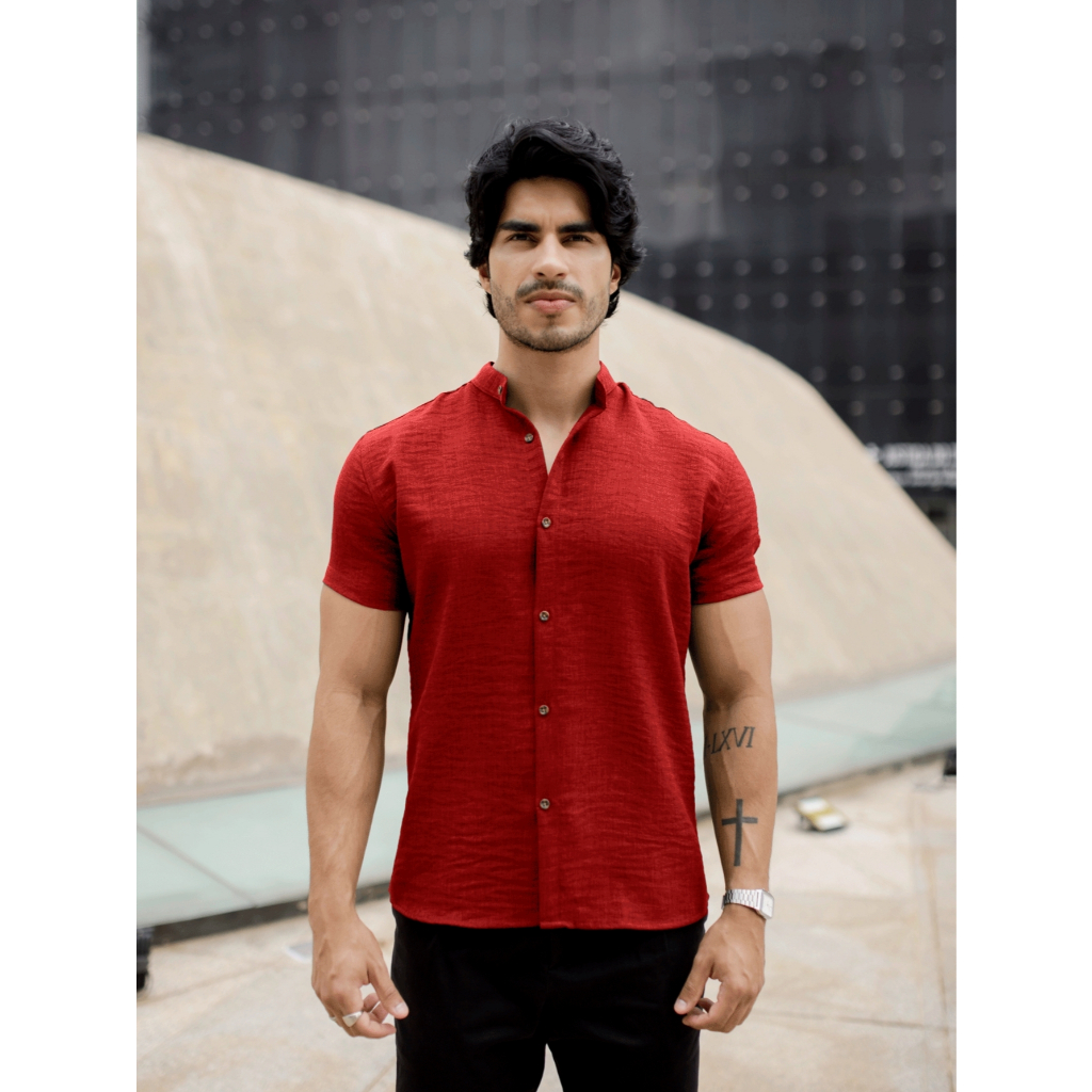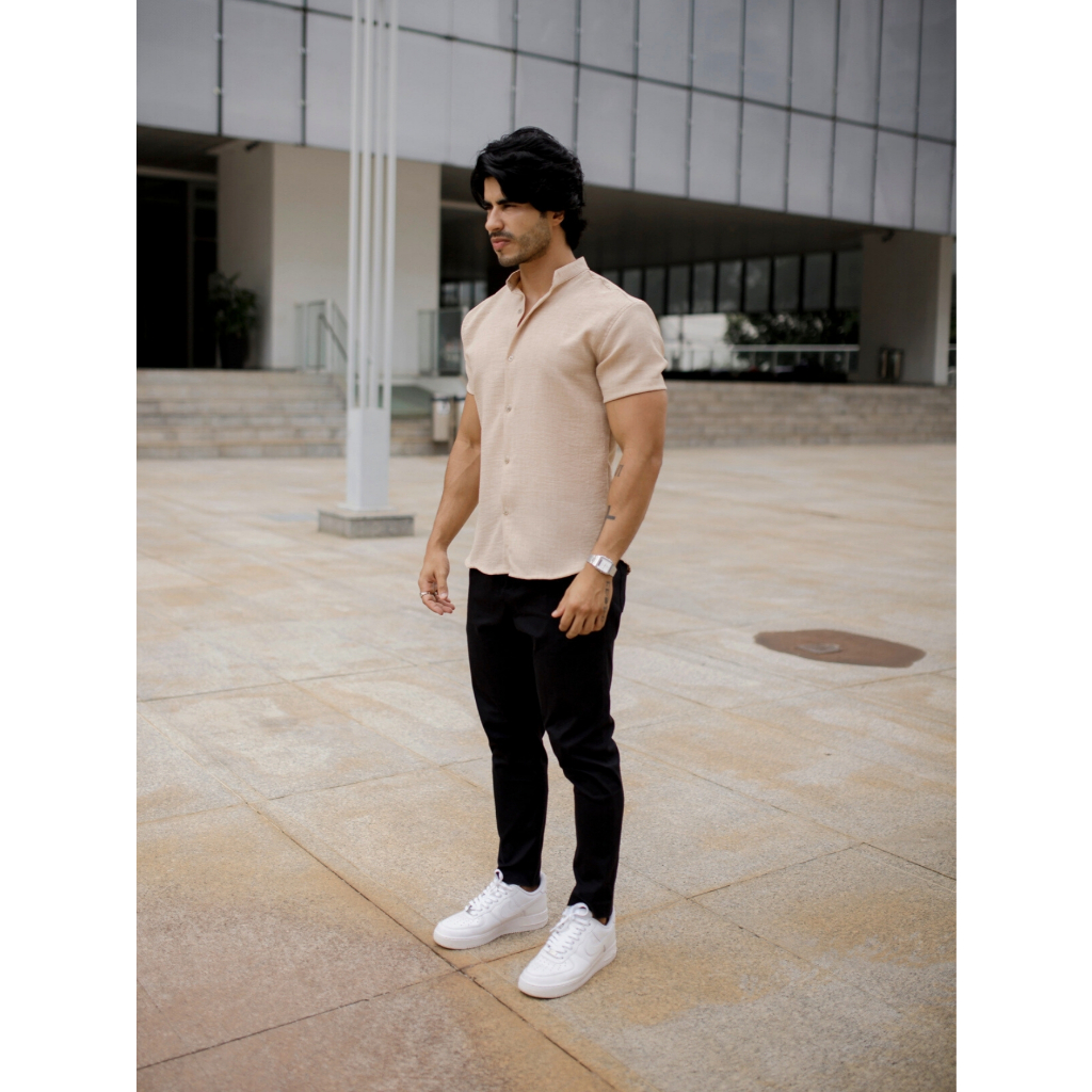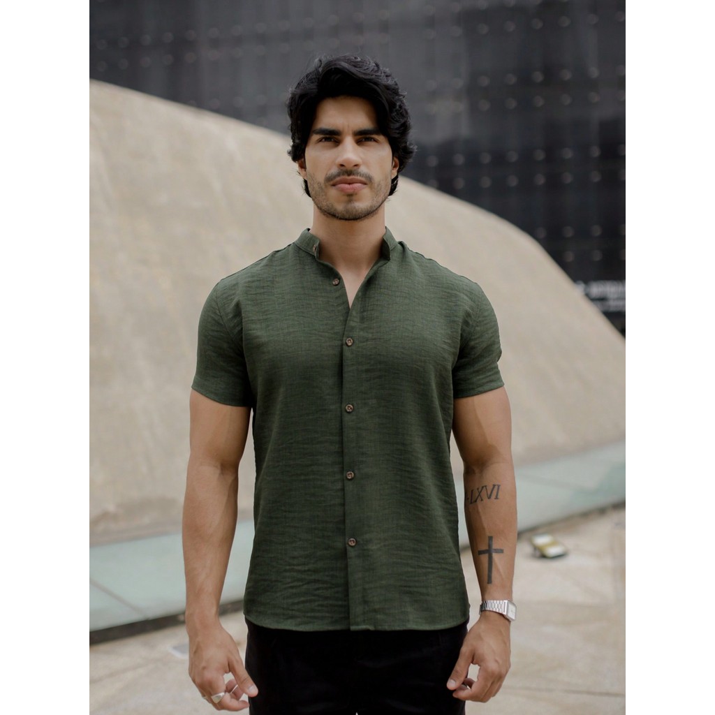 Camisa Masculina Manga Curta Gola Padre Slim Fit - Aspecto linho
