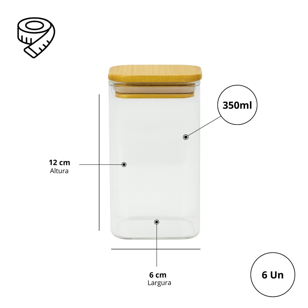 Kit 6 Pote Vidro Quadrado 350ml Tampa Bambu Ideal Cozinha 6x12cm