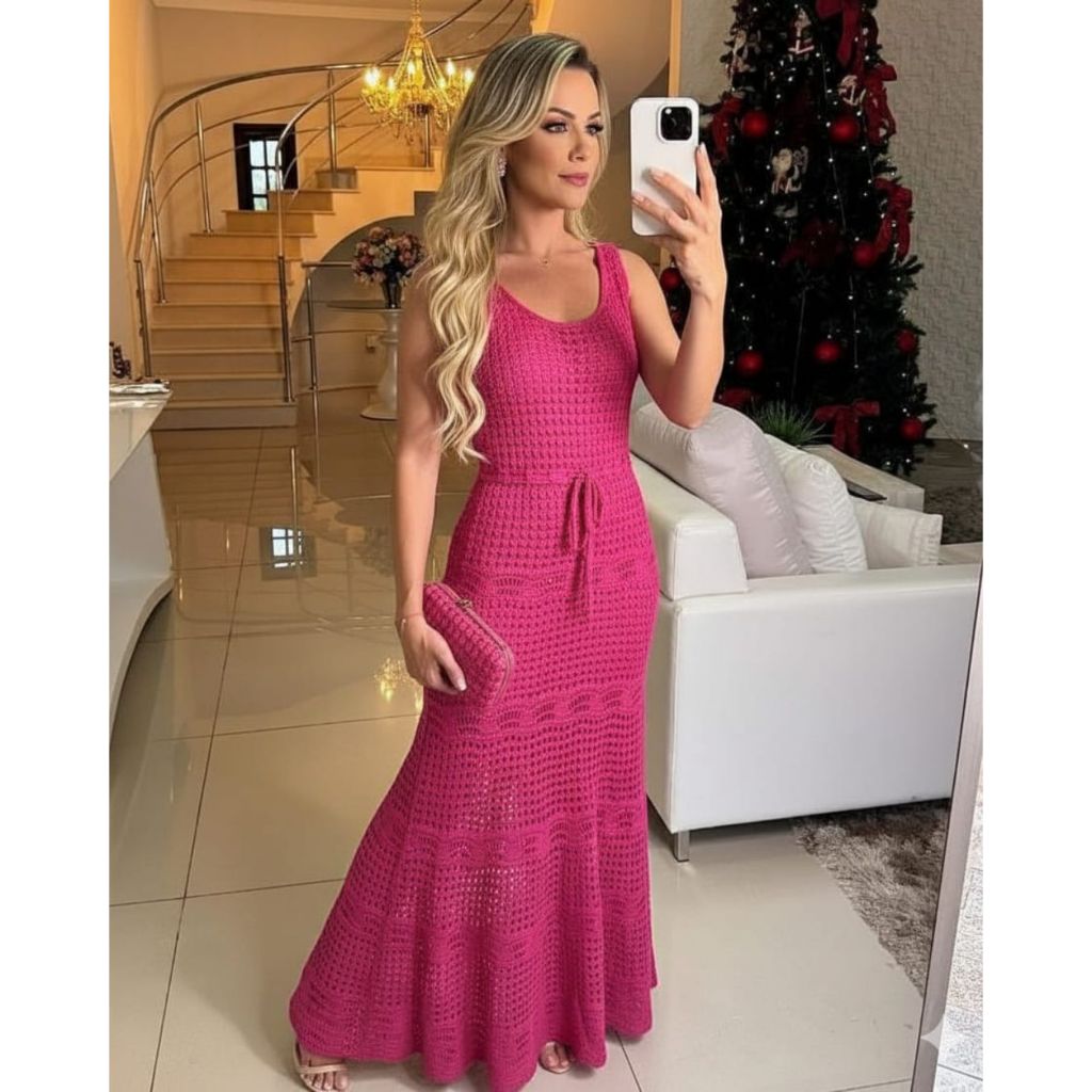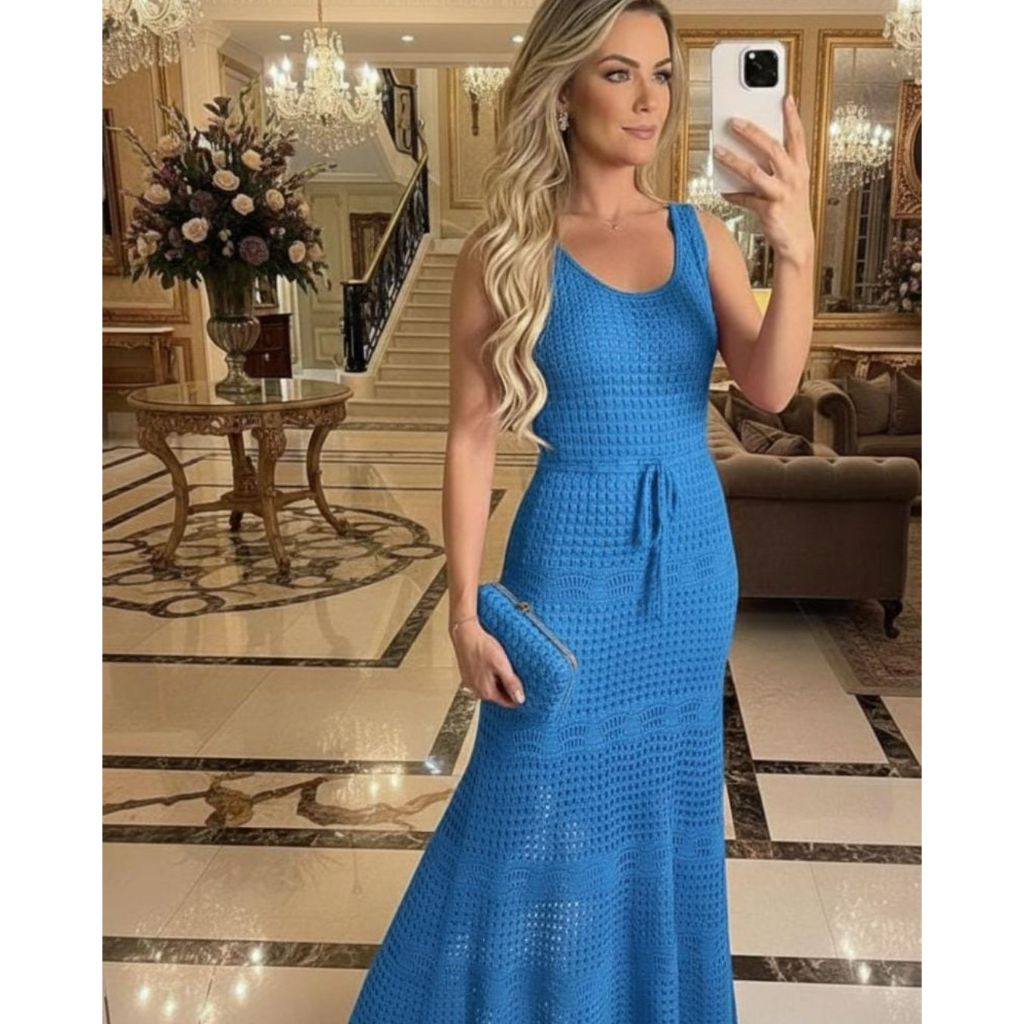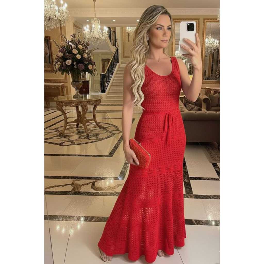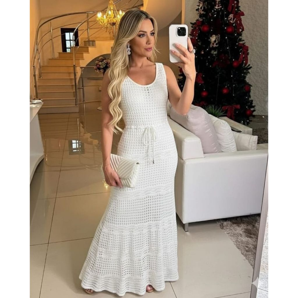 Vestido Feminino Midi Tricô Longo Vazado Renda Elegante Com Forro