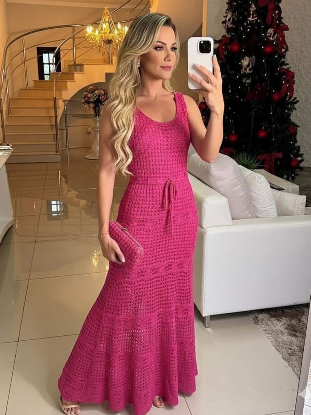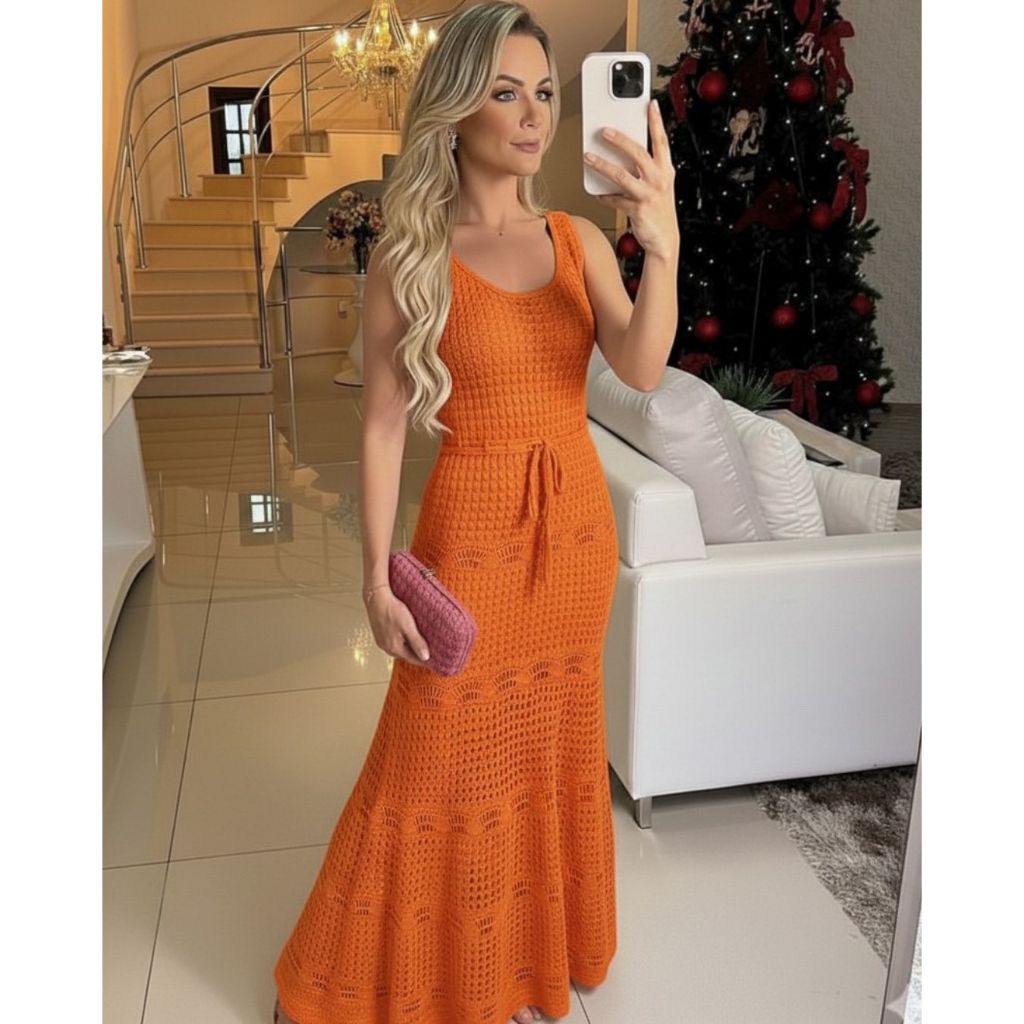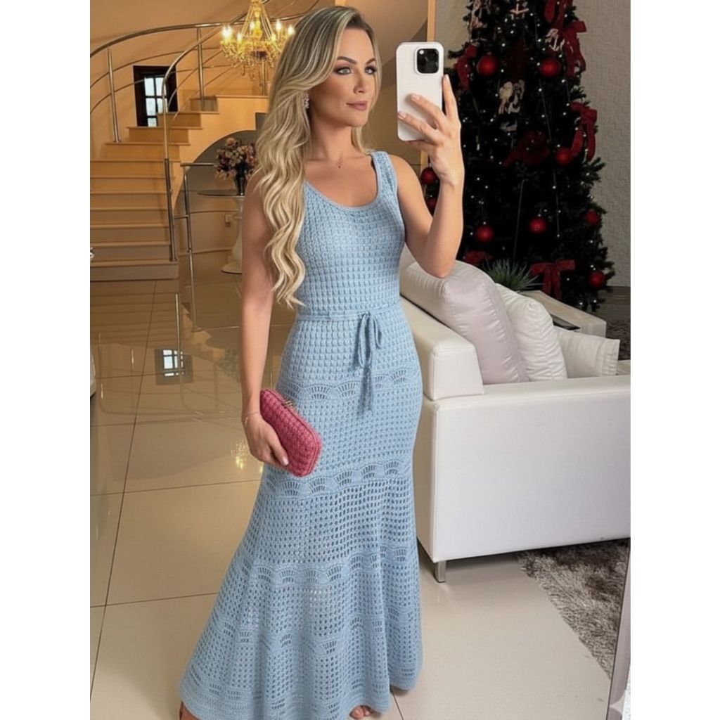 Vestido Feminino Midi Tricô Longo Vazado Renda Elegante Com Forro