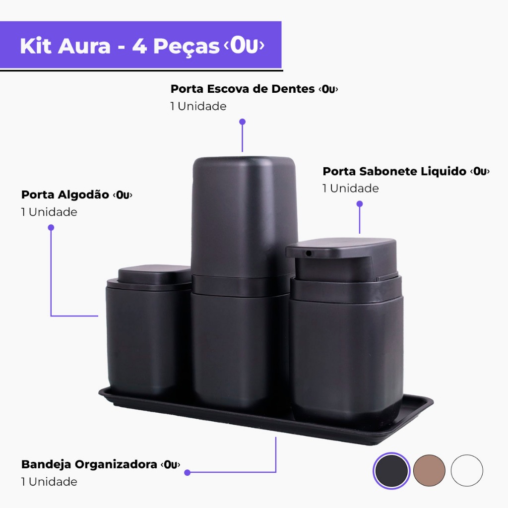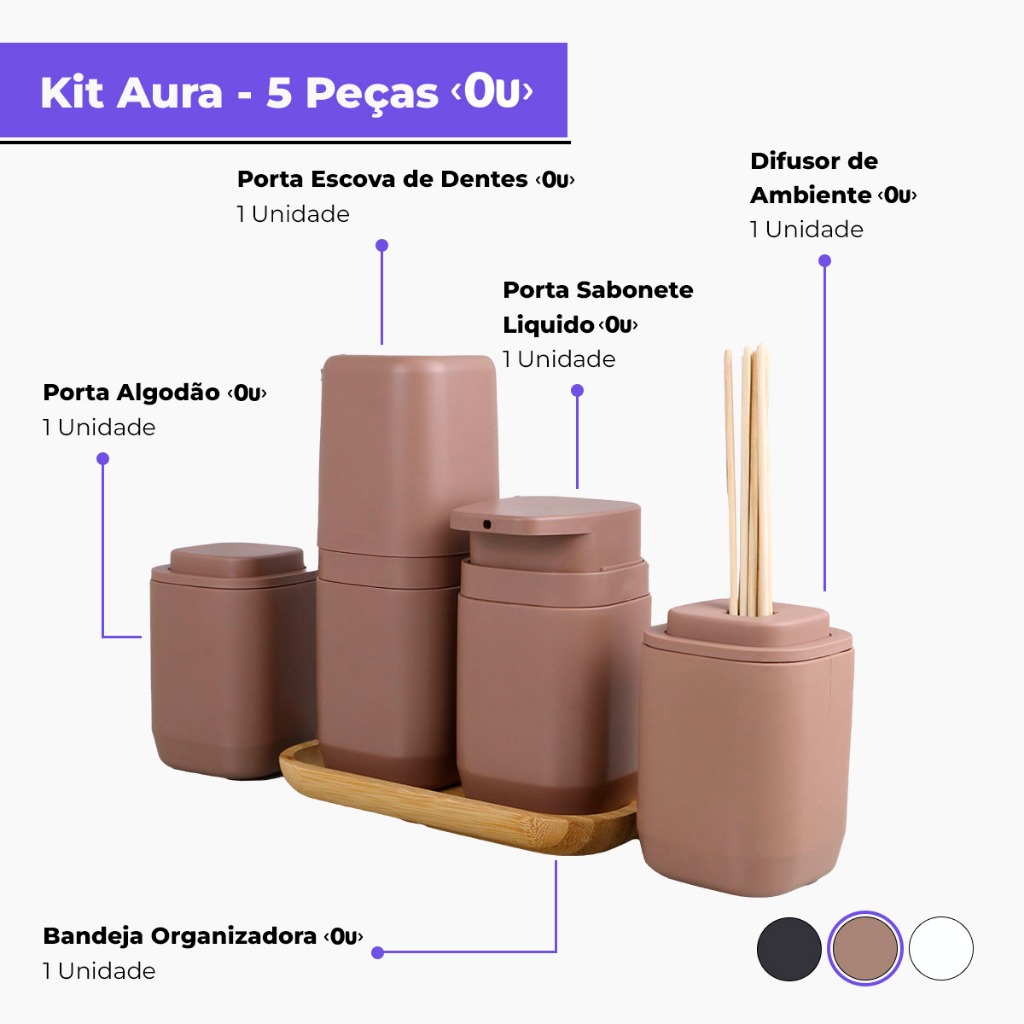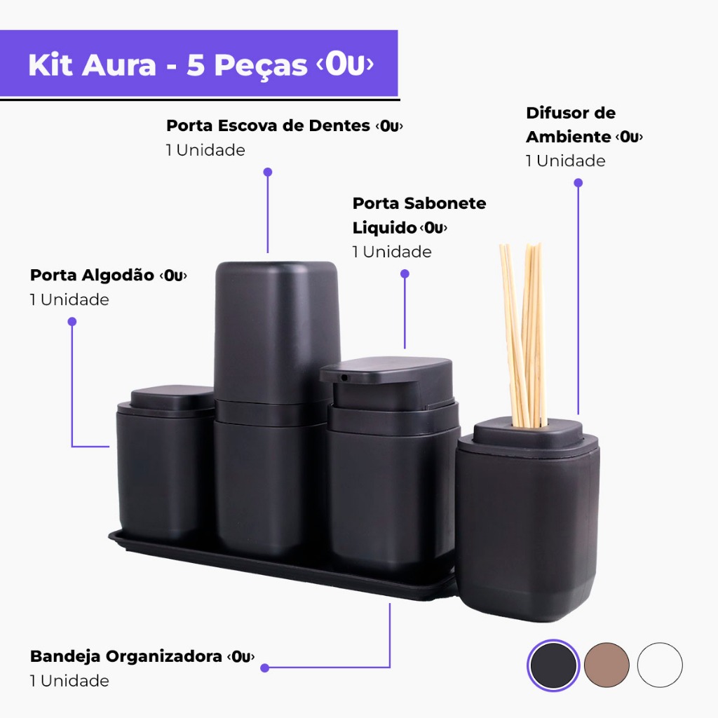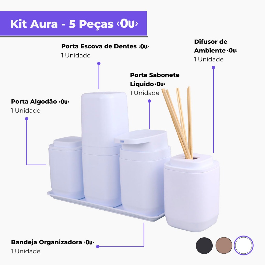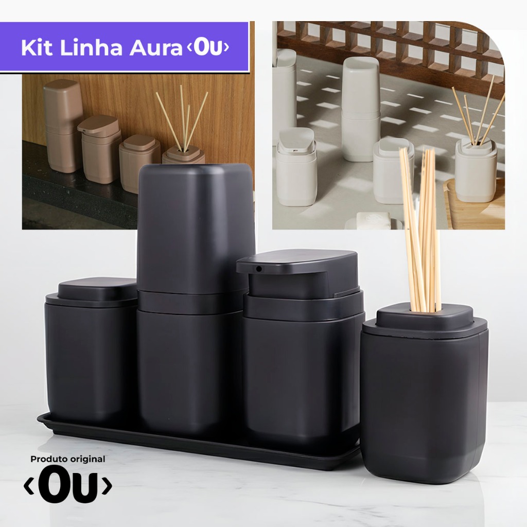 Kit Banheiro Aura Luxo - Porta Sabonete Líquido Porta Escovas Porta Algodão Bandeja e Difusor - Ou