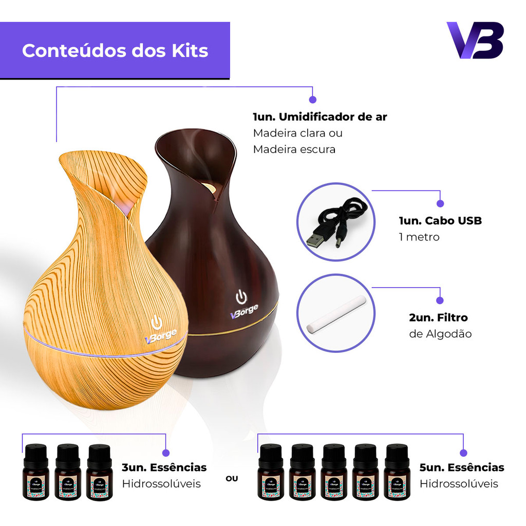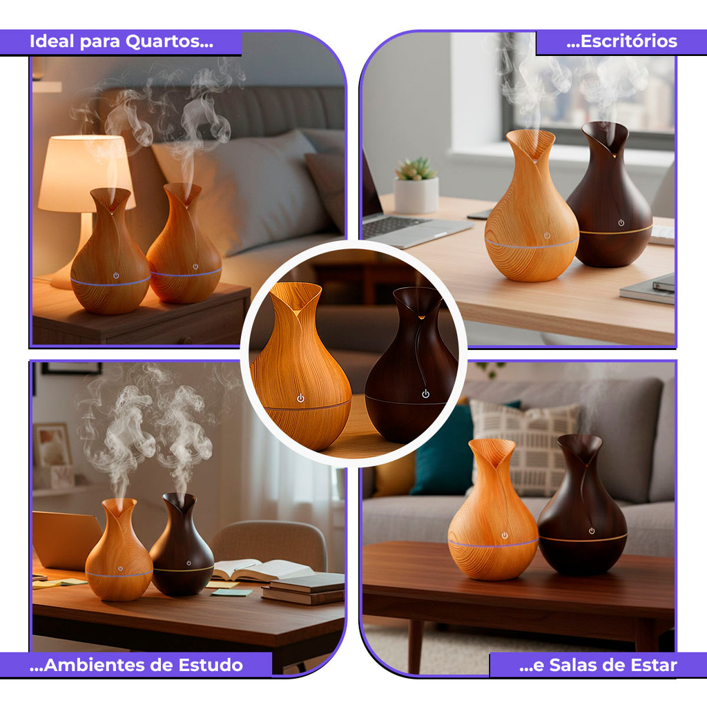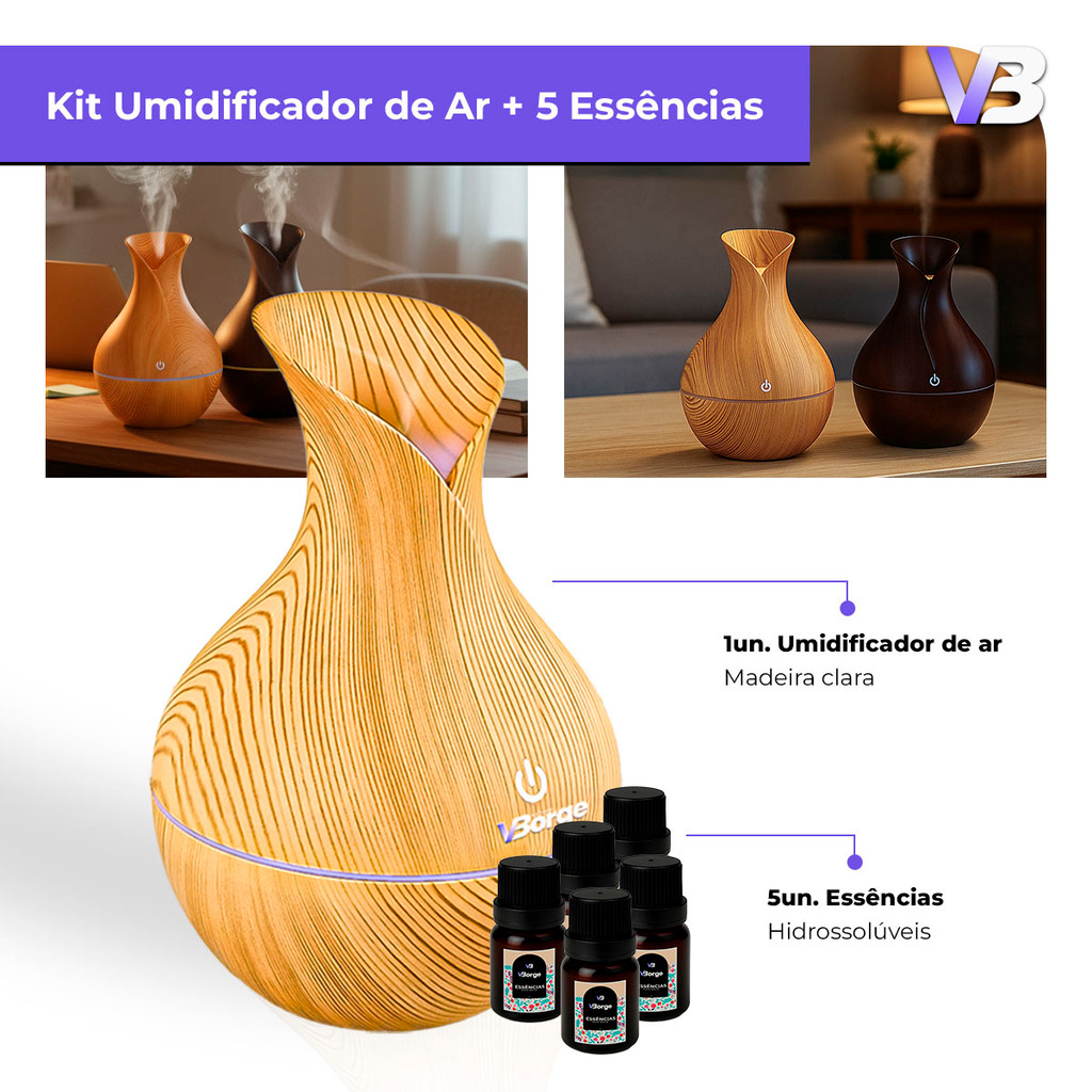 Umidificador De Ar + 5 Essências Hidrossolúvel | Difusor Modelo Vaso 200ml | Essências 10ml