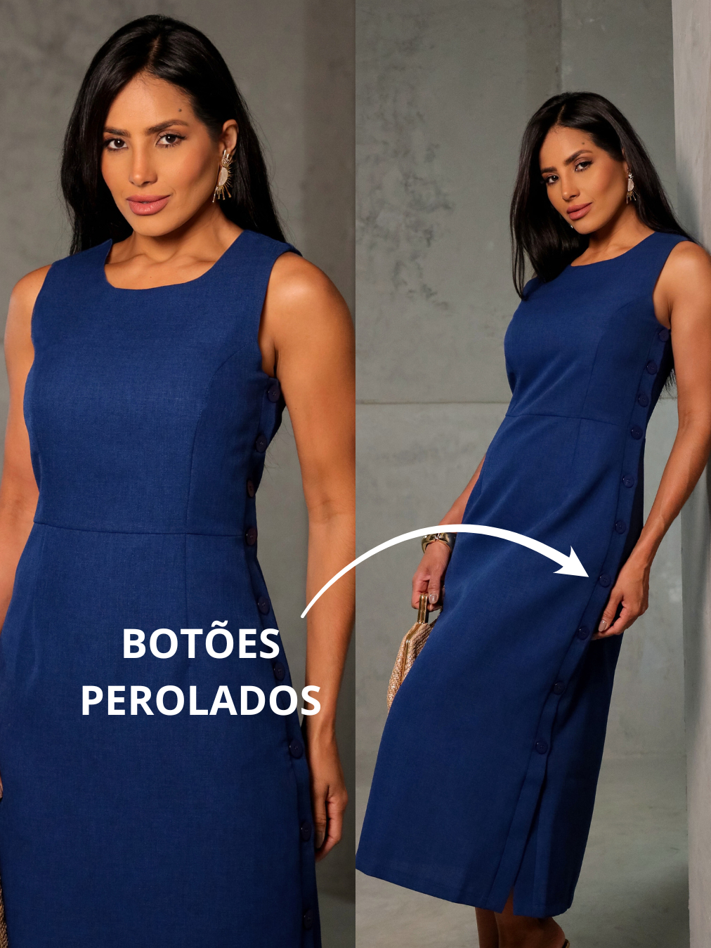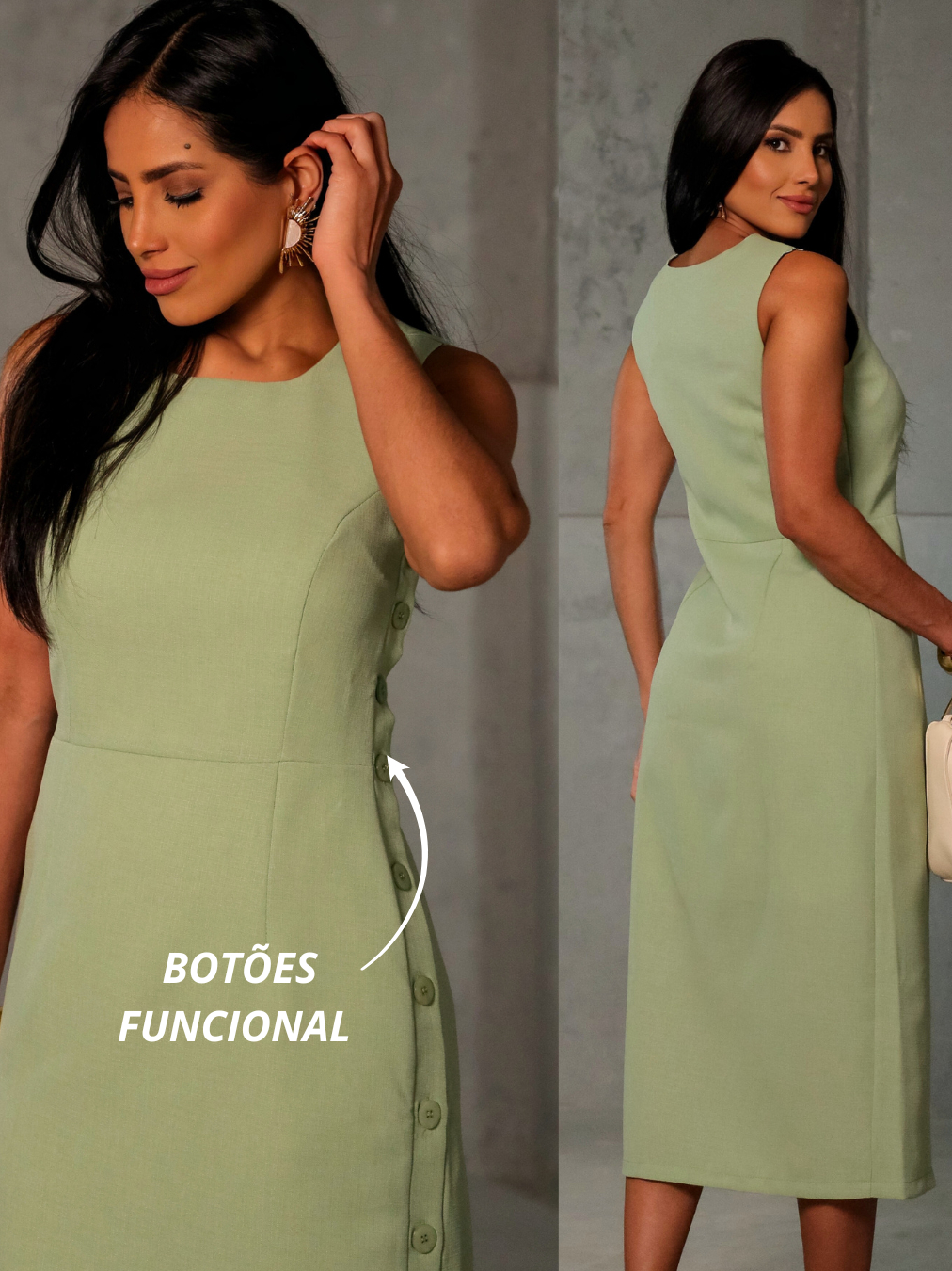 Vestido feminino Midi luxo forrado internamente com detalhes de botão regulável