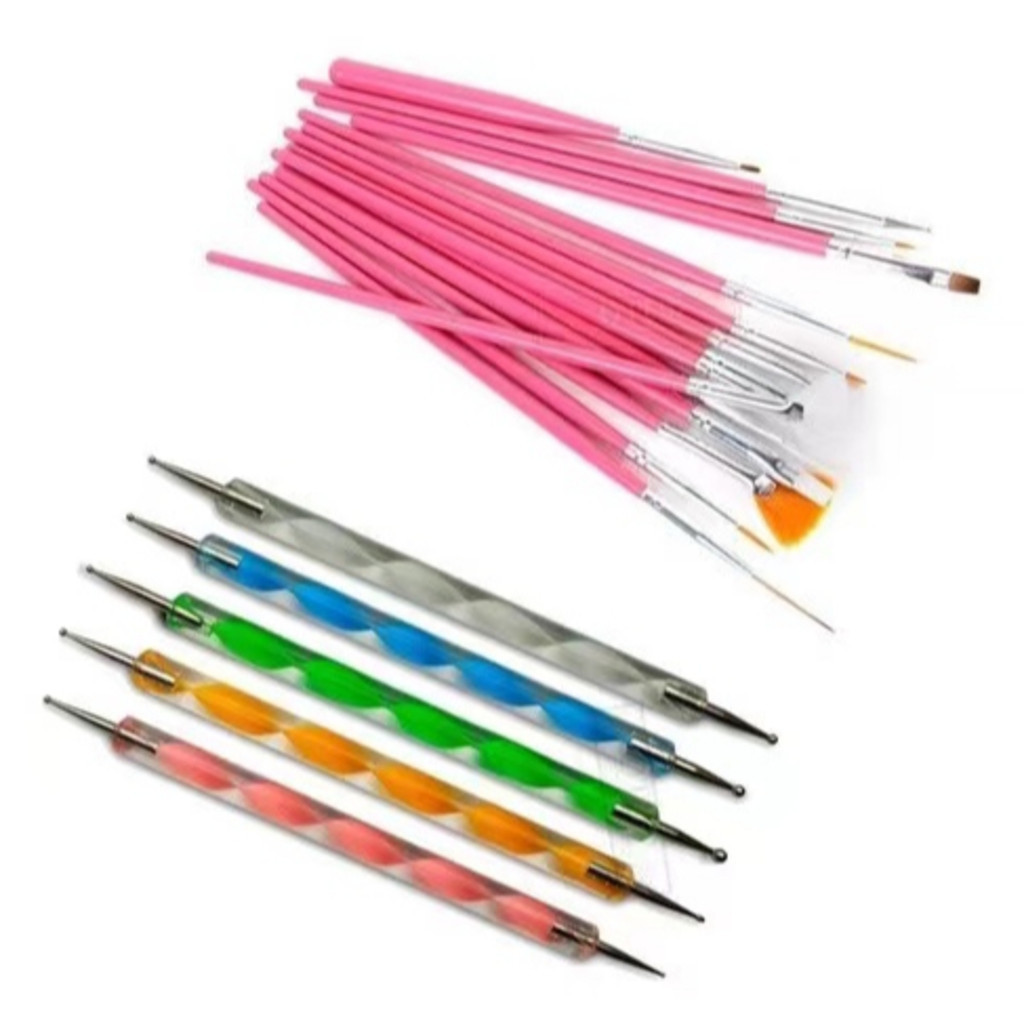Kit 15 Pincéis + 10 Boleadores Em 5 Pincéis Manicure Desenho