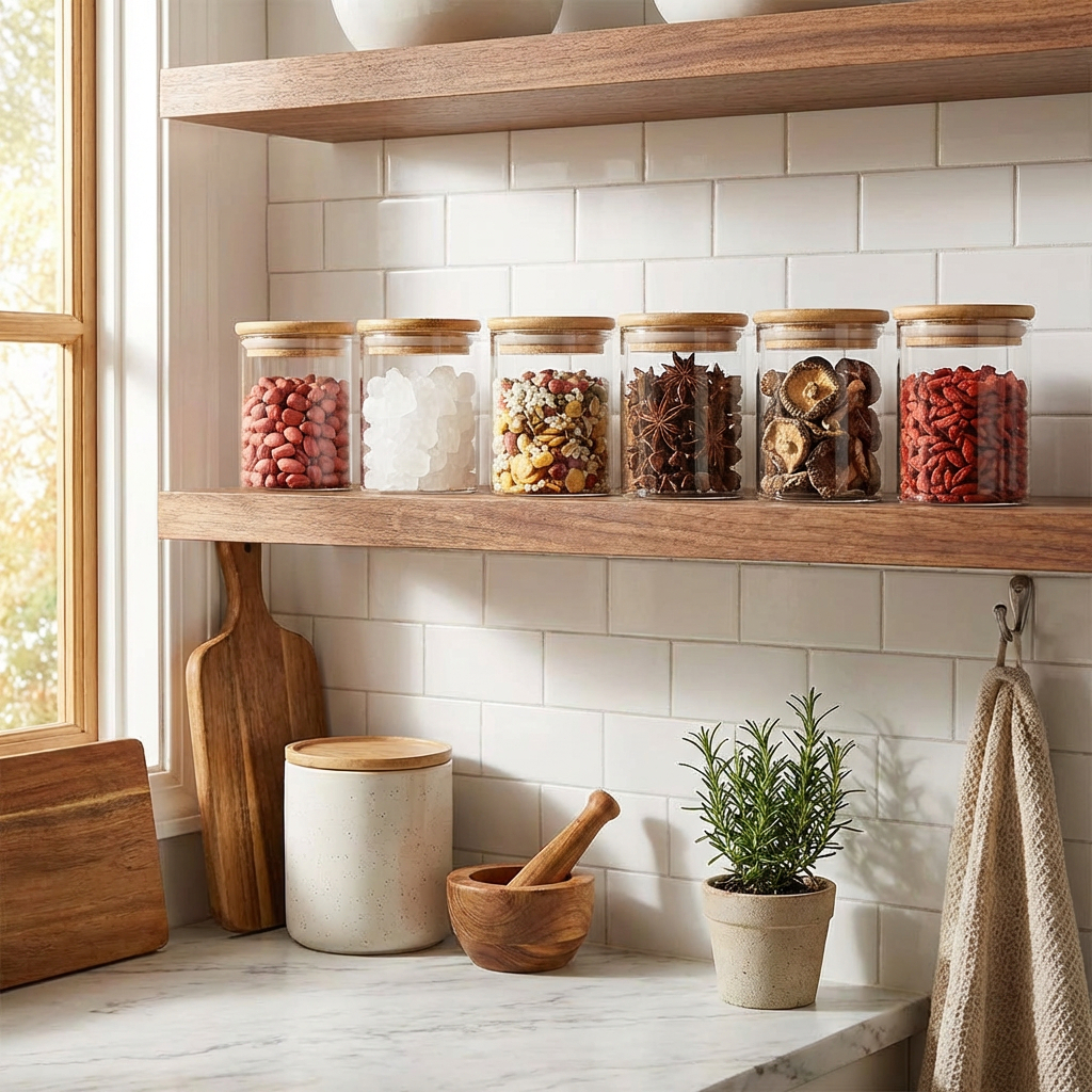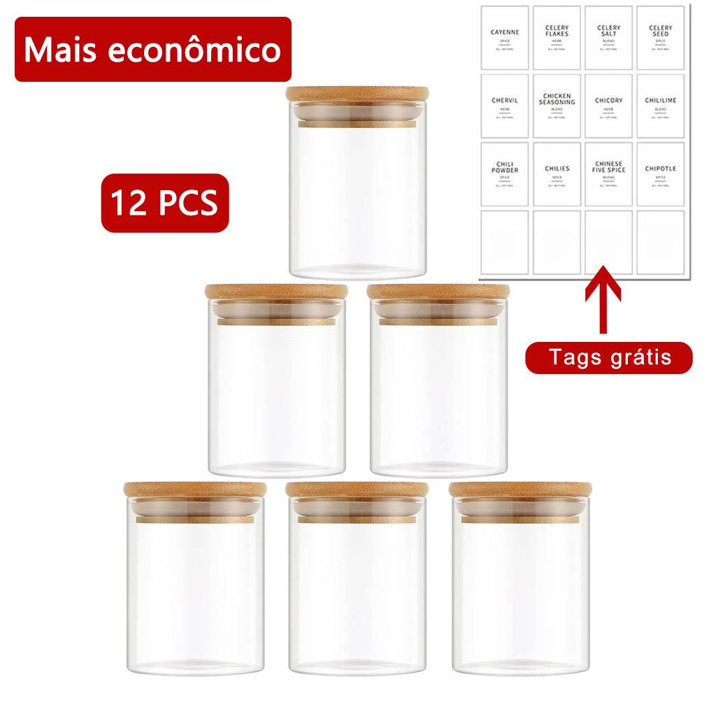 Kit 6 Potes de Vidro 200ml com Tampa Bambu Hermética - Porta Mantimentos Pequeno para Especiarias e Grãos