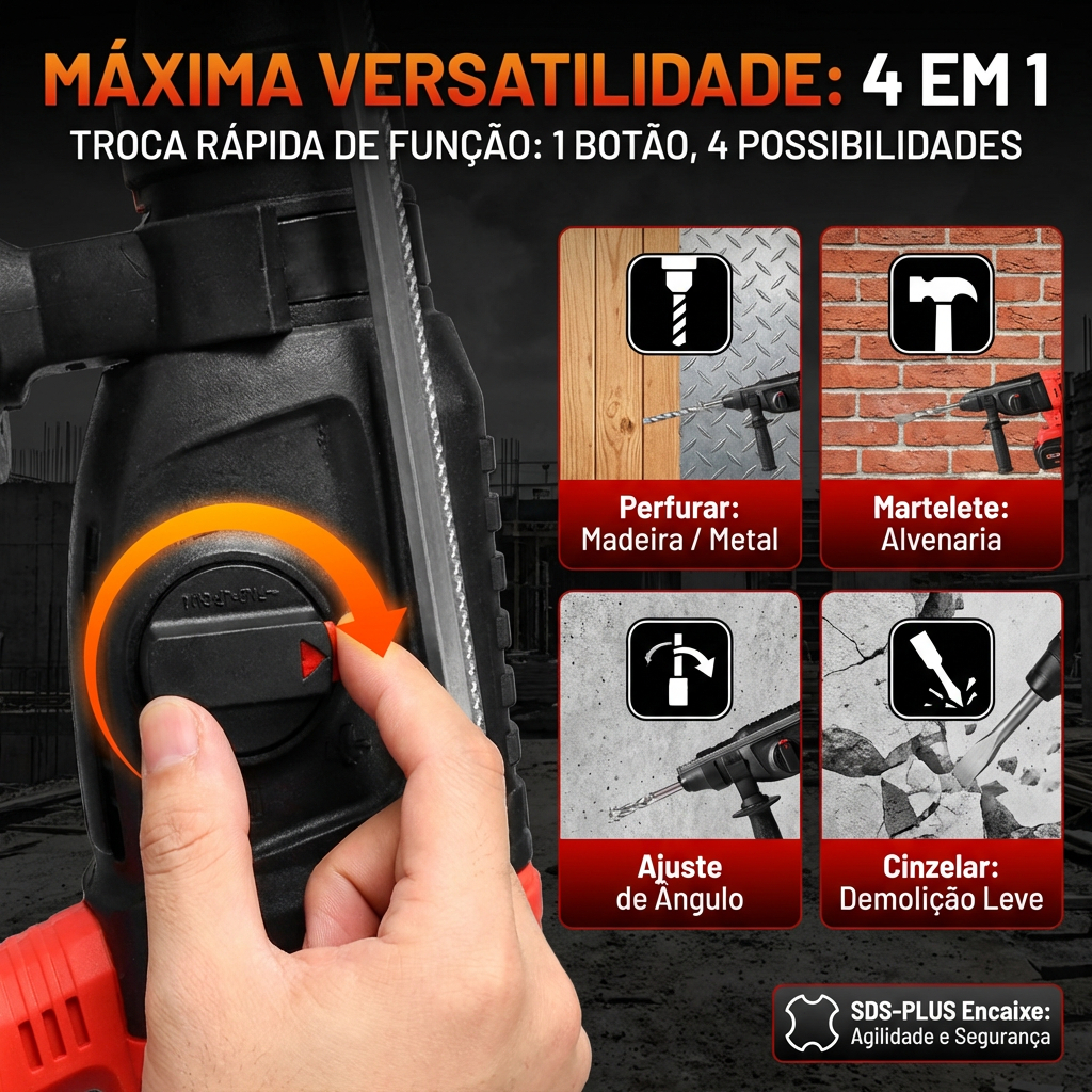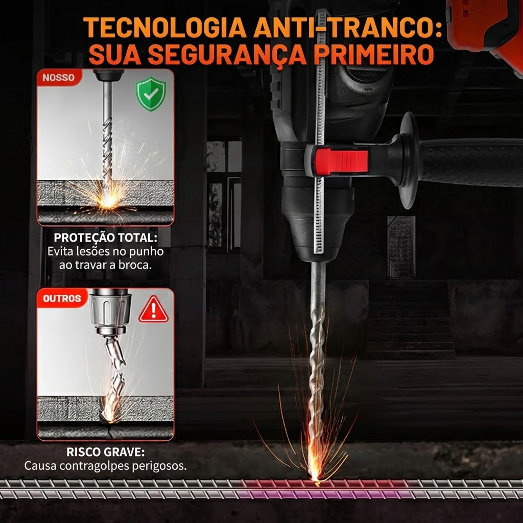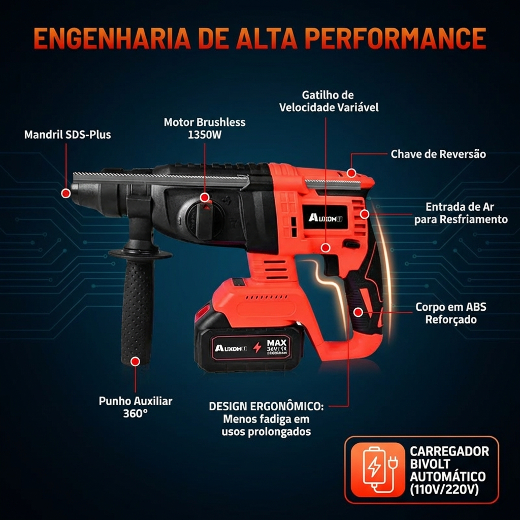 AUXOM Martelete Rompedor Perfurador Sem Fio 1350W Profissional 21V - Com 2 Baterias, Maleta e Brocas