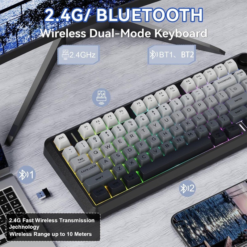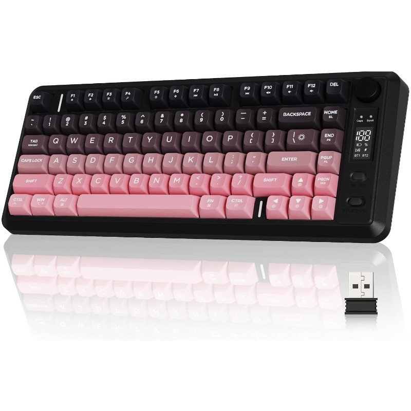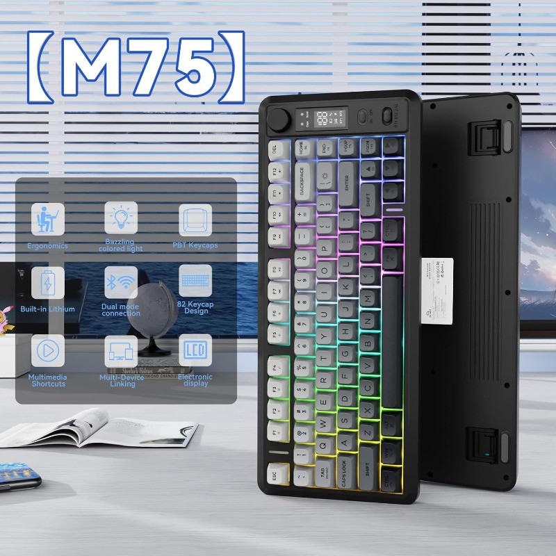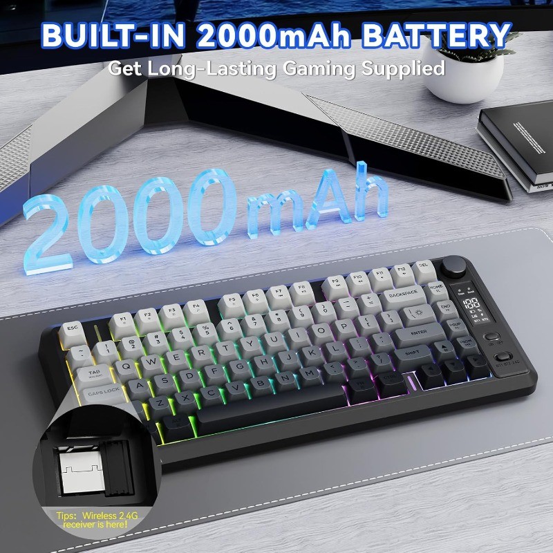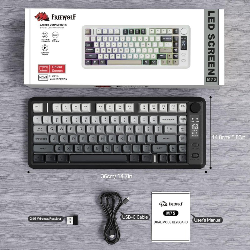 FREEWOLF M75 Teclado Para Jogos Sem Fio RGB Retroiluminado Recarregável 2000mAh Bateria Membrana Display Inteligente E B