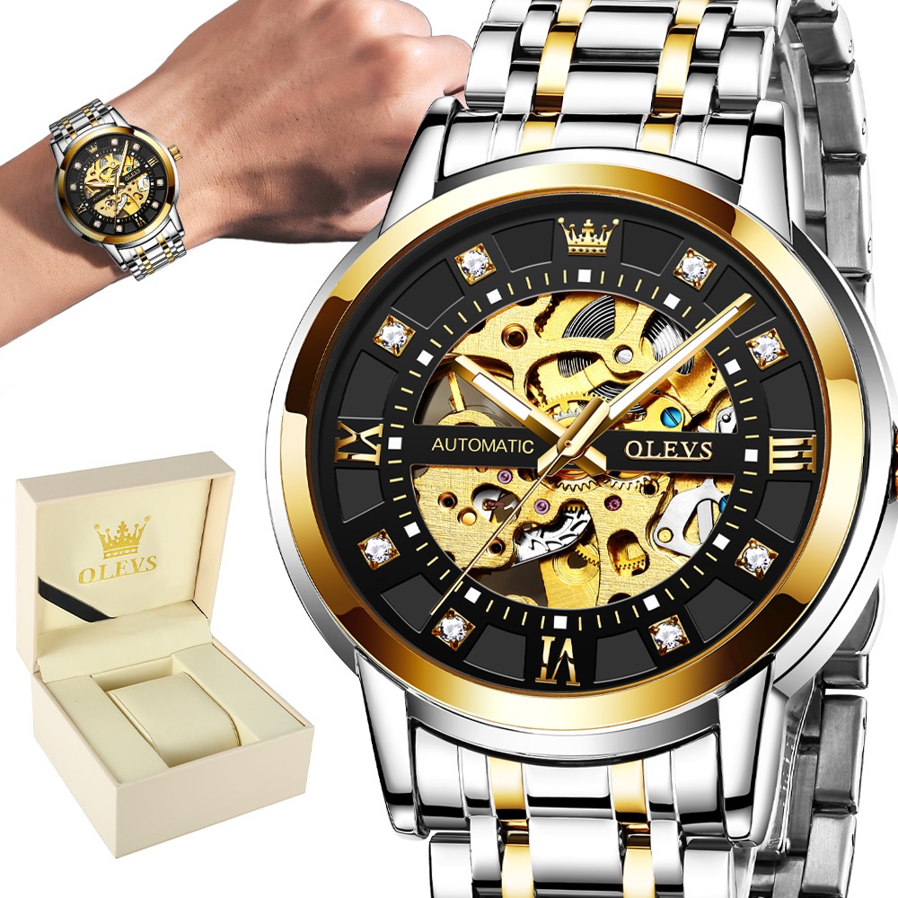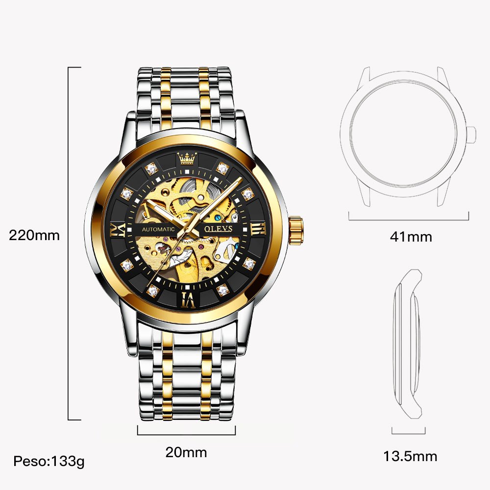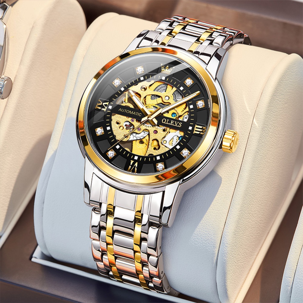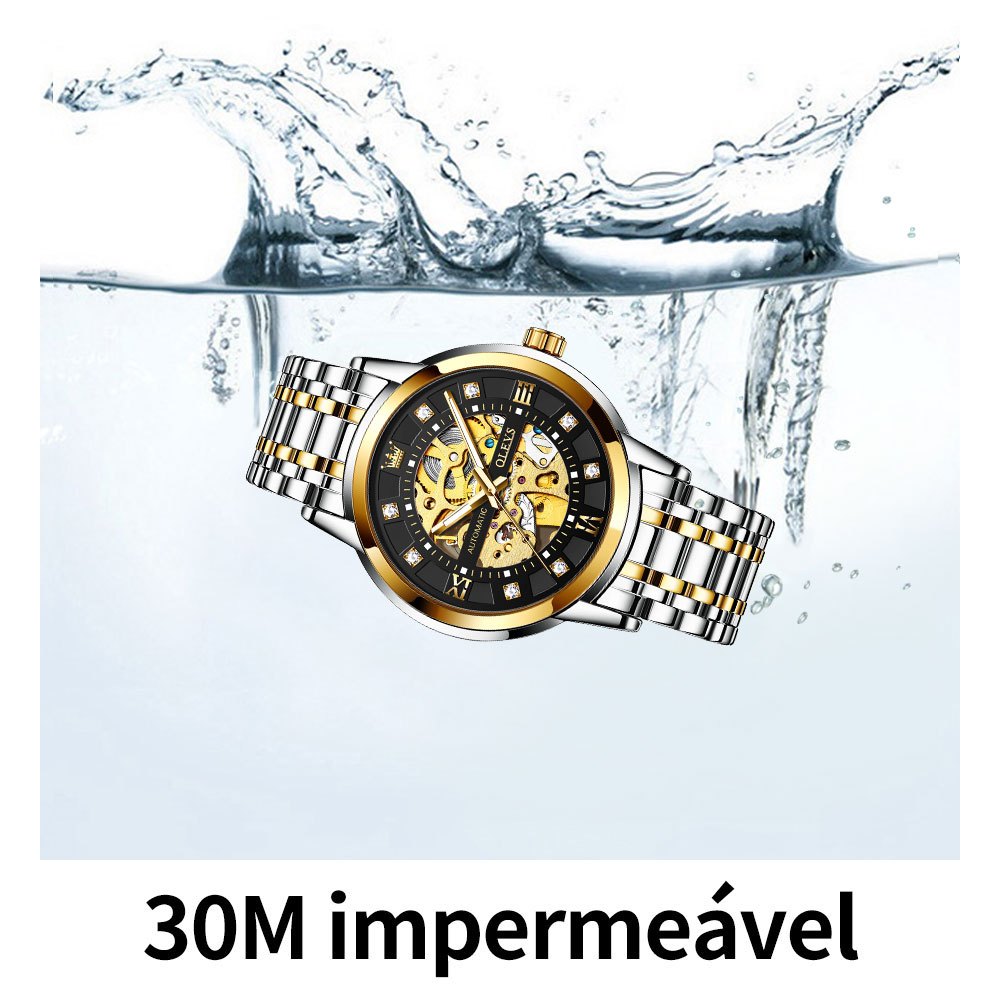 OLEVS Relógio Masculino à Prova D'Água Dourado Preto Luxo Orient Mecânico Design Oco Caixa Automático 9901