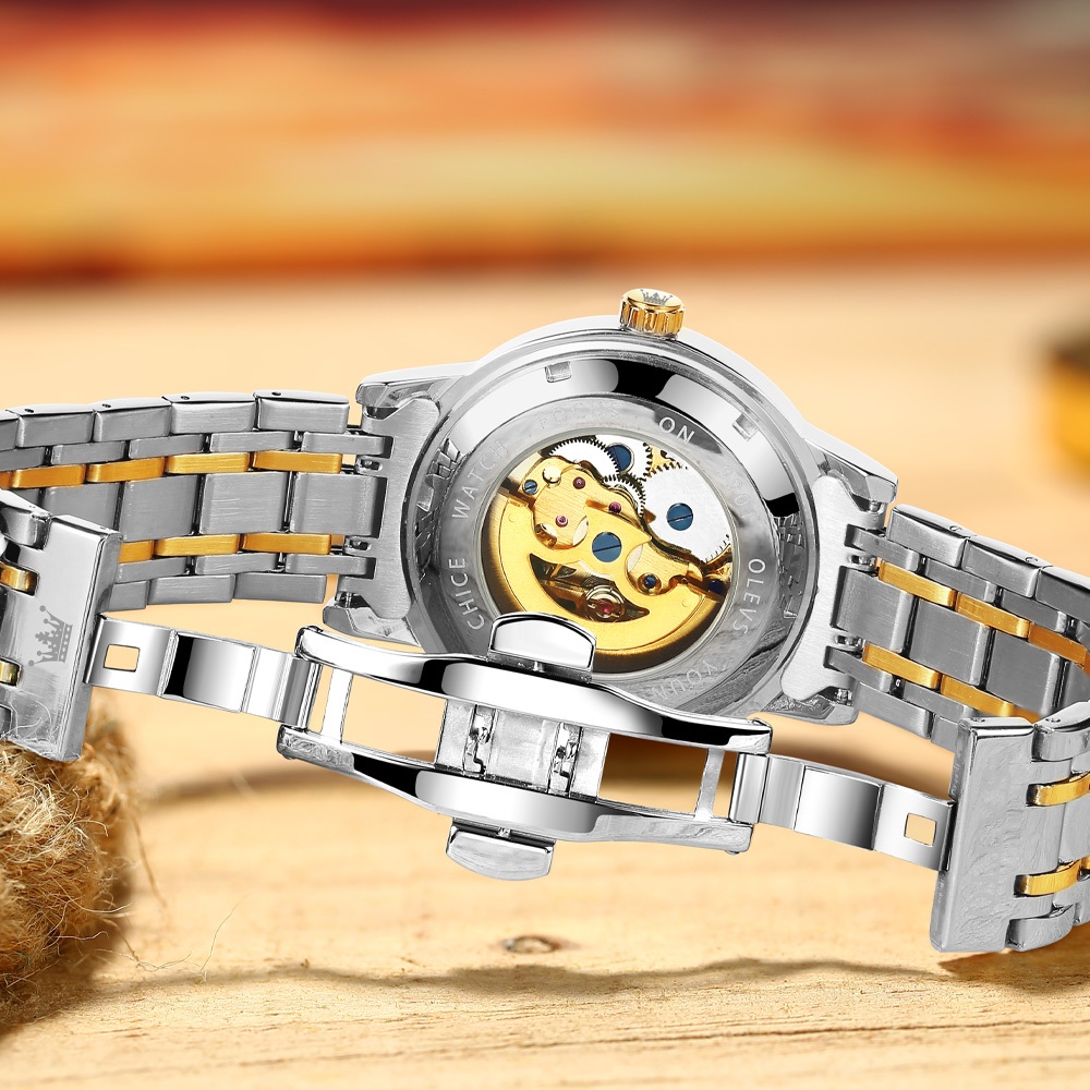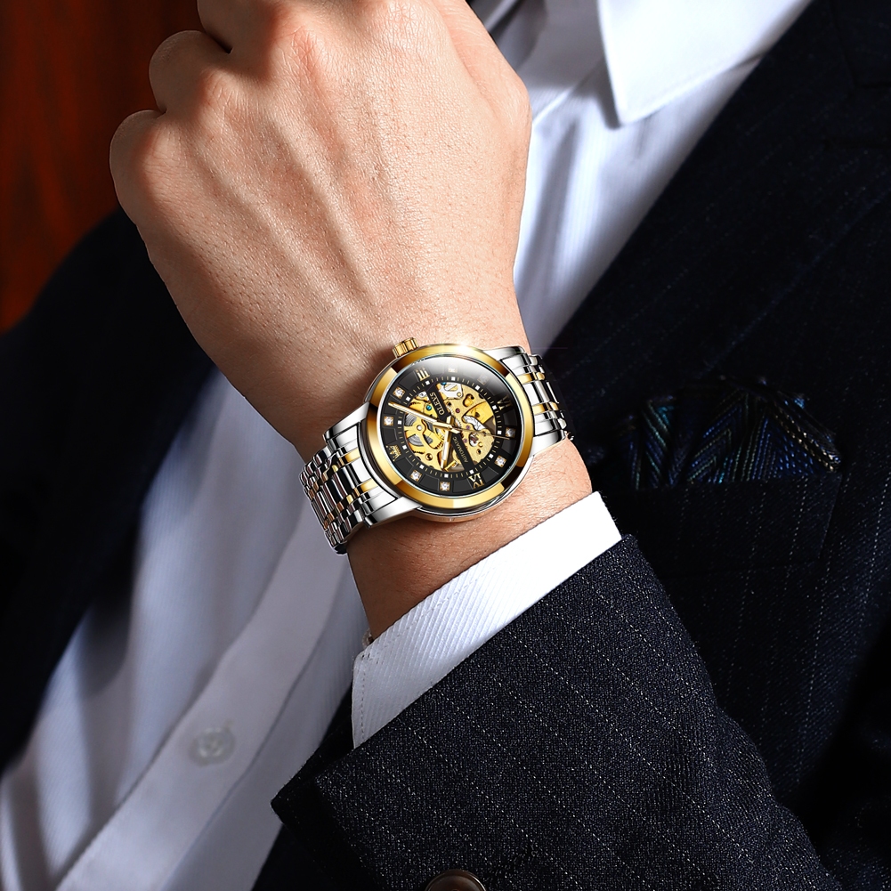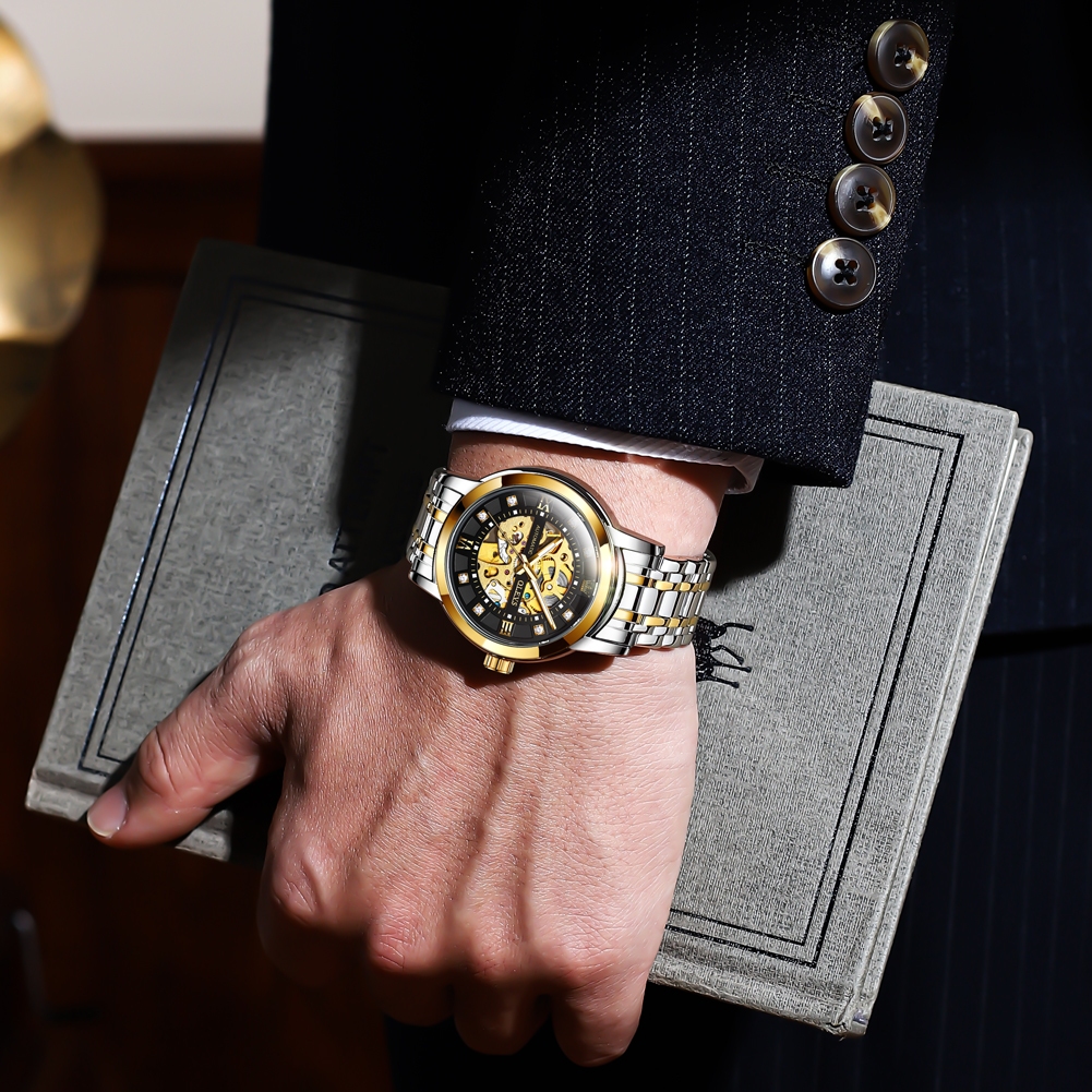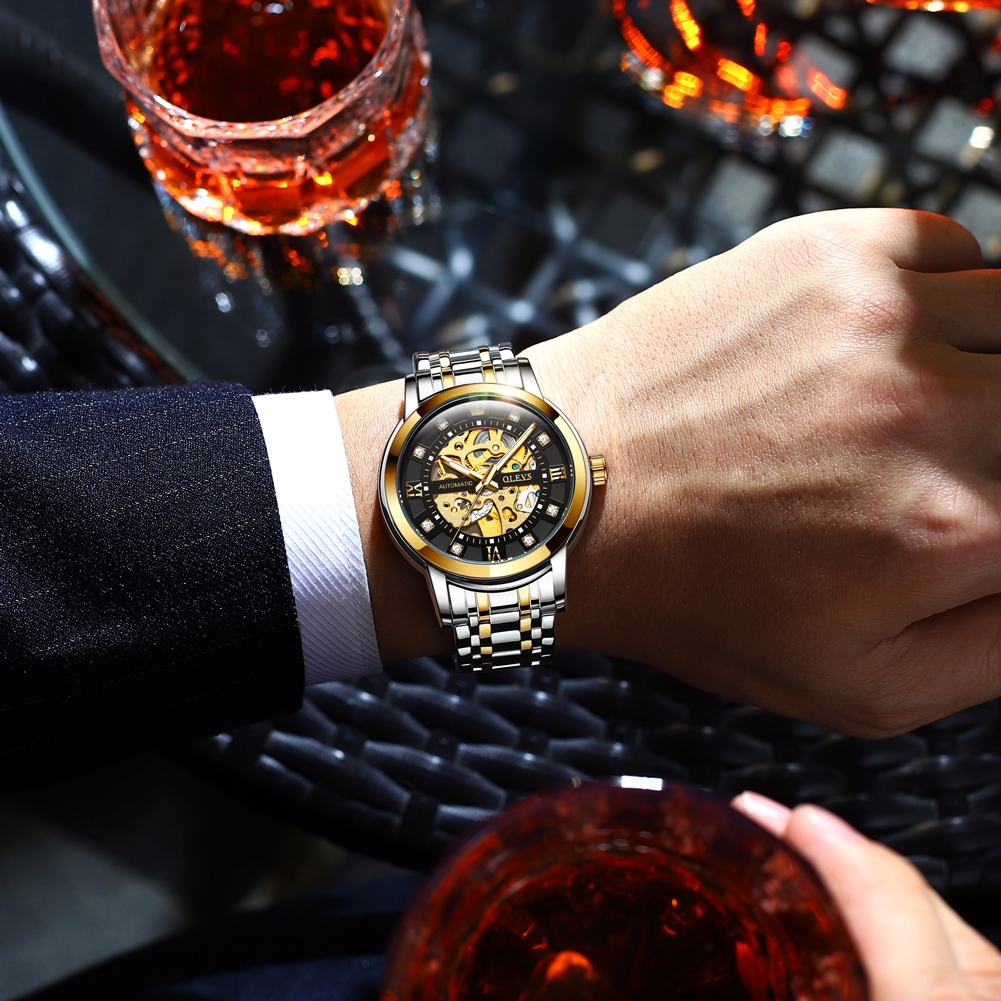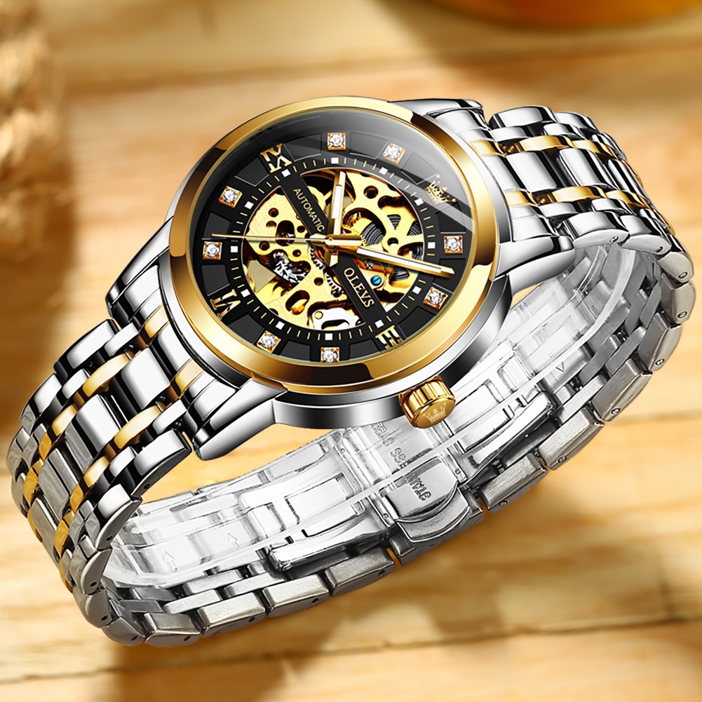 OLEVS Relógio Masculino à Prova D'Água Dourado Preto Luxo Orient Mecânico Design Oco Caixa Automático 9901