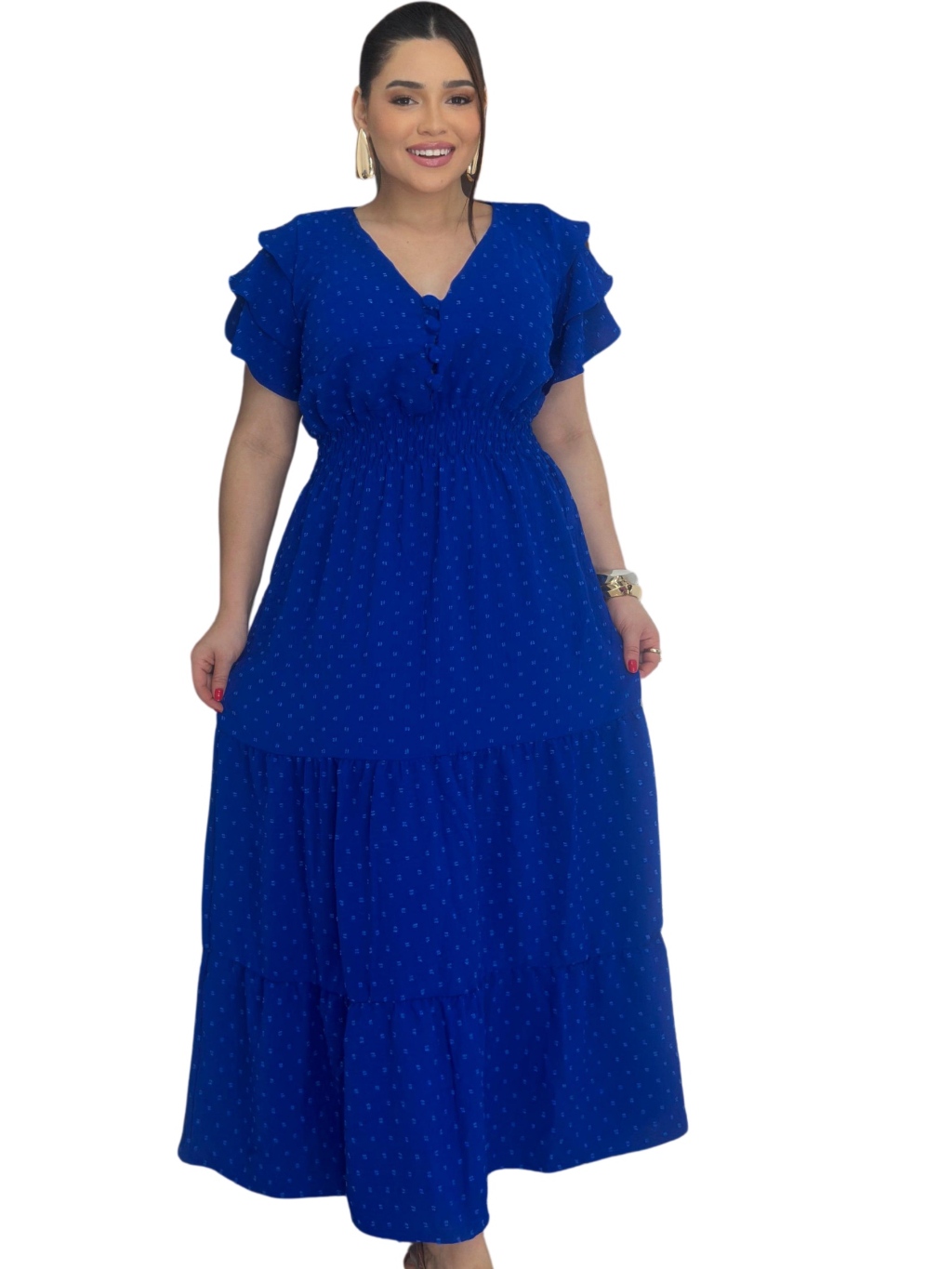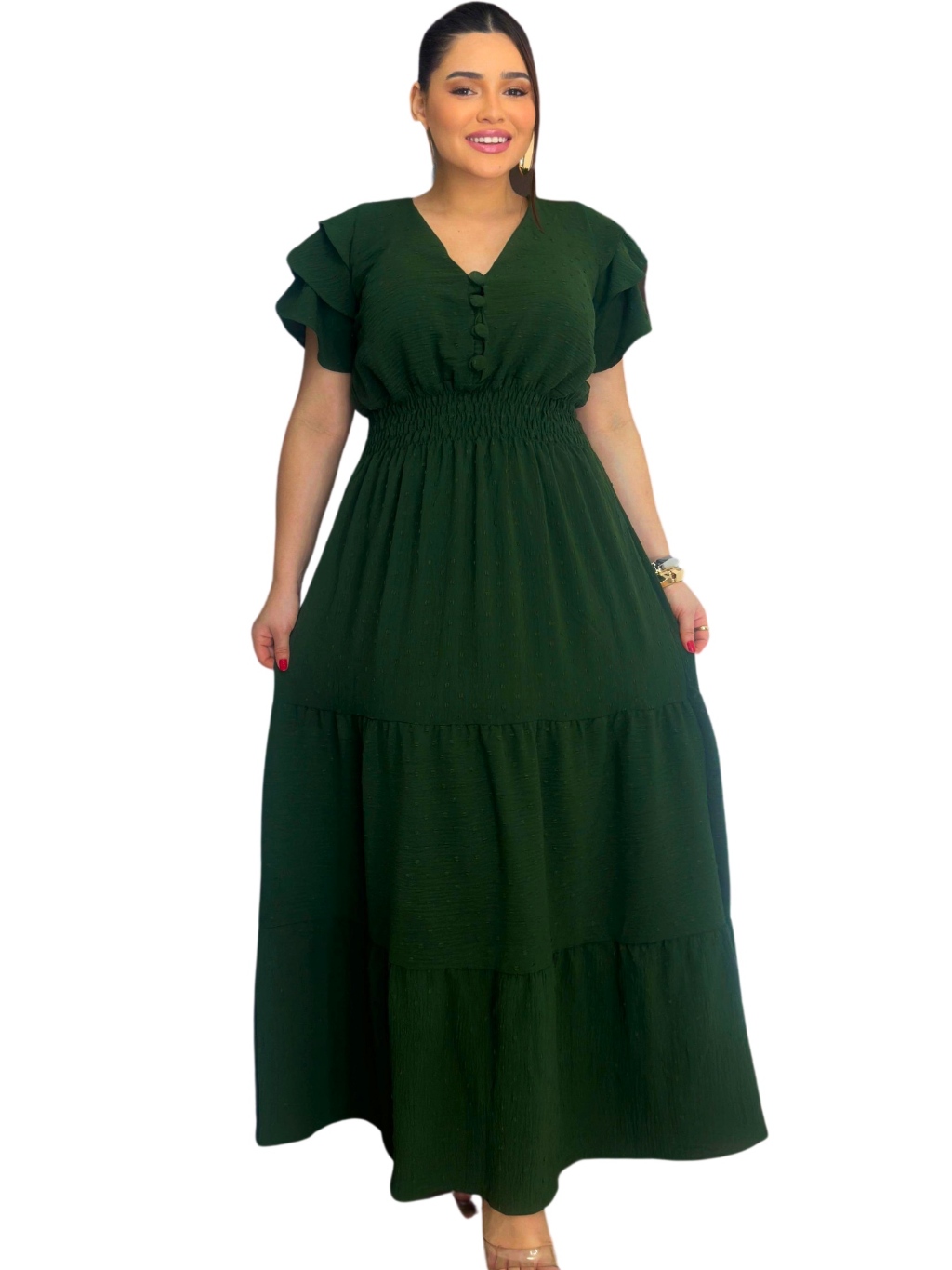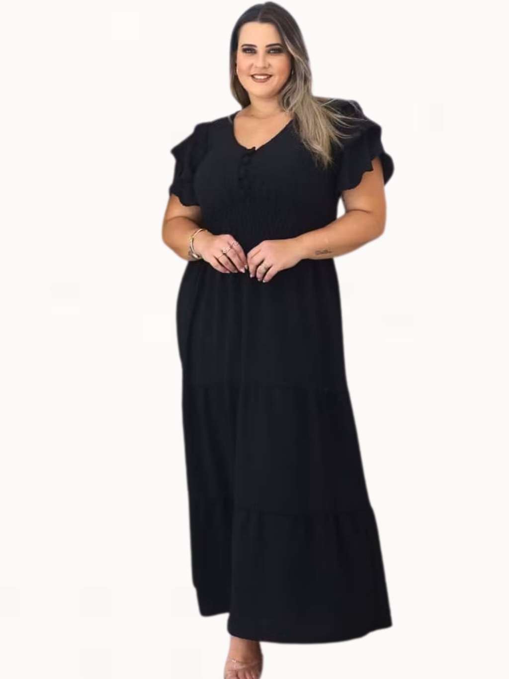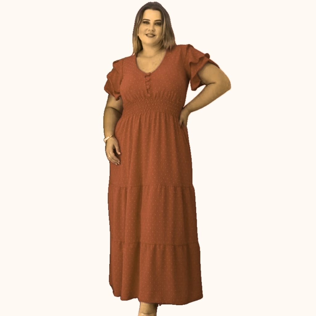 Vestido Longo 3 Marias Luxo Gola V Discreto Com Manga Estilo Sino Casual Plus Size