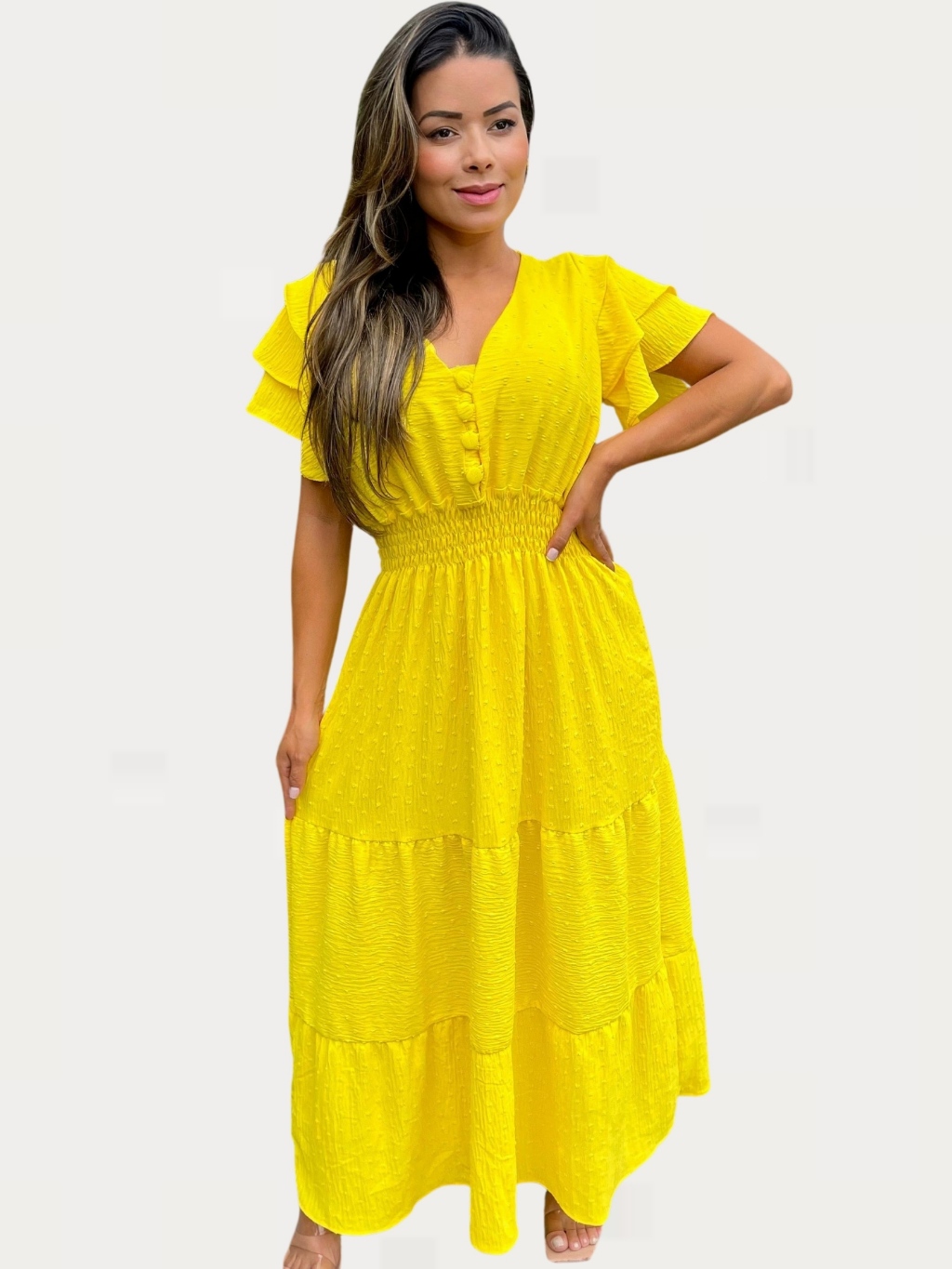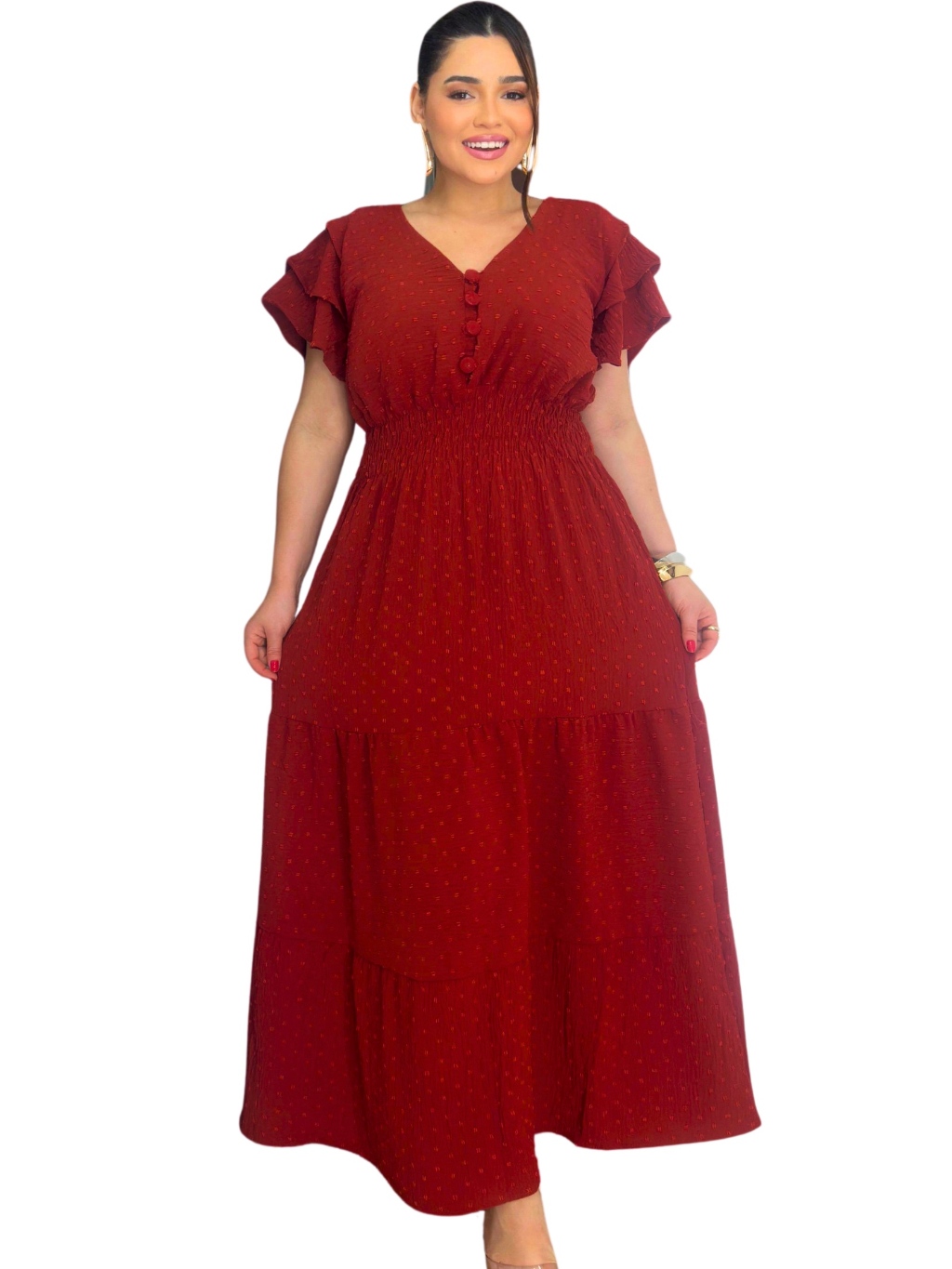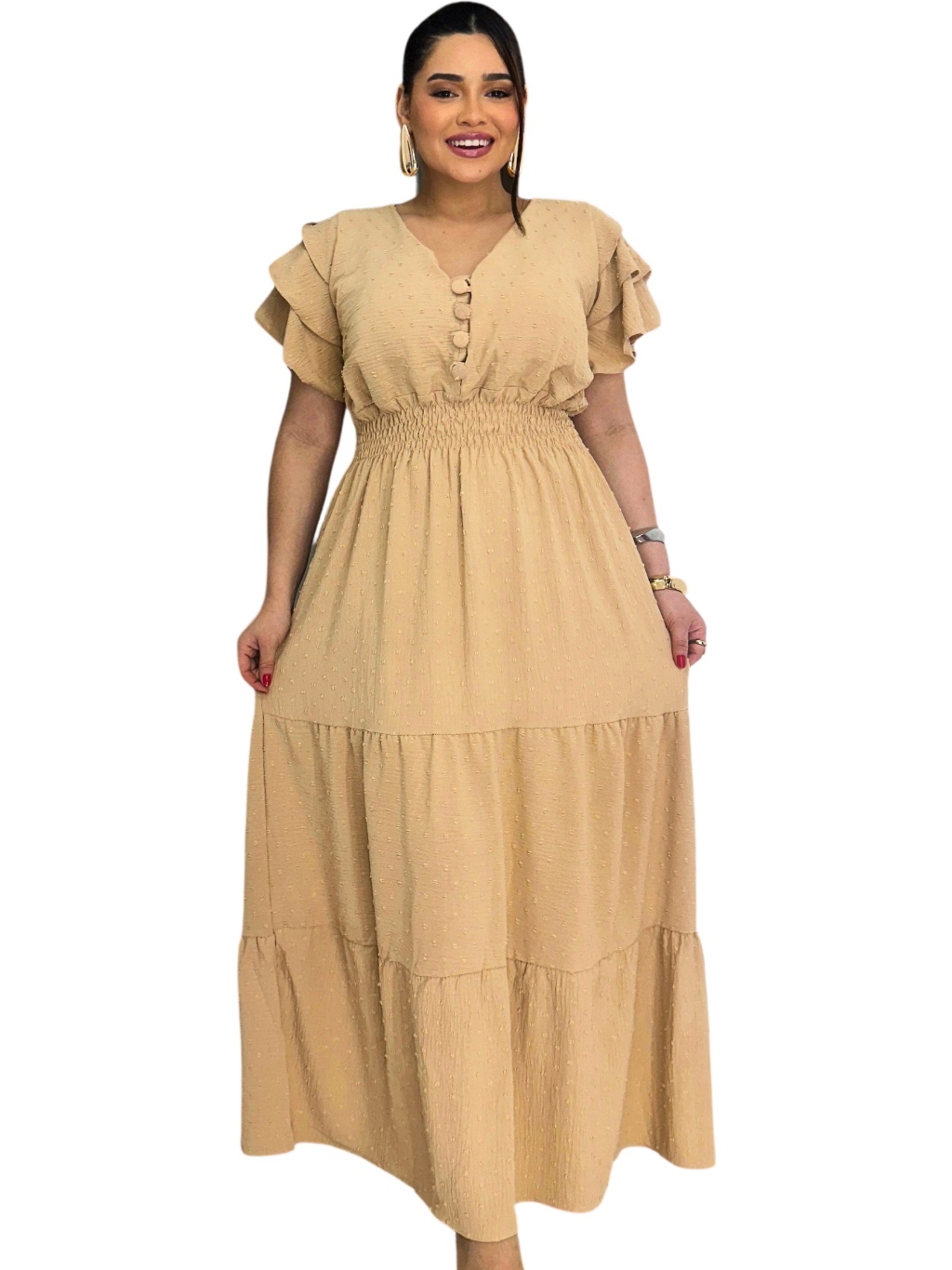 Vestido Longo 3 Marias Luxo Gola V Discreto Com Manga Estilo Sino Casual Plus Size
