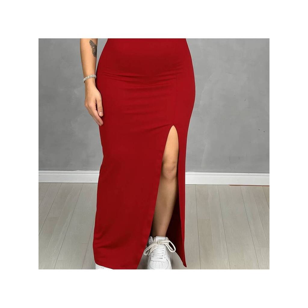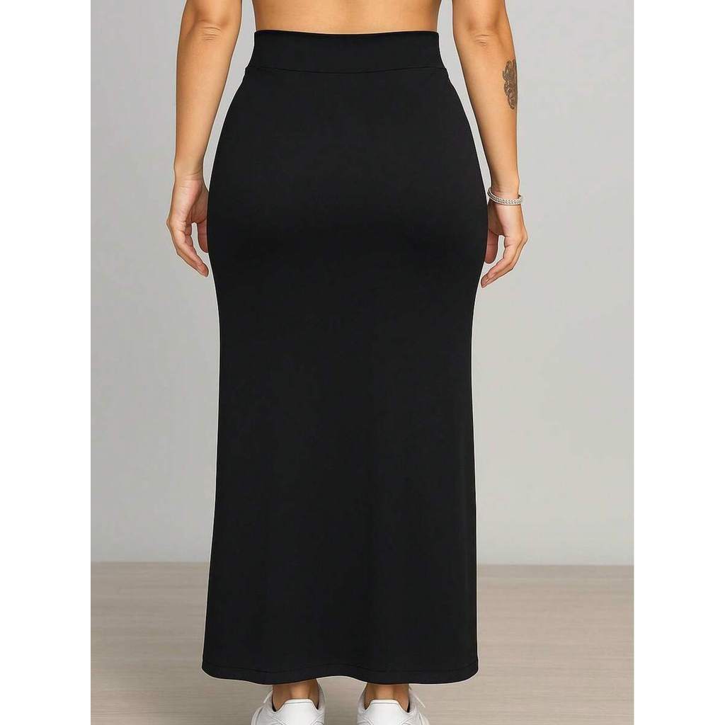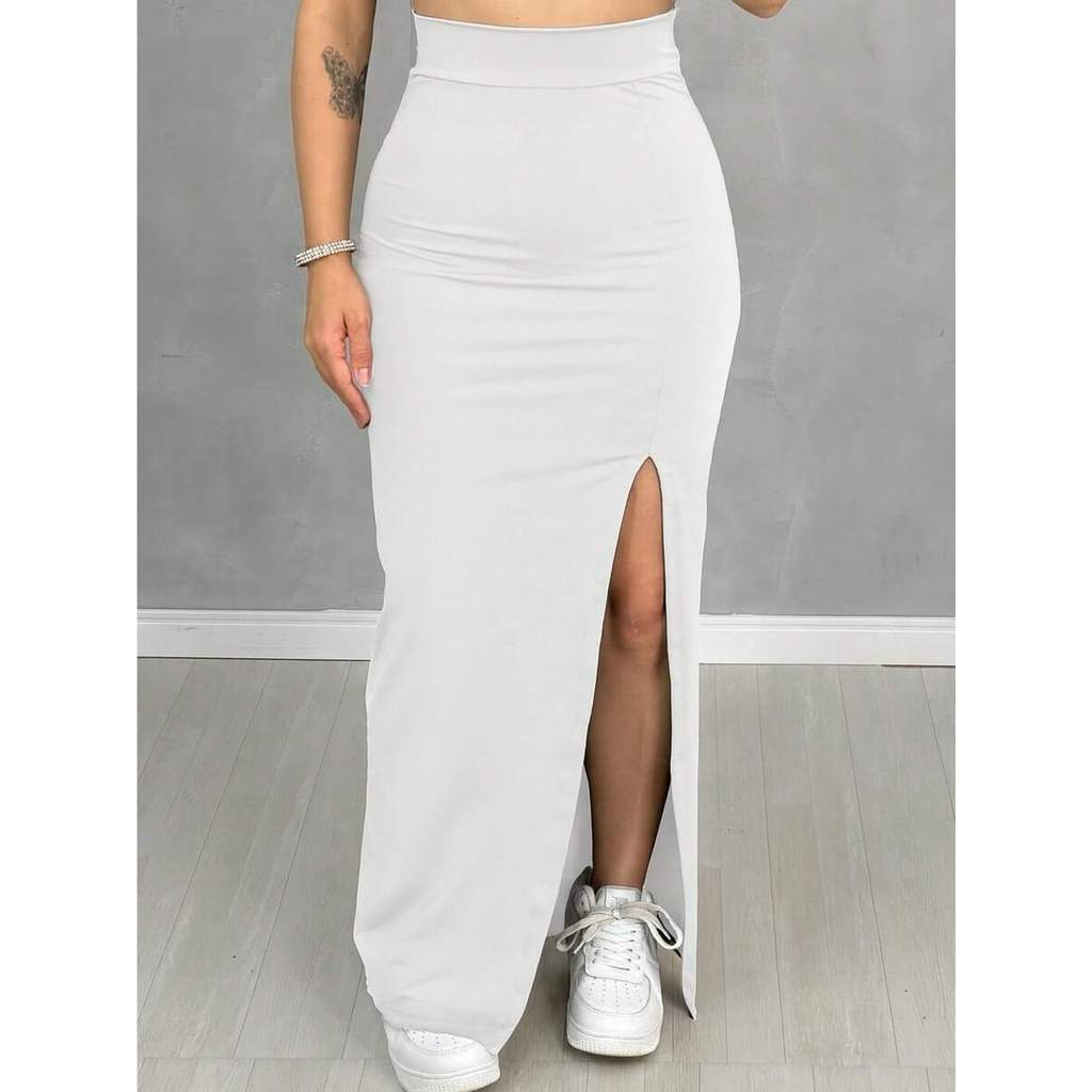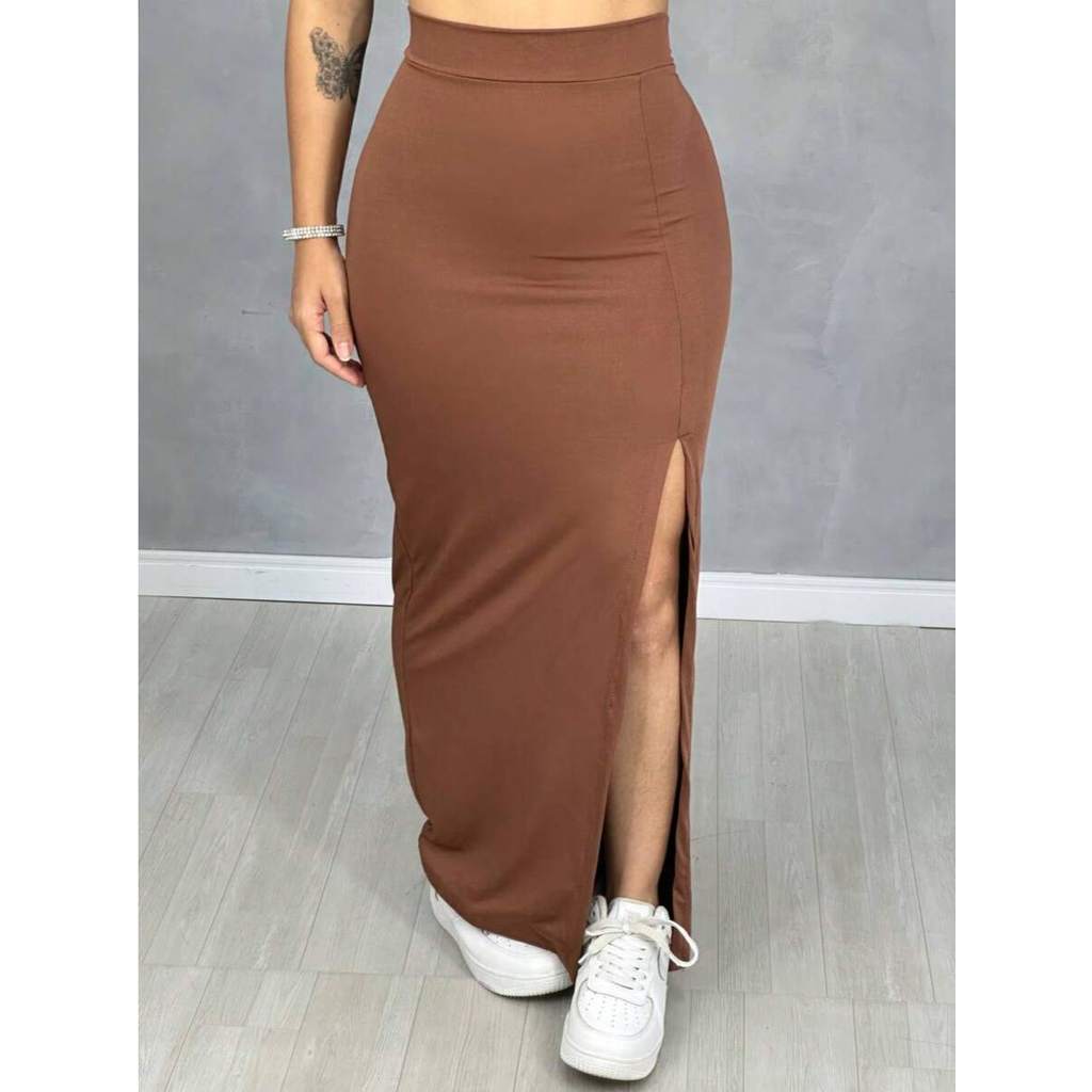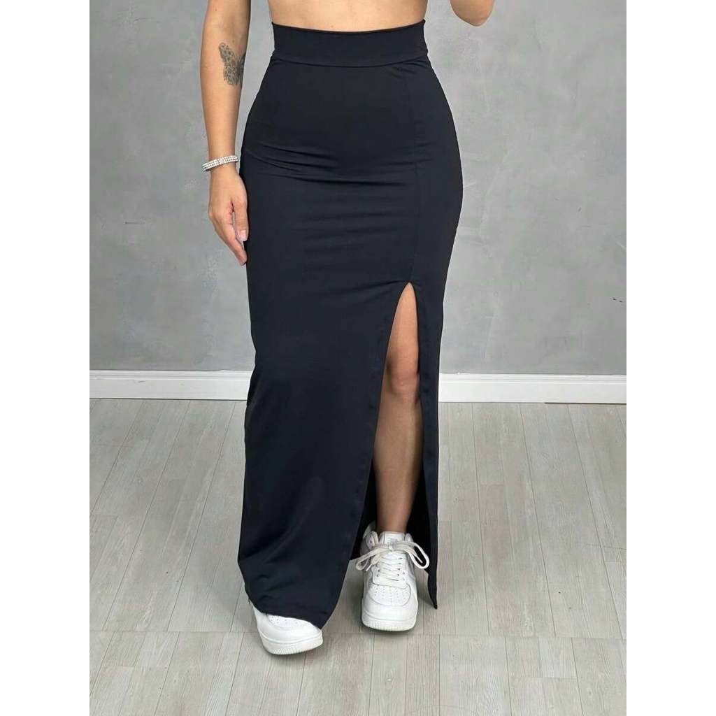 Saia De Cintura Alta Longa Com Fenda Lateral Midi Moda
