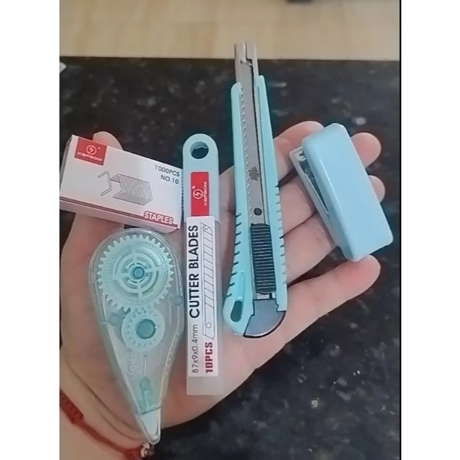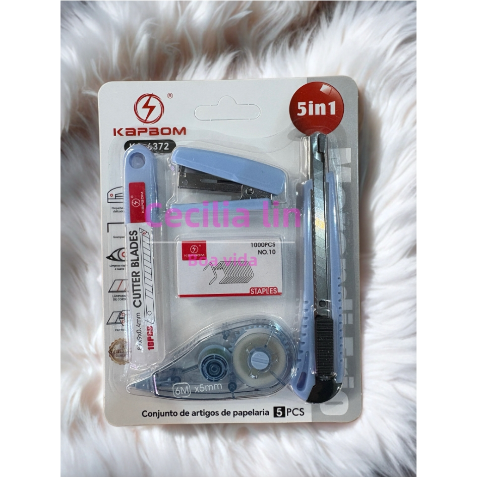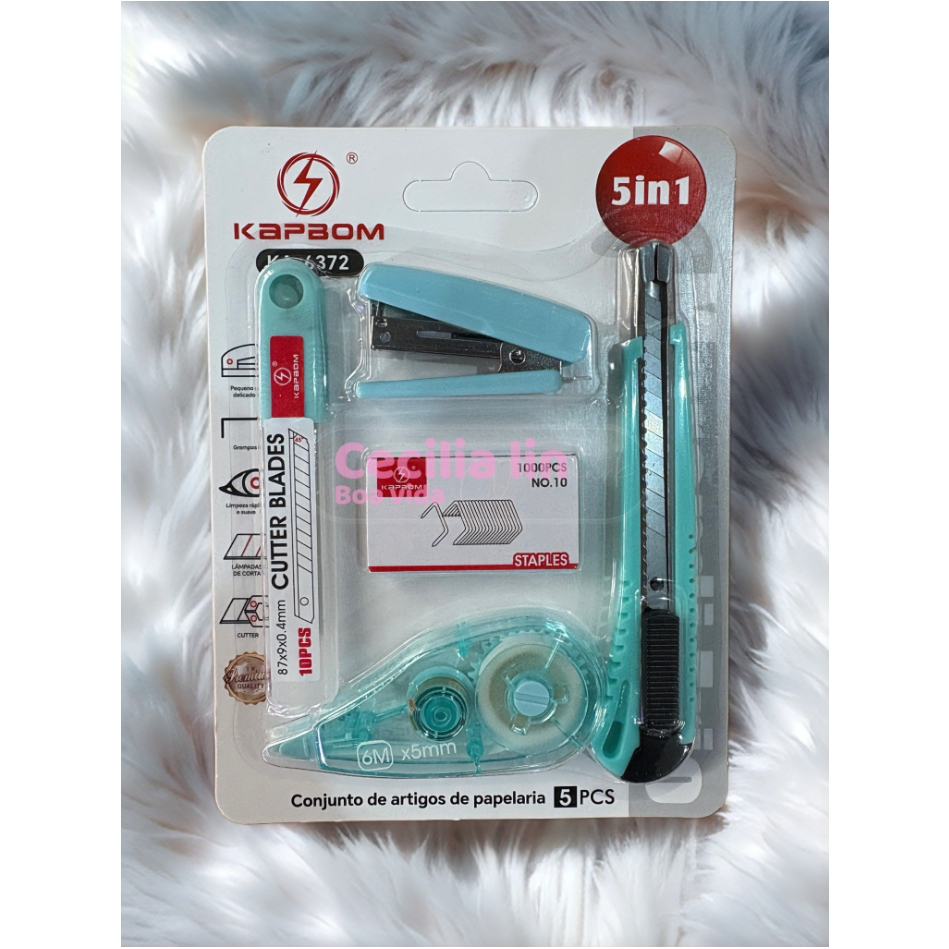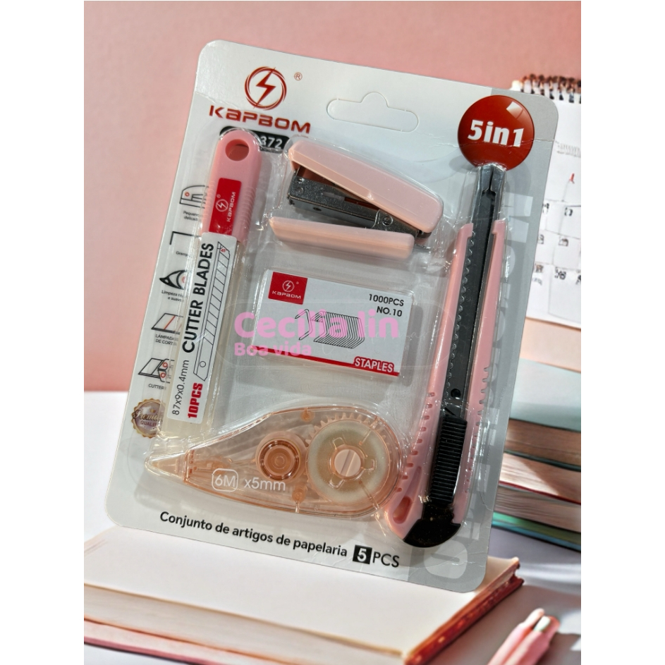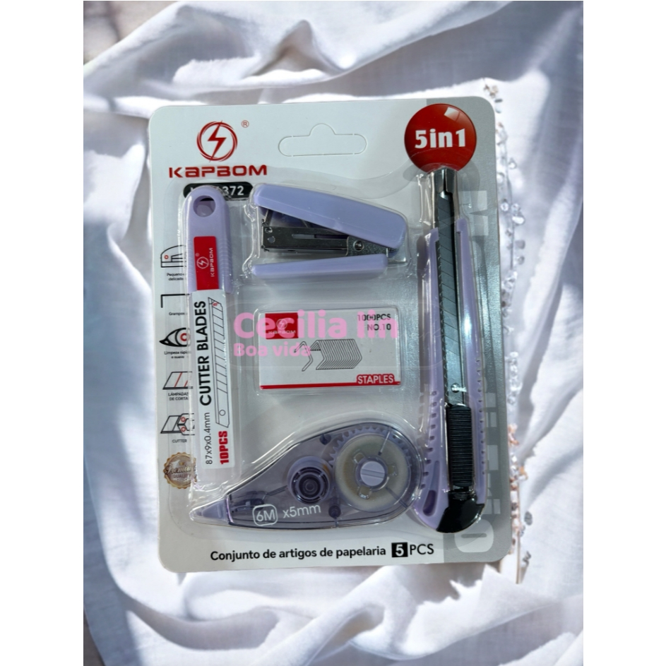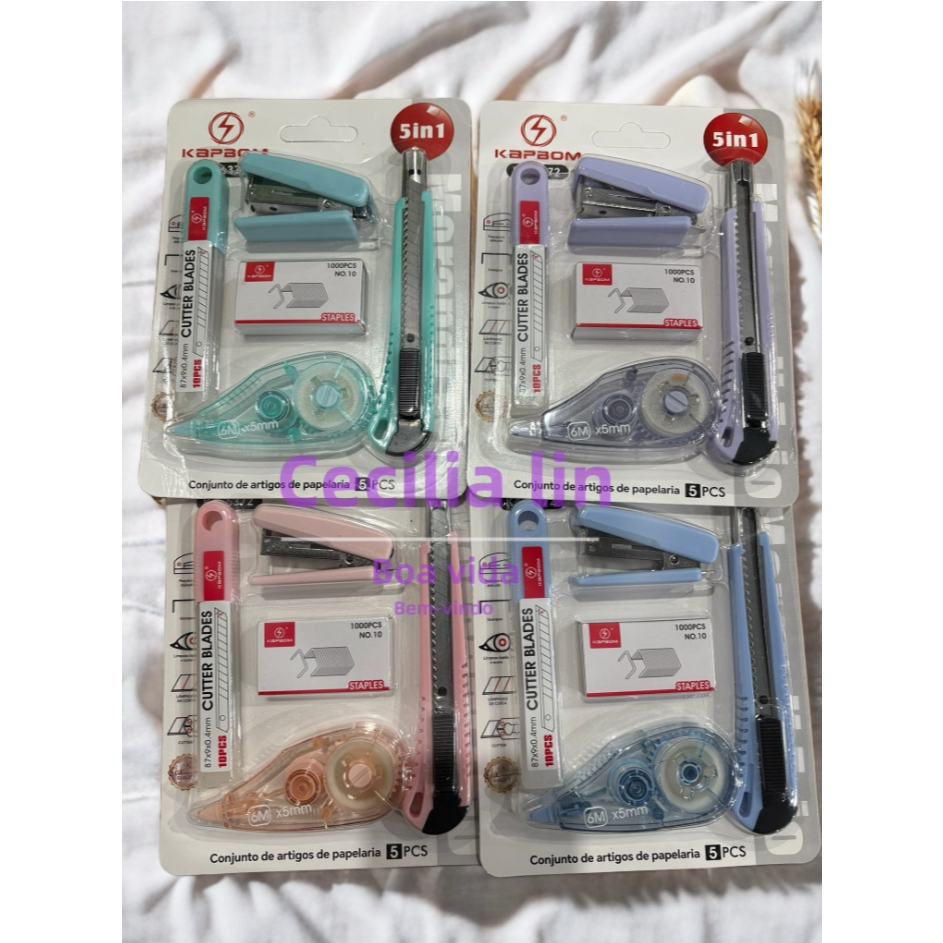 O kit de papelaria inclui cortador, grampeador e fita corretiva para escritórios escolares