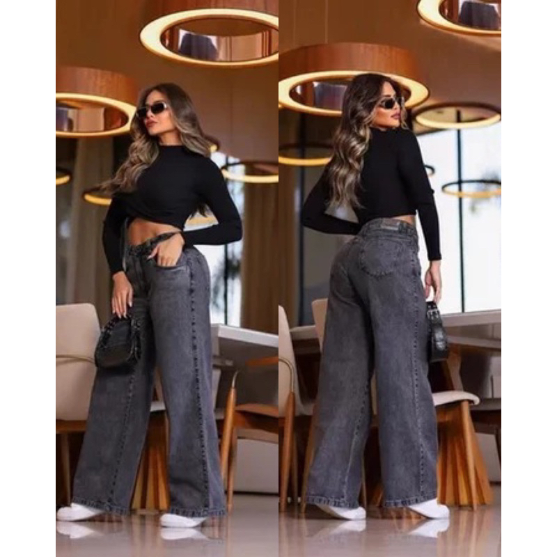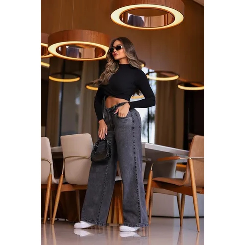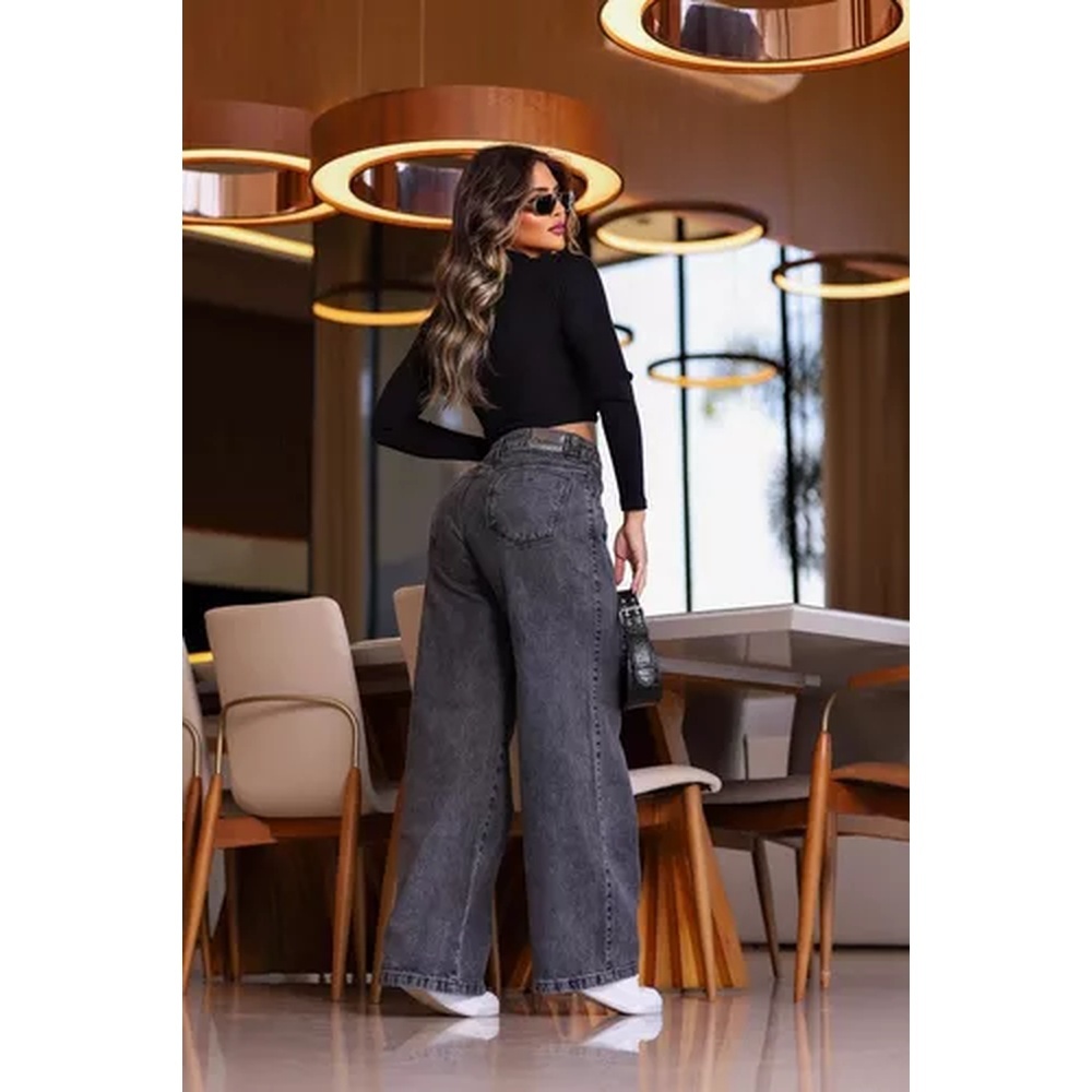 Calça Jeans Feminina Wide Leg Cinza Escuro 100% Algodão Cintura Alta Reta Estilo Pantalona