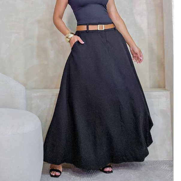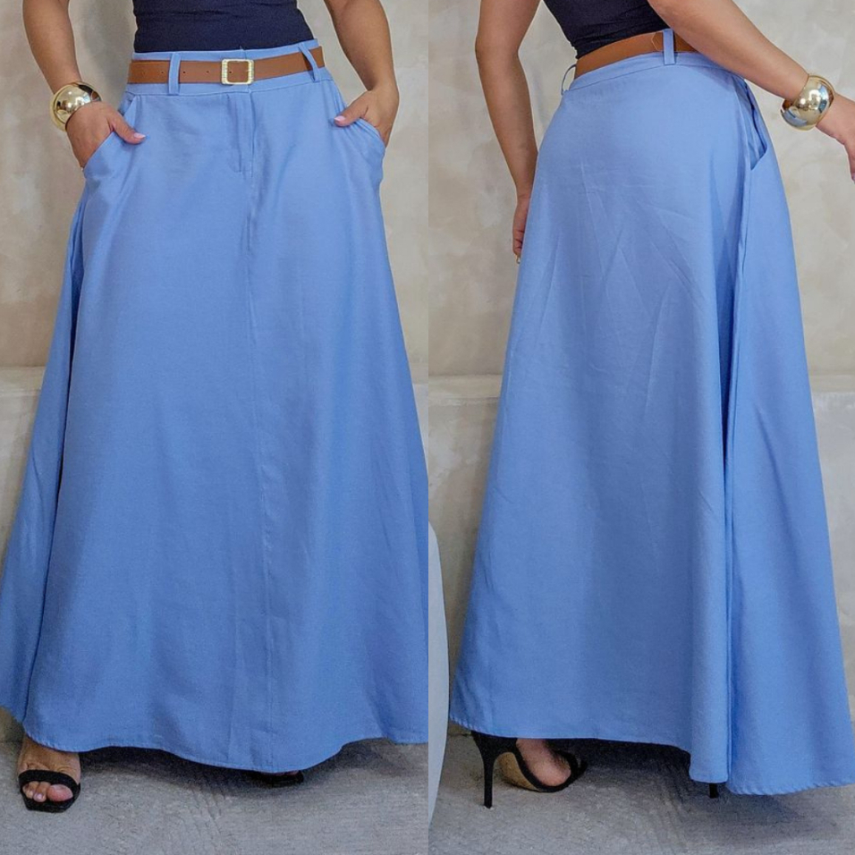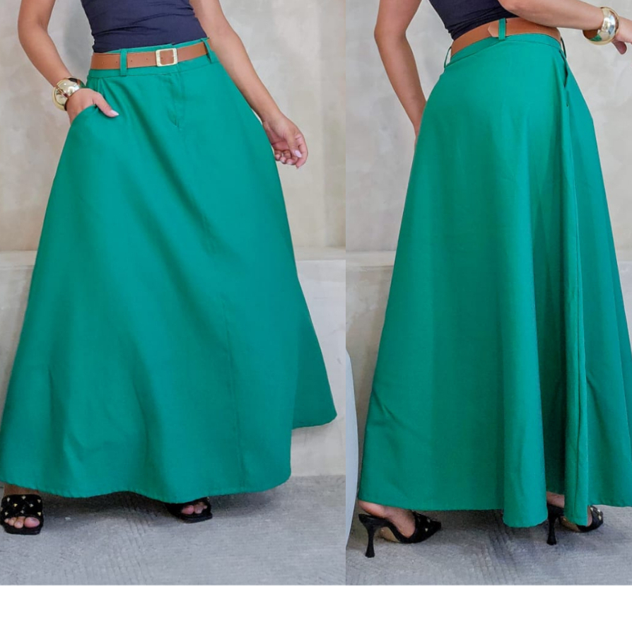 Saia Longa Feminina Godê Cintura Alta com Cinto Elegante Moda Social