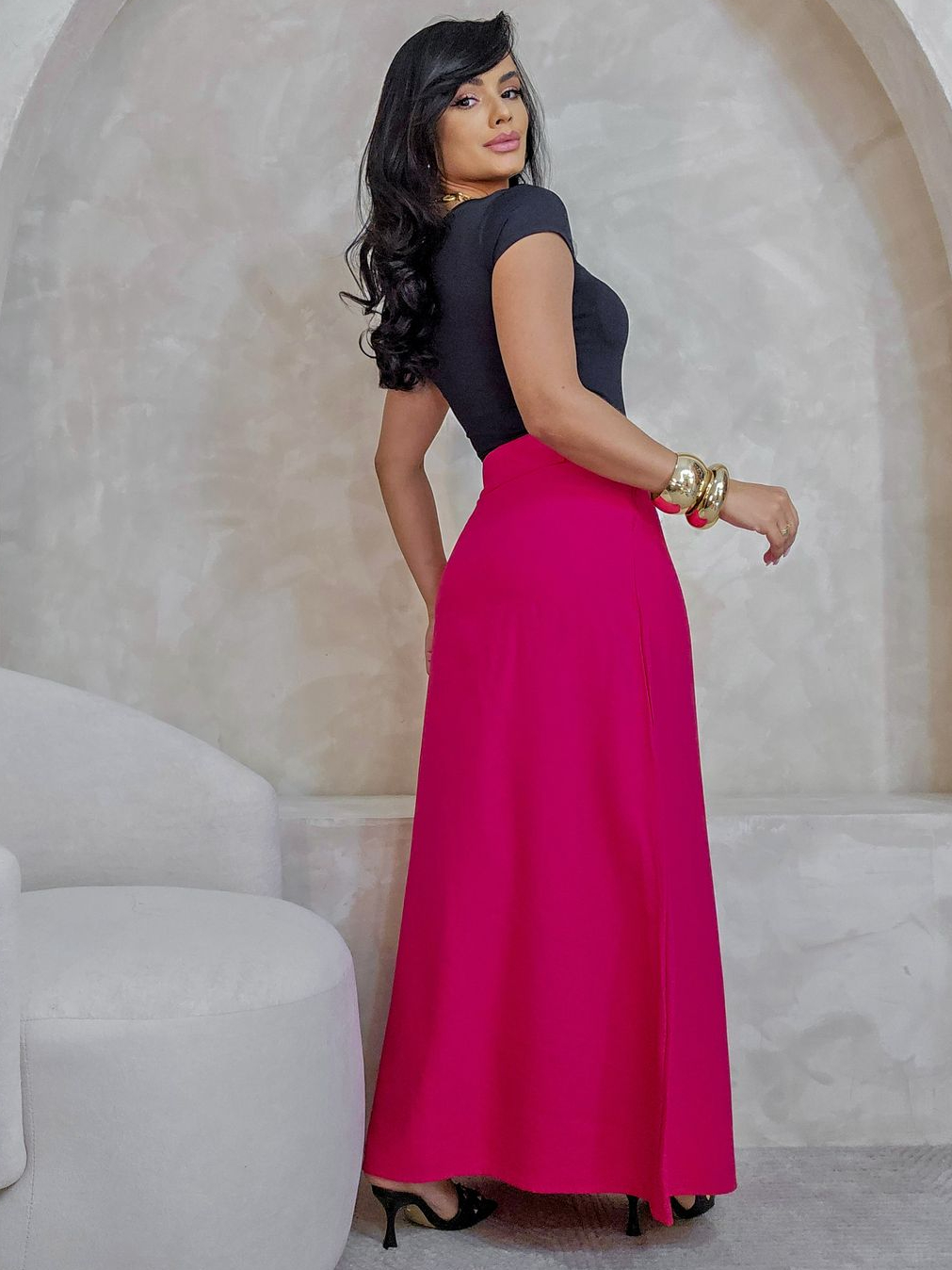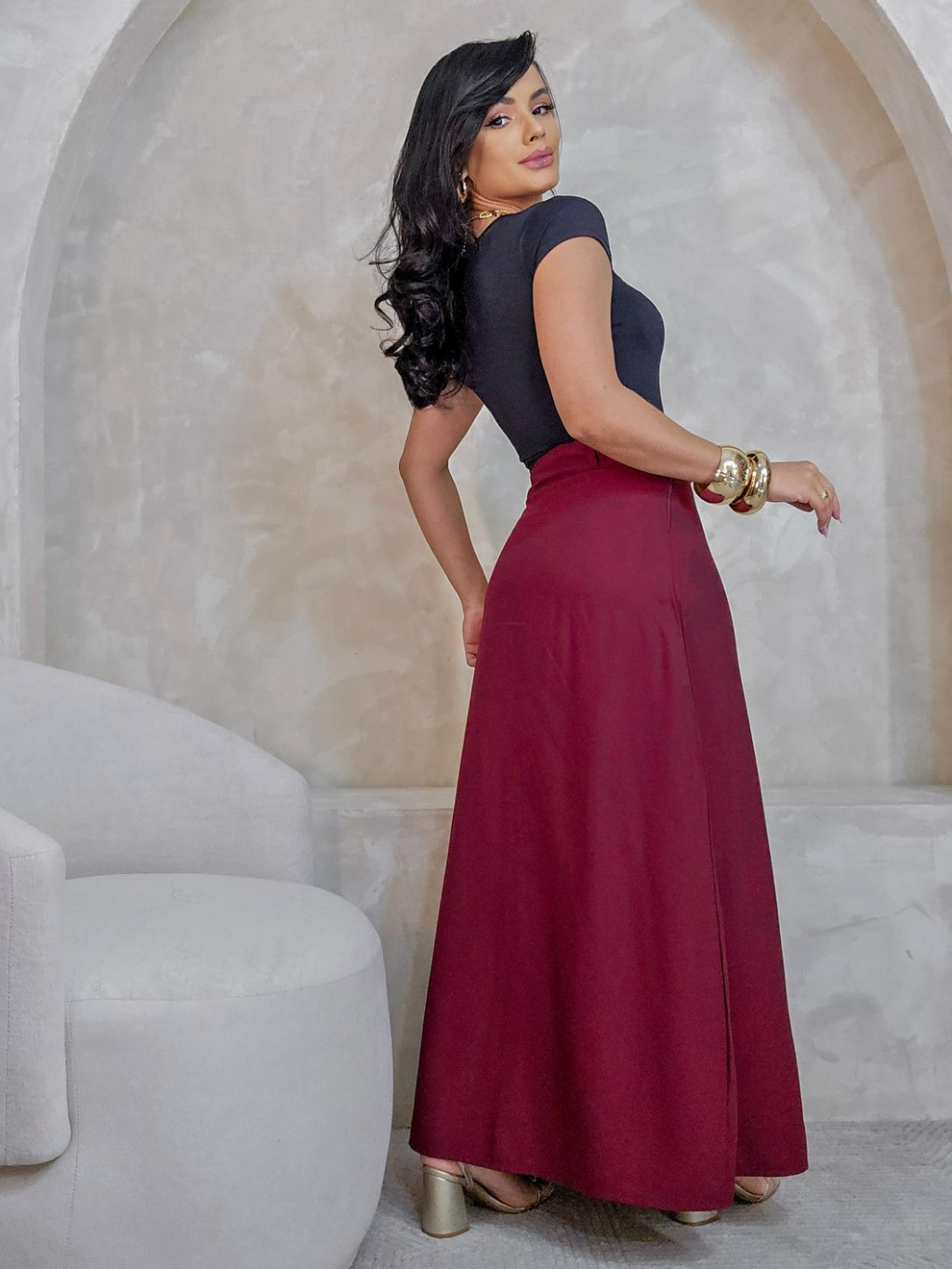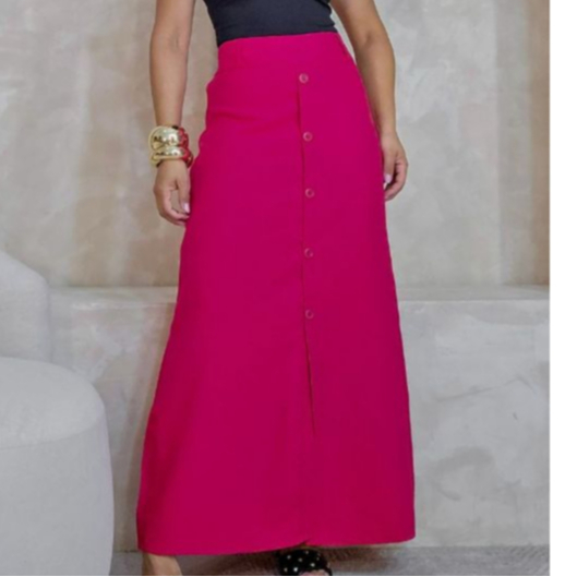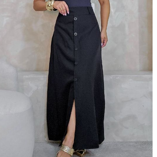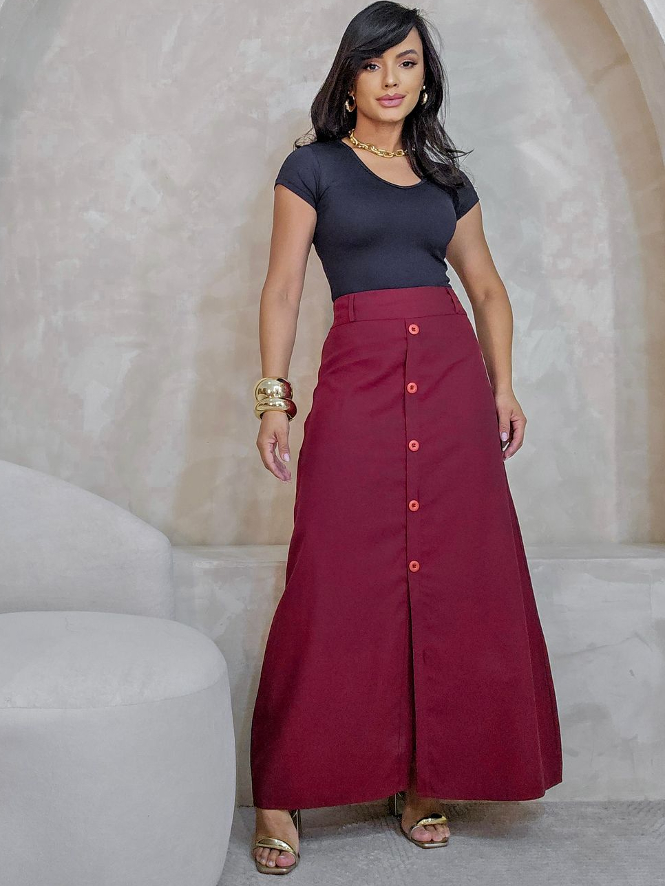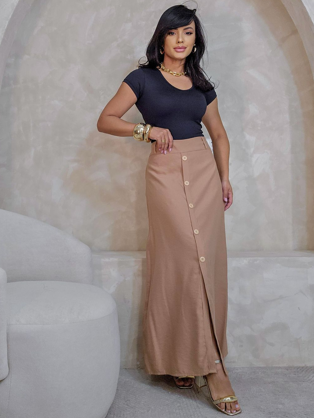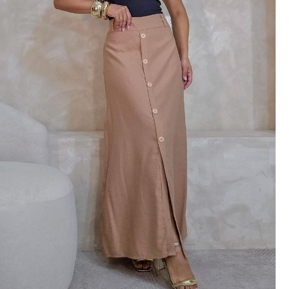 Saia Longuete Botoes Linho Elegante Feminina Tradicional Moda Cristã Alfaiataria