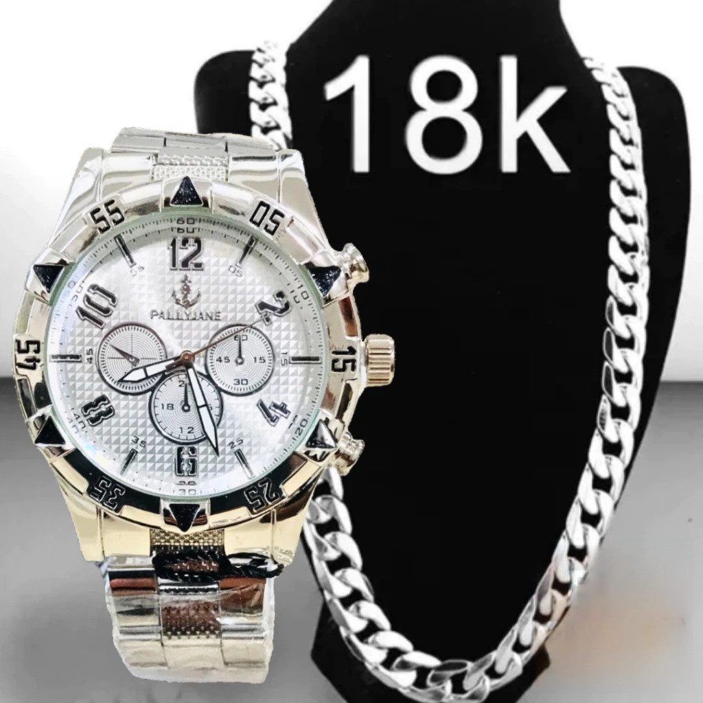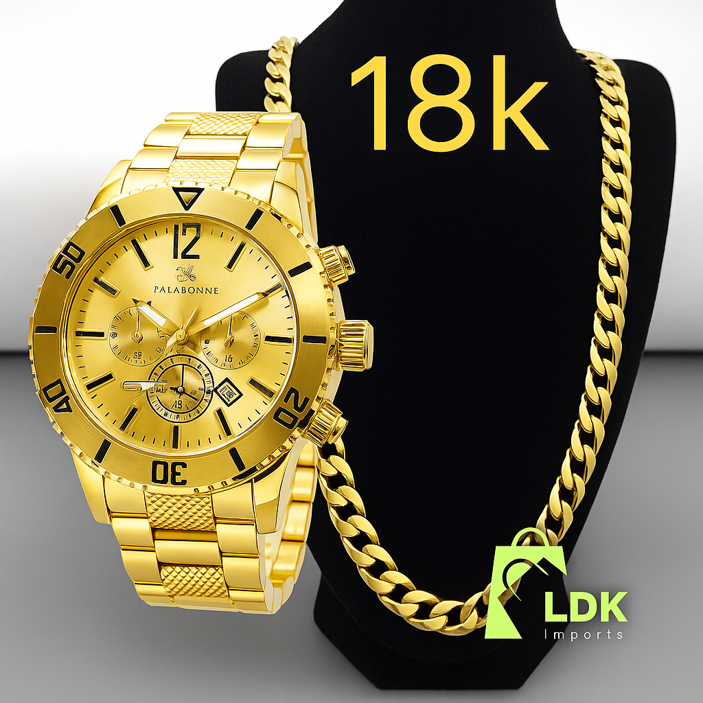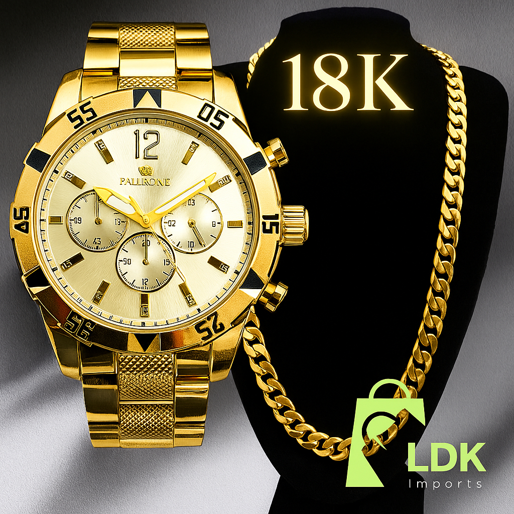 Relógio Masculino Prata Dourado Banhado 18k + Corrente Grossa 18K