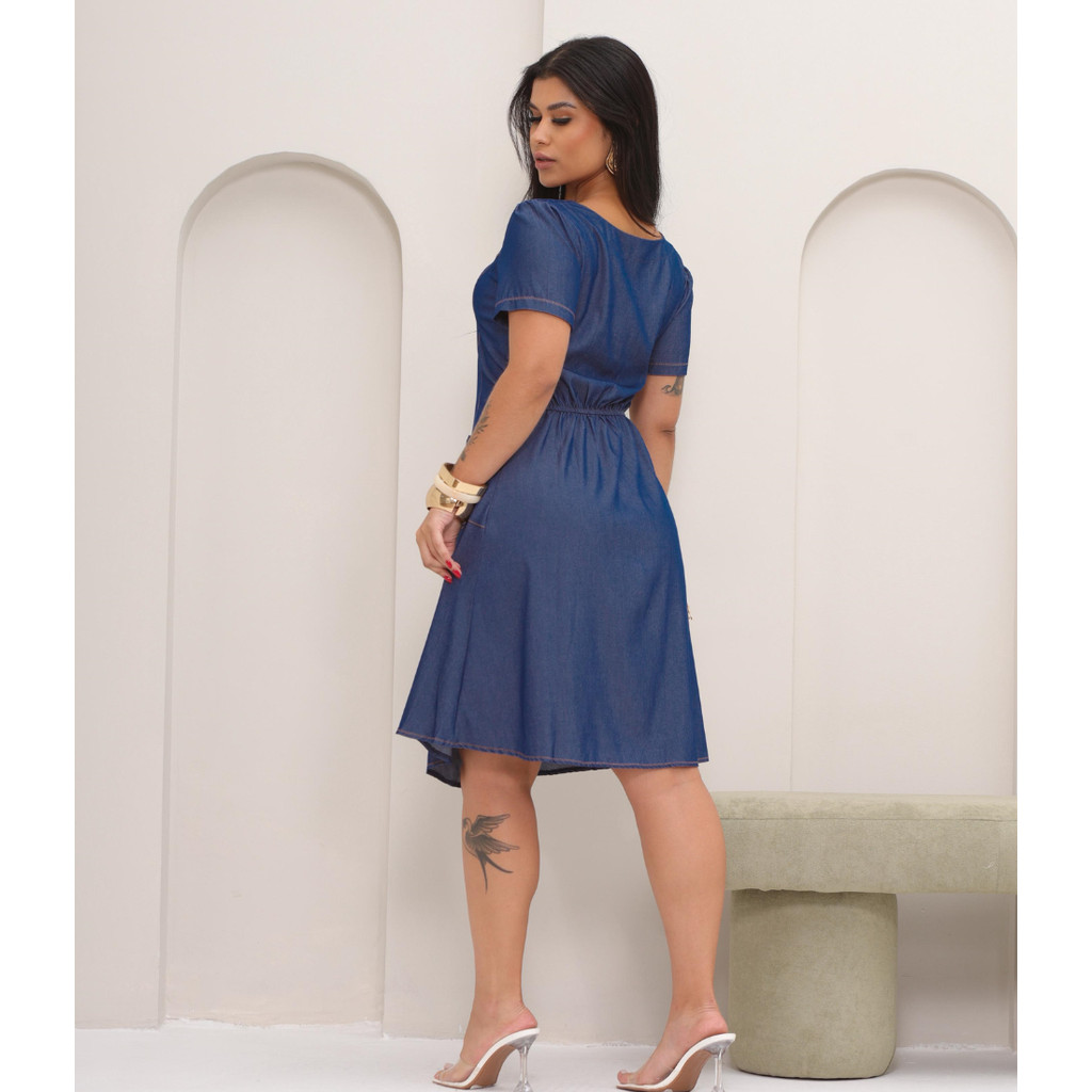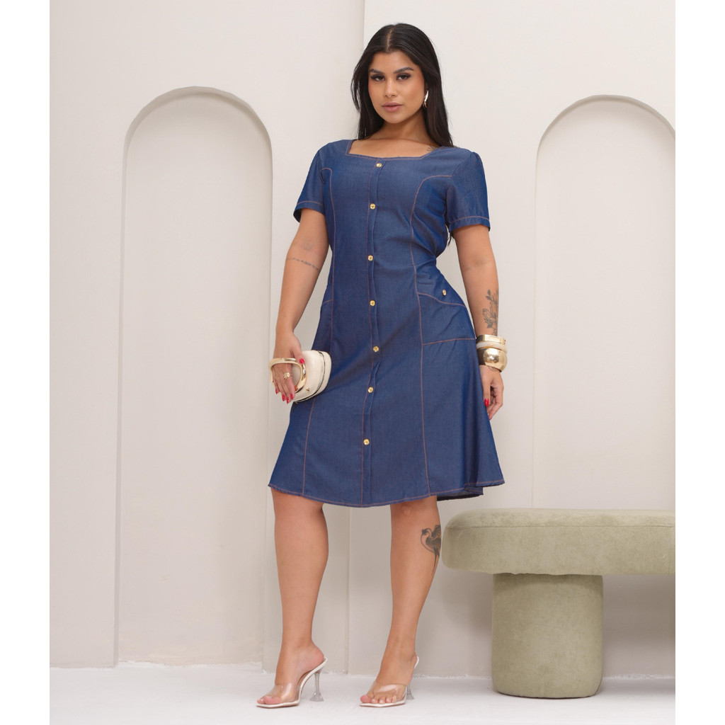 Vestido Midi Feminino Jeans Botões e Bolsos Moda Evangélica feito do tegido chambray