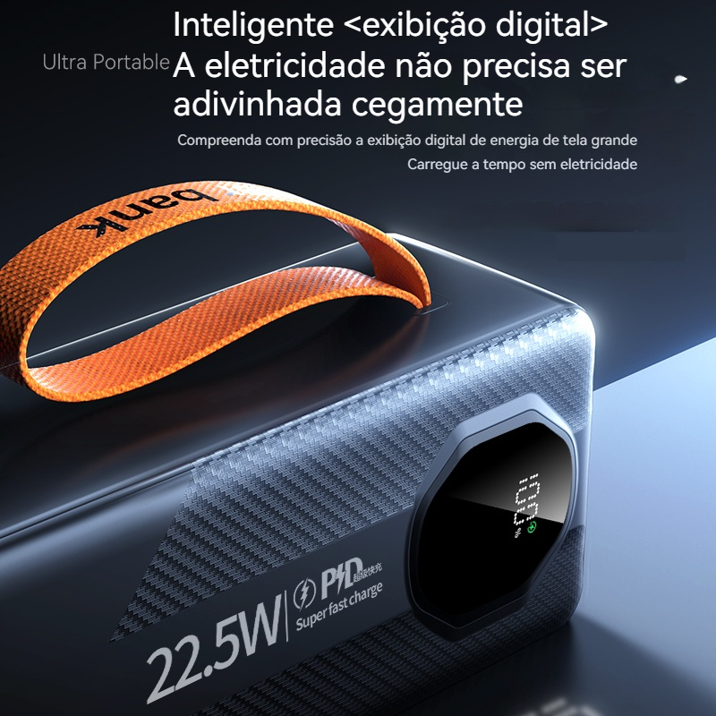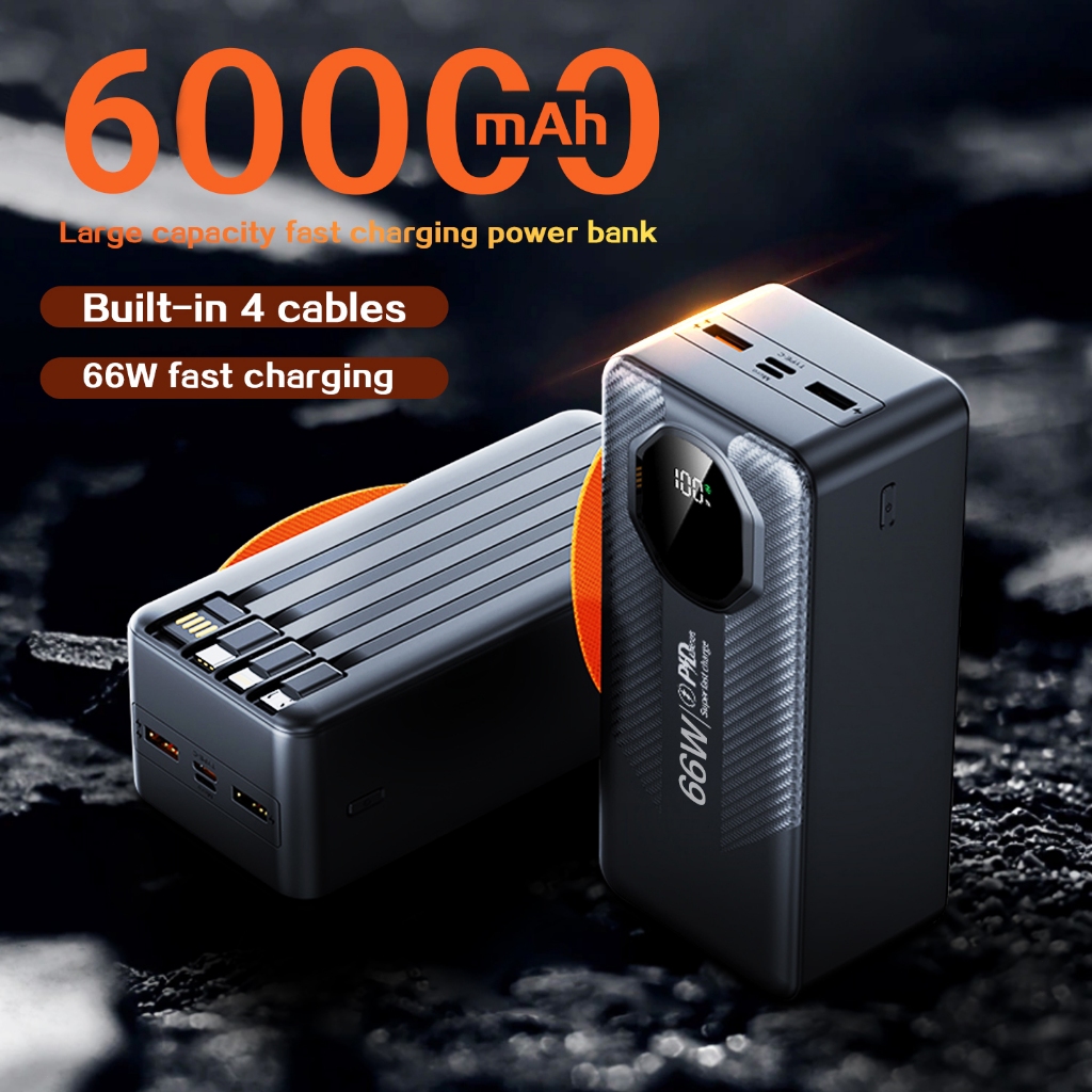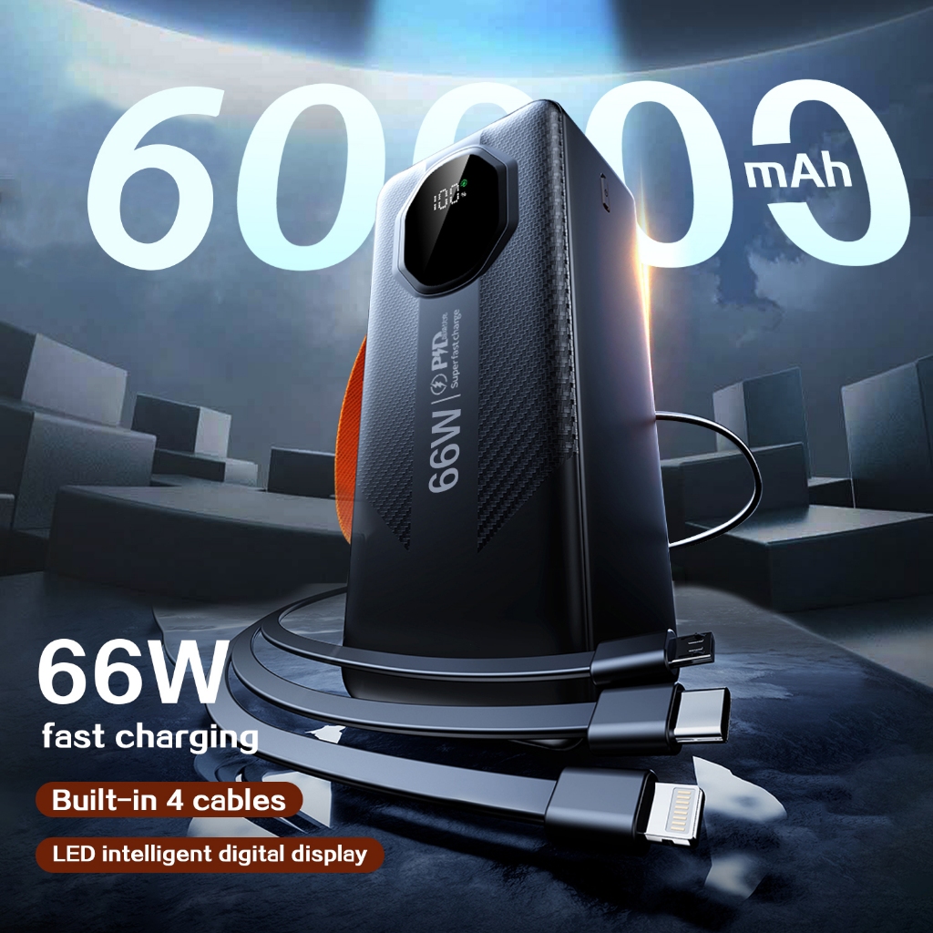 Novo 60000mAh Turbo 66W PD Powerbank de grande capacidade com carregamento ultra-rápido e cabo integrado para iOS/Androd