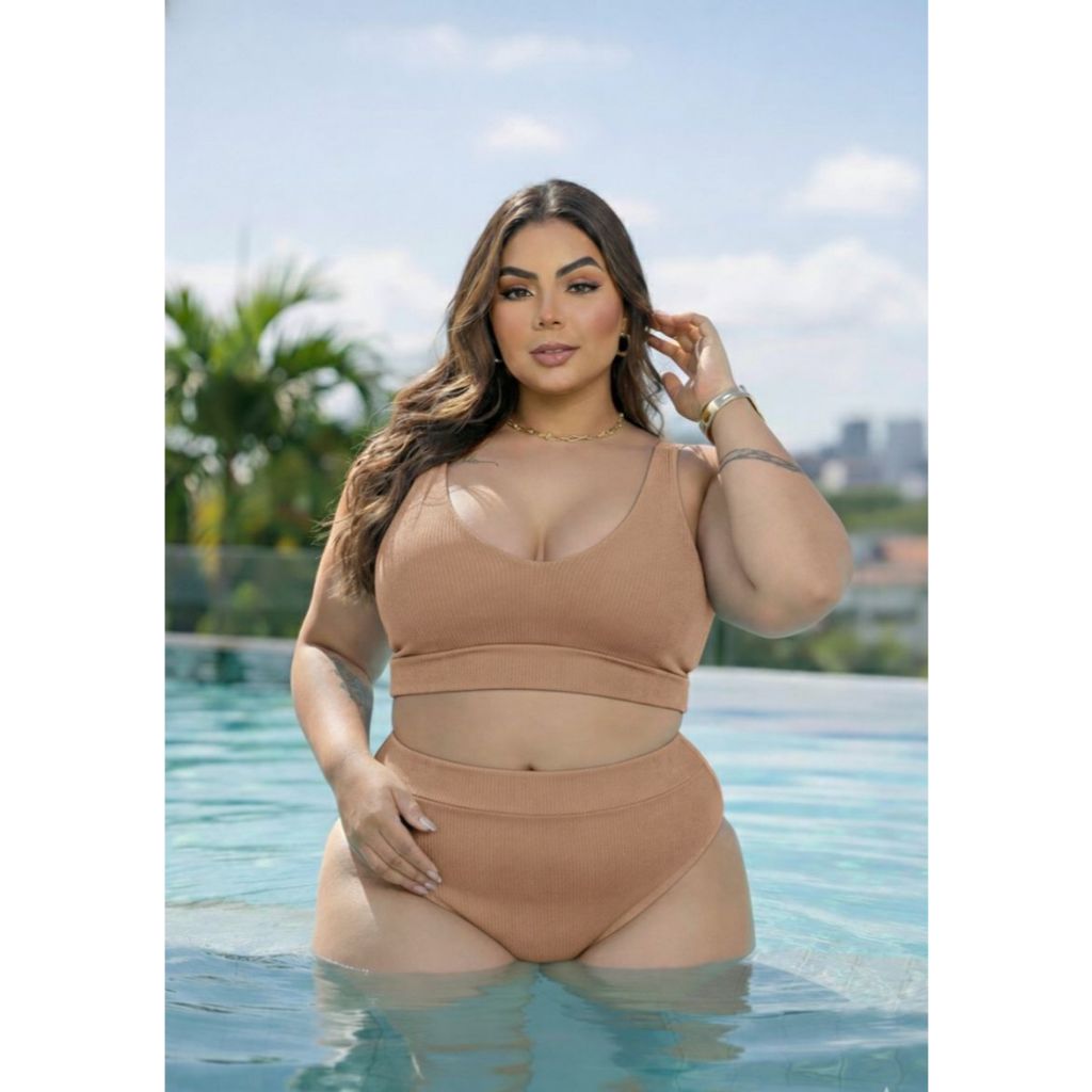 Conjunto Biquini no ribana com brilho hot pant PLUS SIZE feminino carnaval bojo decotado cropped