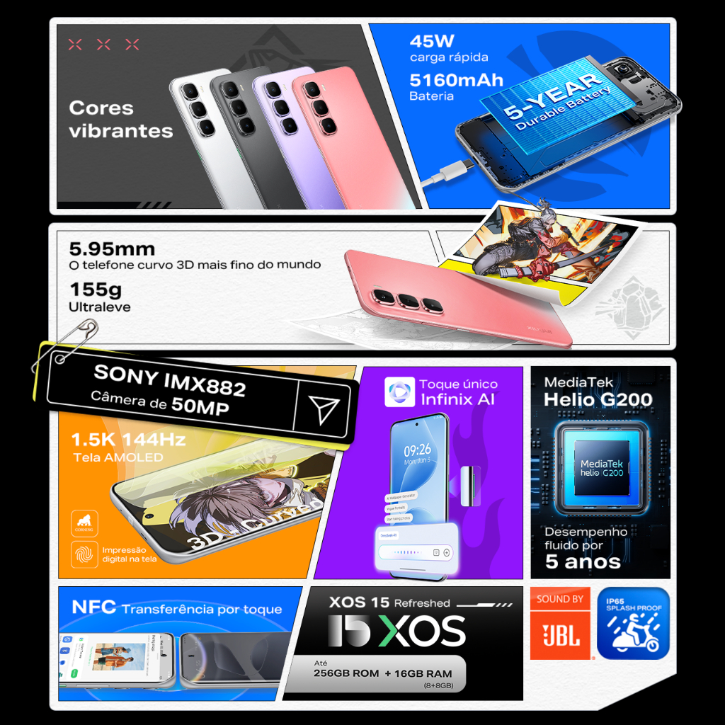 Infinix Hot 60 Pro+ Al Phone mais fino do mundo 5,95mm 16 GB+256GB tela curva 3D de144 Hz bateria de 45W+516 mAh NFC