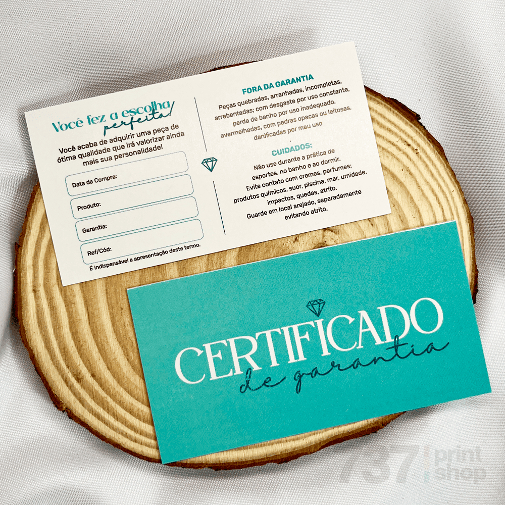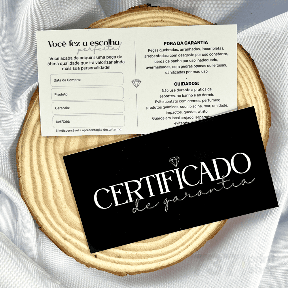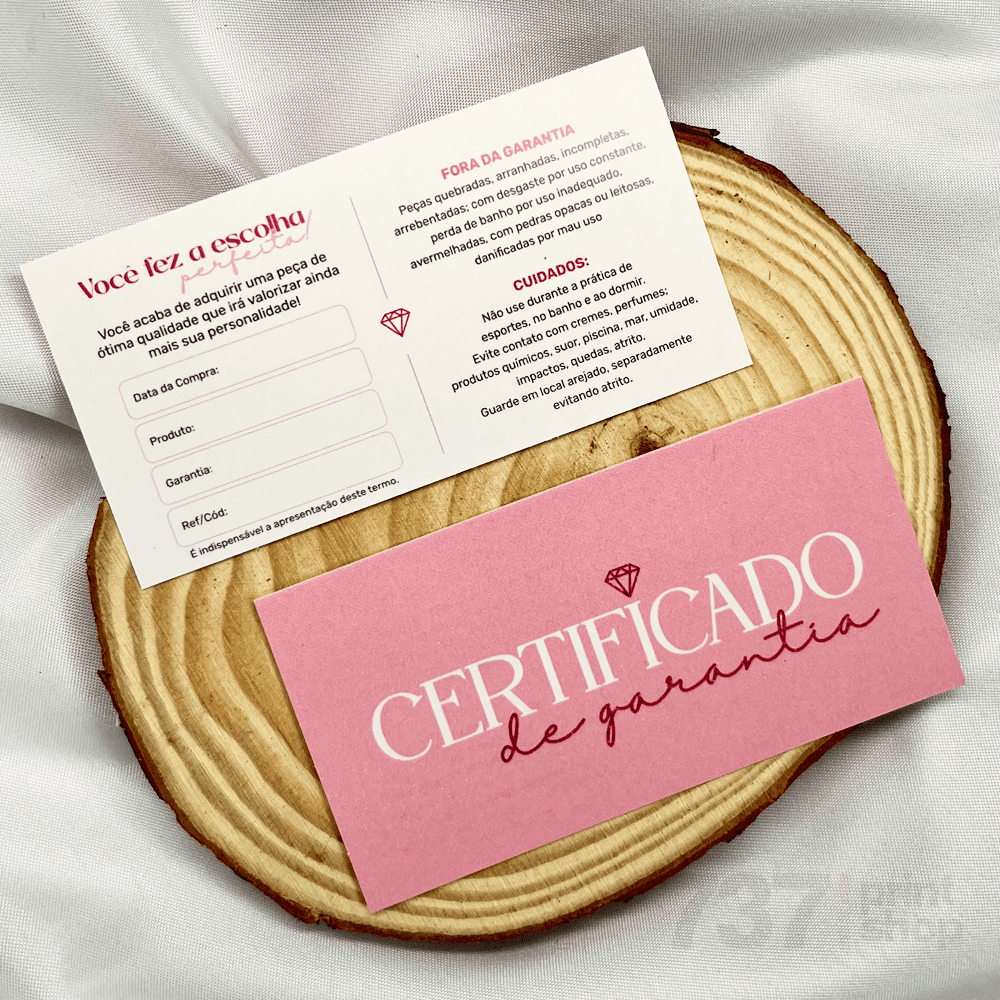 Cartão Certificado de Garantia e Cuidados 9x5cm para Acessórios Semijoias - Pronta Entrega