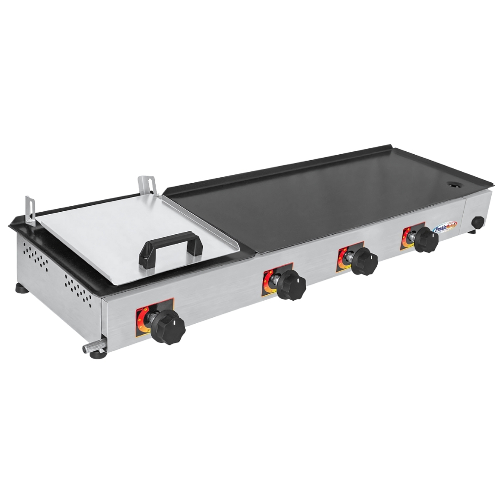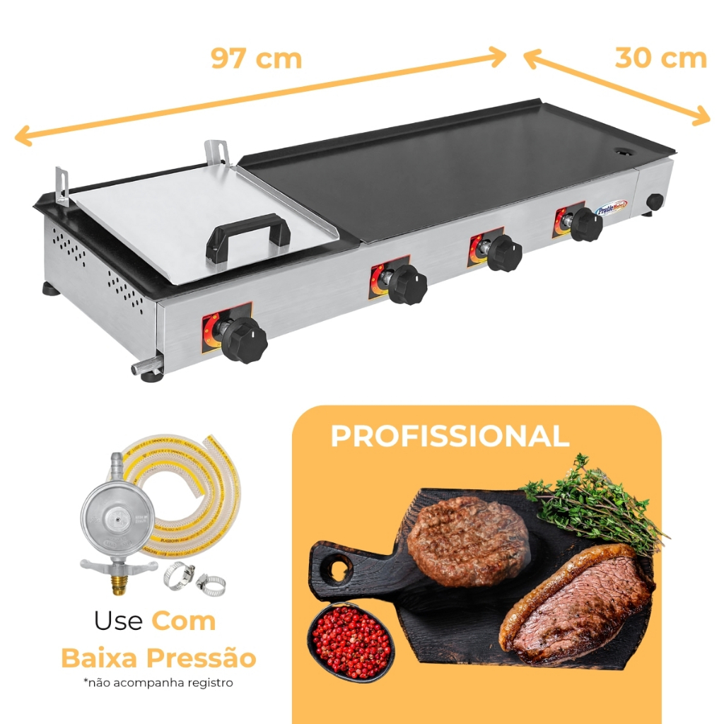 Chapa de Hamburguer Profissional A Gas 97x30 cm Com Abafador Prensa e 4 Queimadores Chapeira para Lanches Porções Pratic