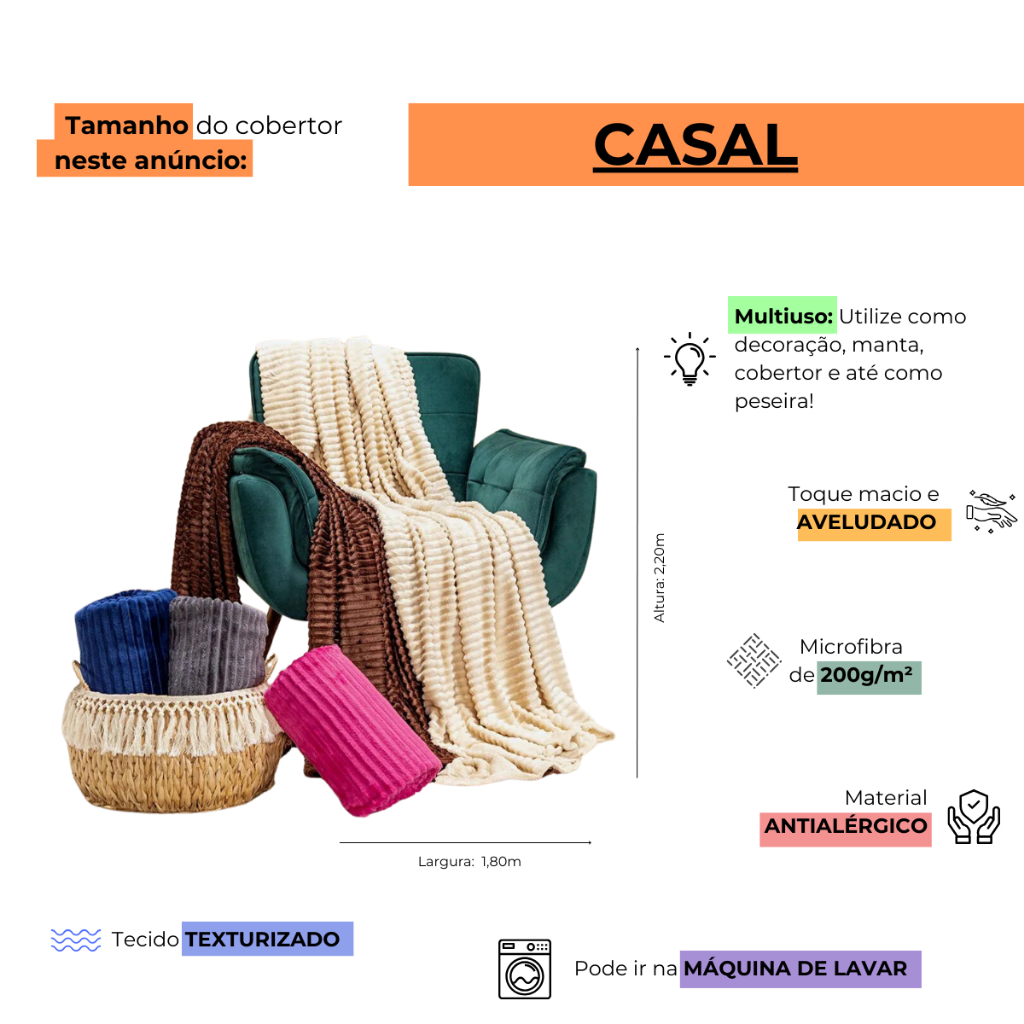 Cobertor Manta Canelada Casal Super Macia 1,80m x 2,20m Antialérgico
