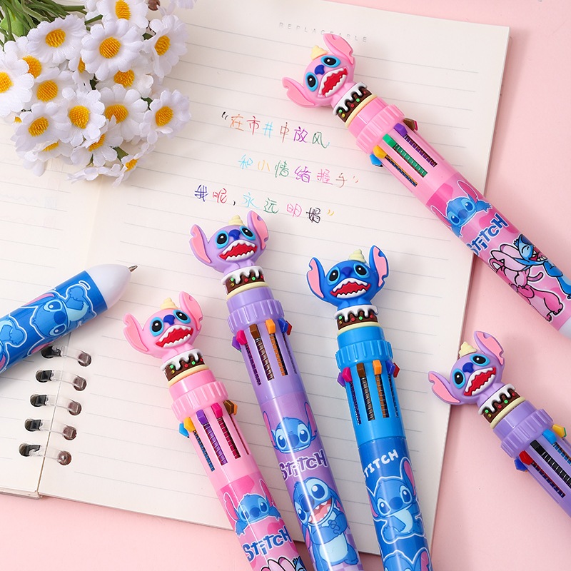 Ki de 3/6/9/12 Peças Caneta Esferográfica de Dez Cores com Desenho Stitch 10 Cores